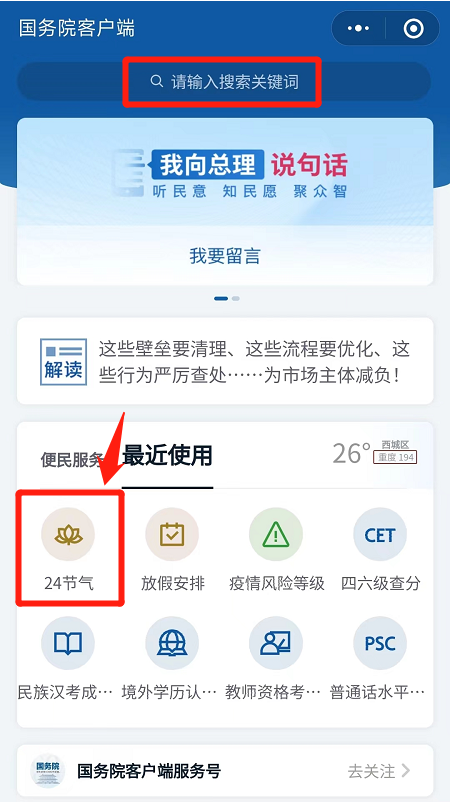 在国务院客户端小程序主页“搜索关键词”一栏,搜索“节气”,即可找到二十四节气小程序。
