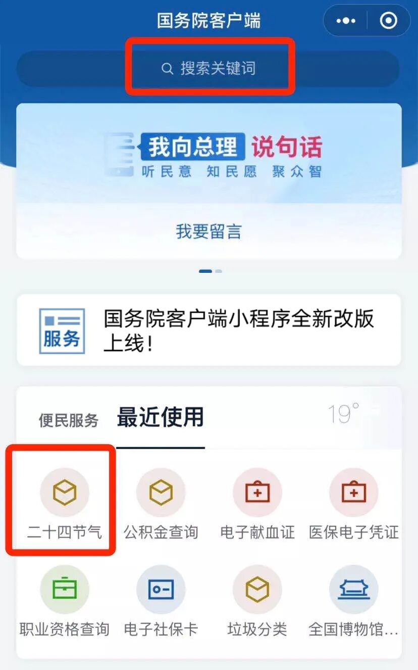 在国务院客户端小程序主页“搜索关键词”一栏,搜索“节气”,即可找到二十四节气小程序。