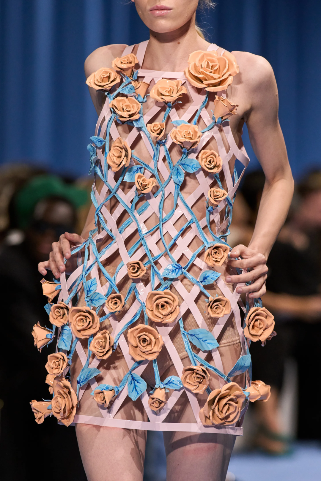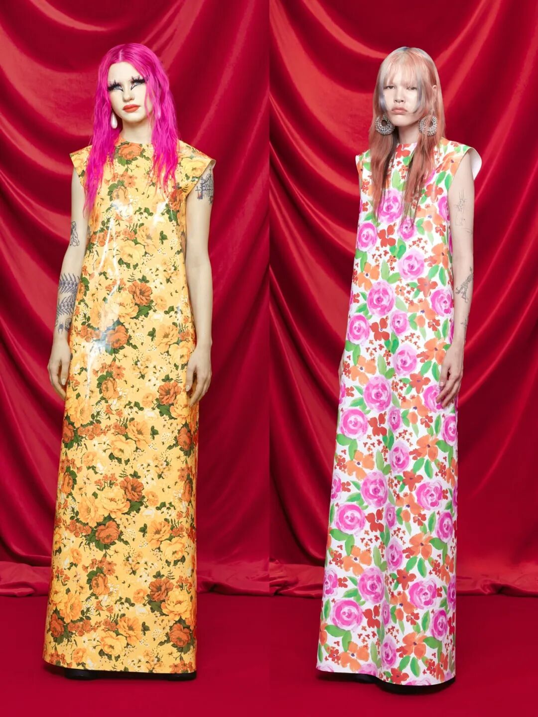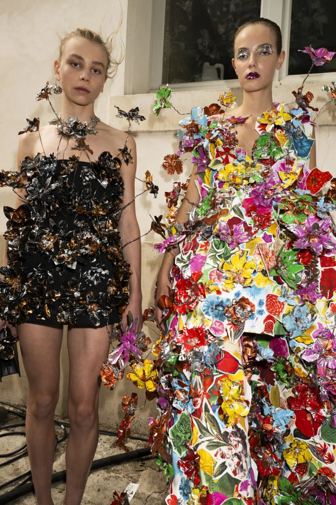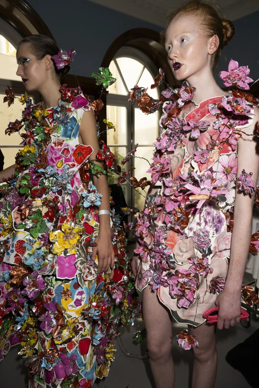 Francesco Risso 还在这个系列中放大了 Marni 的手工价值,推出了由手工剪裁花卉制成的拼贴连衣裙、外套,由数十个锡罐组装而成的 3D 连衣裙等。