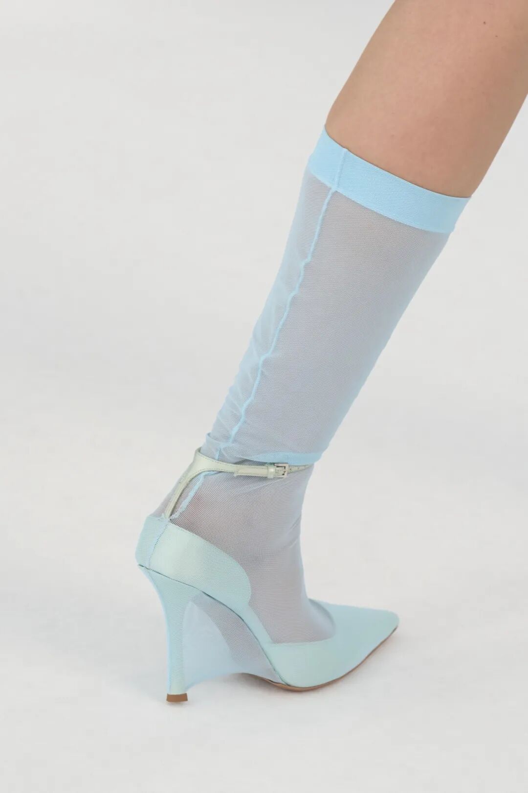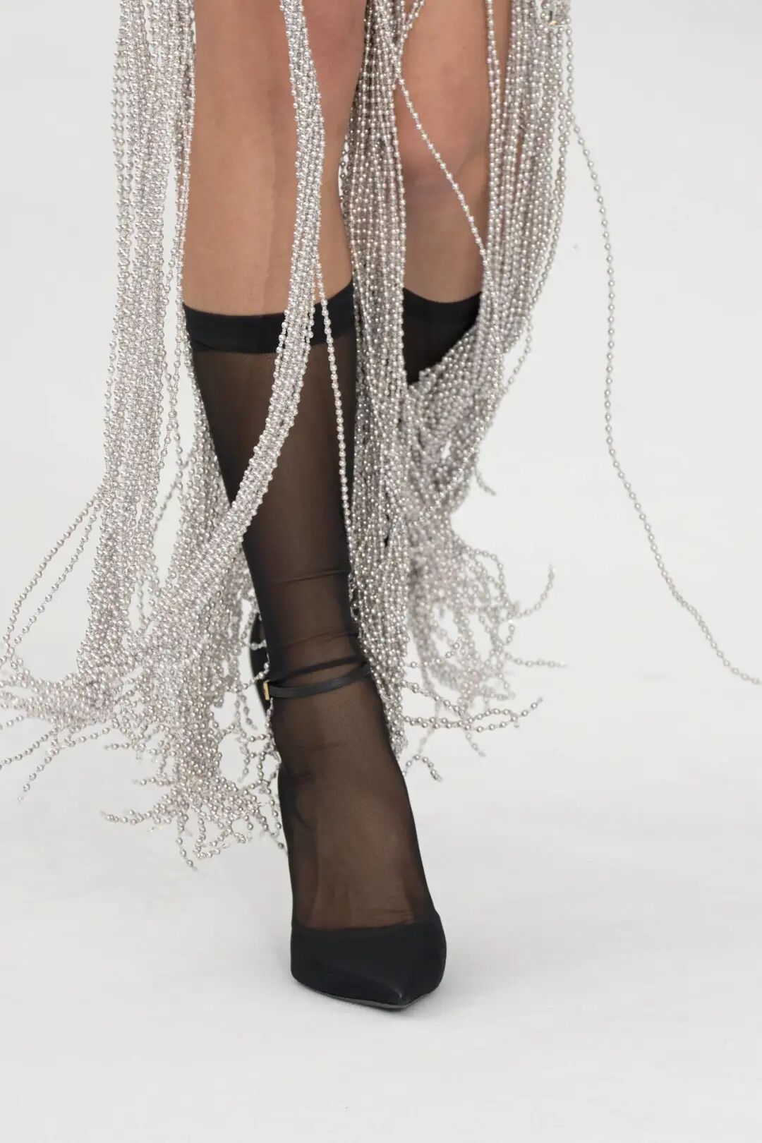 配饰方面,推出了全新网纱高跟鞋,鞋跟与鞋底有网纱连接,十分独特;经典 Voyou 手袋也有了新变化,V 型包身设计多了点缀,搭配金属链条设计,为优雅的服装增加了个性魅力。