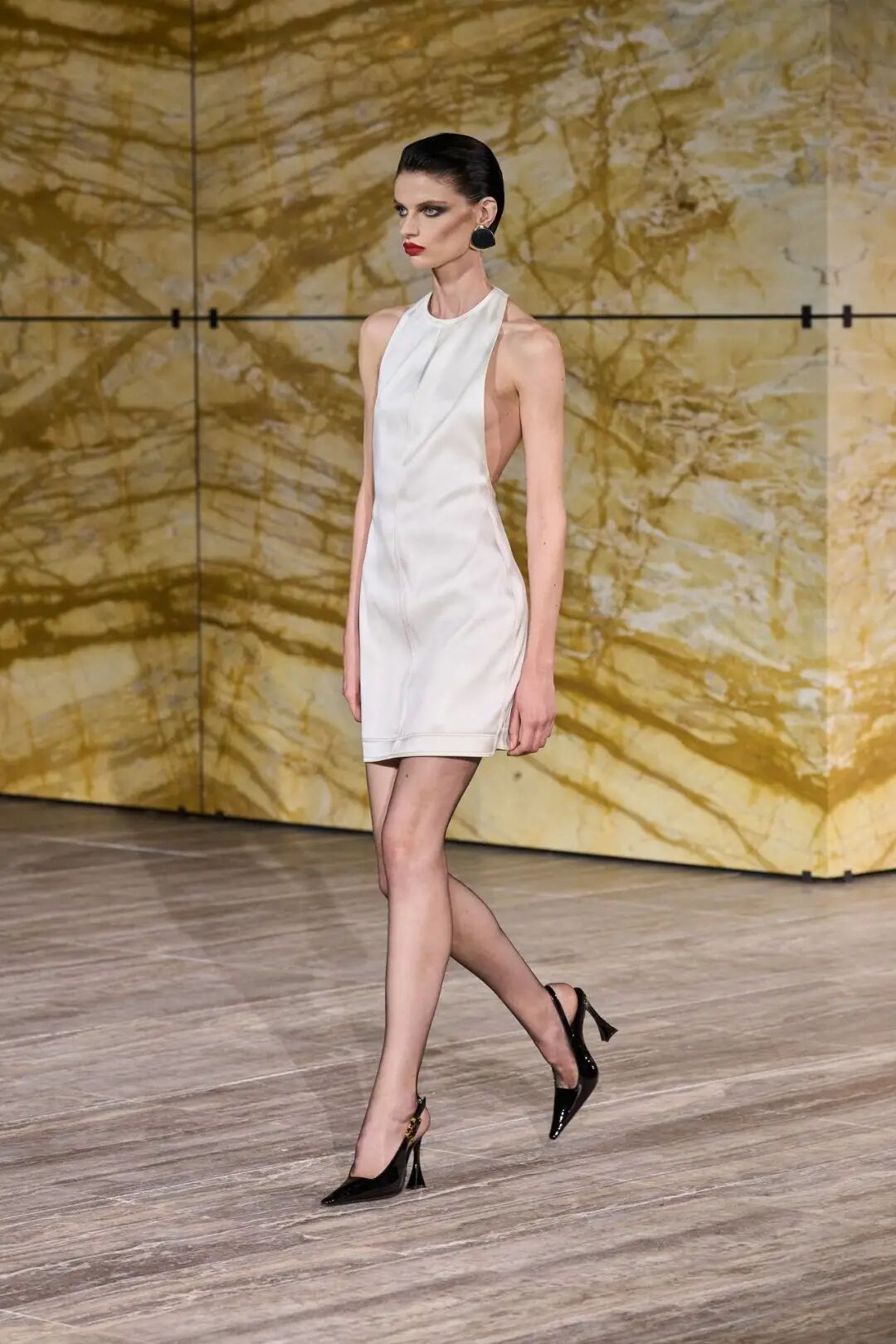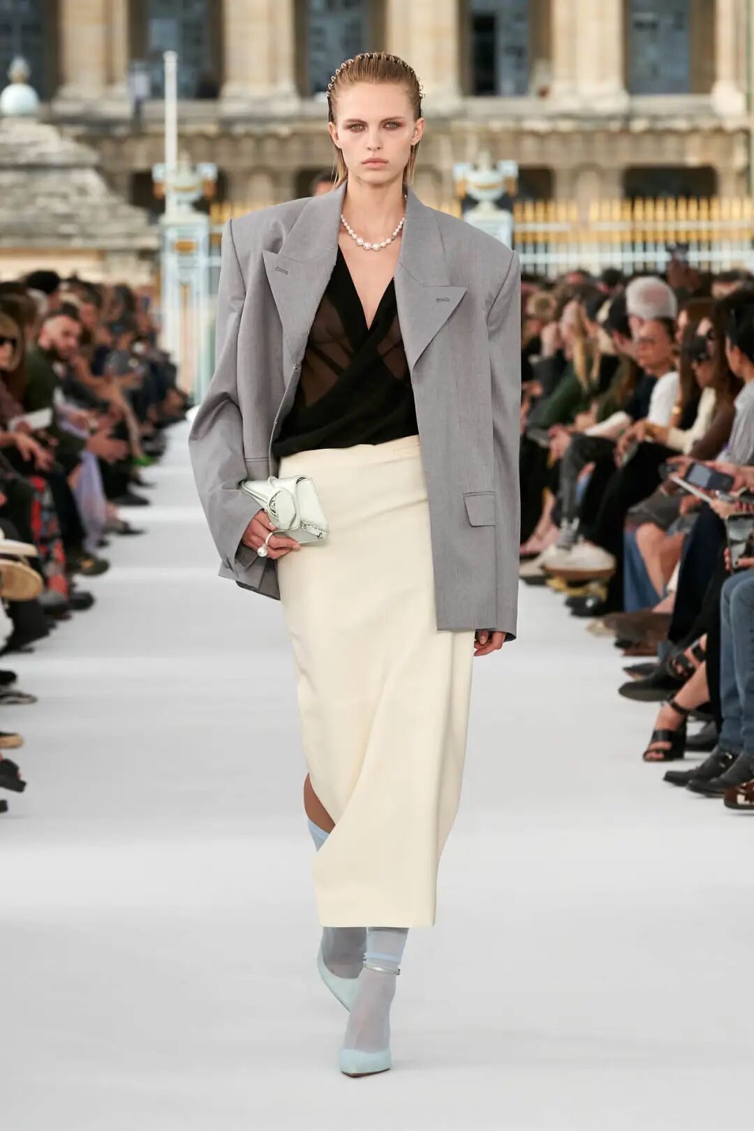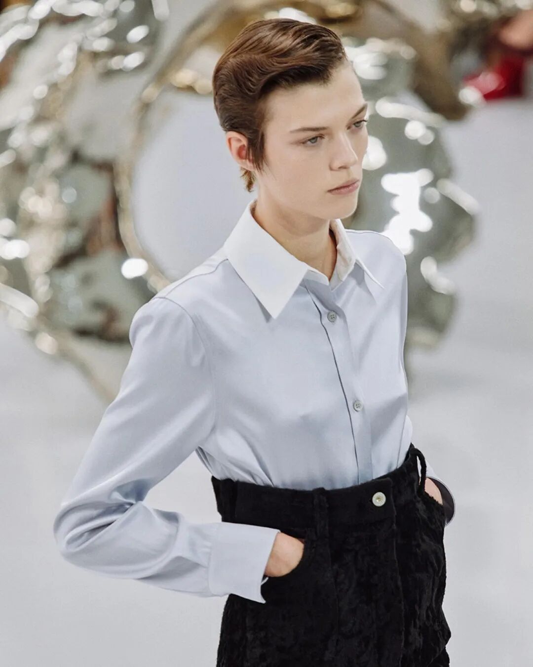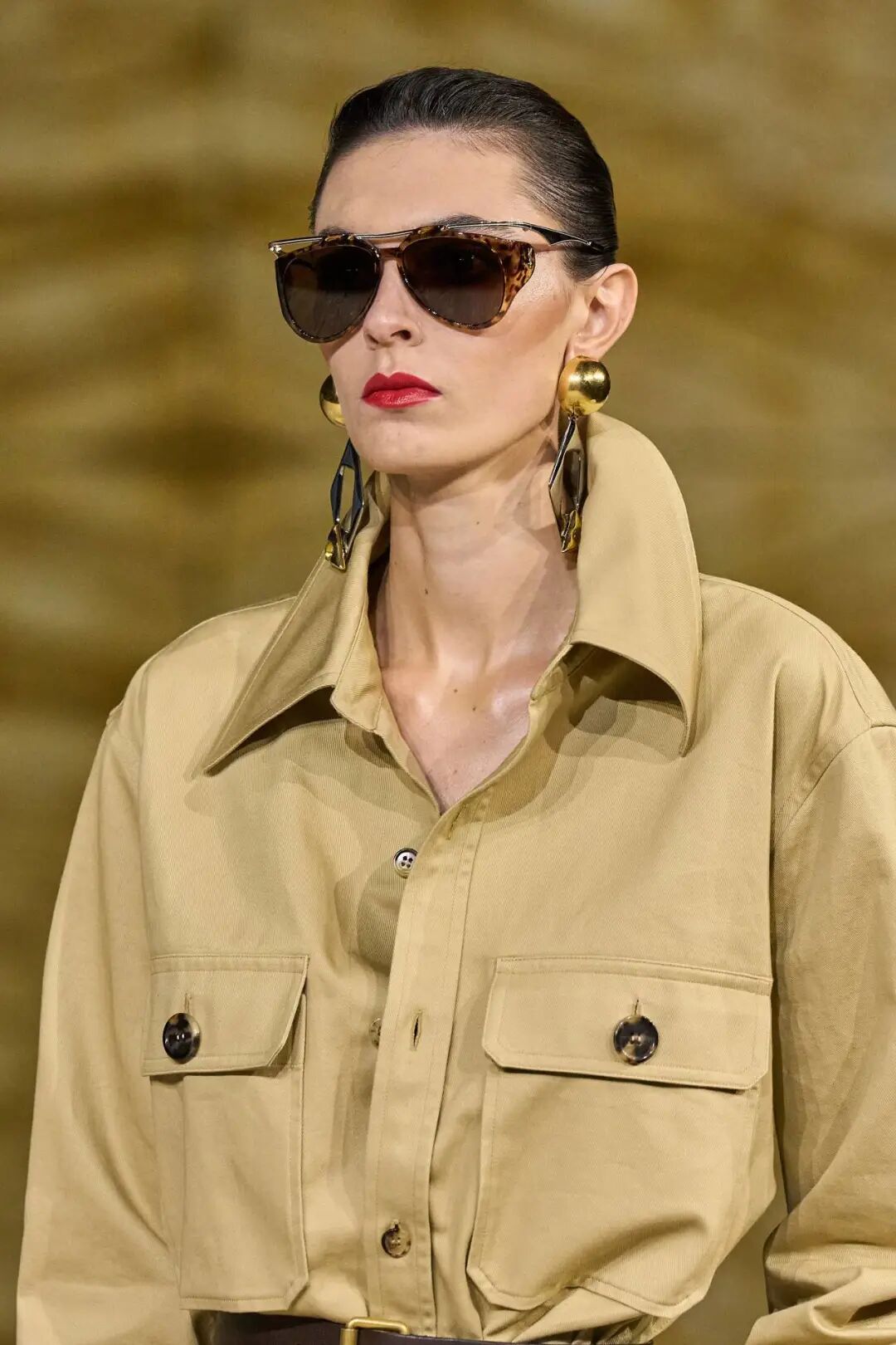 这一季创意总监 Anthony Vaccarello 一改之前轻薄略带流动性的材质,改用硬挺的棉质,不知道是不是受到 Quiet Luxury 风潮的影响。模特们梳着一丝不苟的发型,带着大体积金属耳环,充满 1980 年代风情。