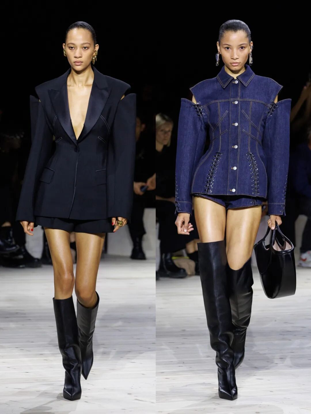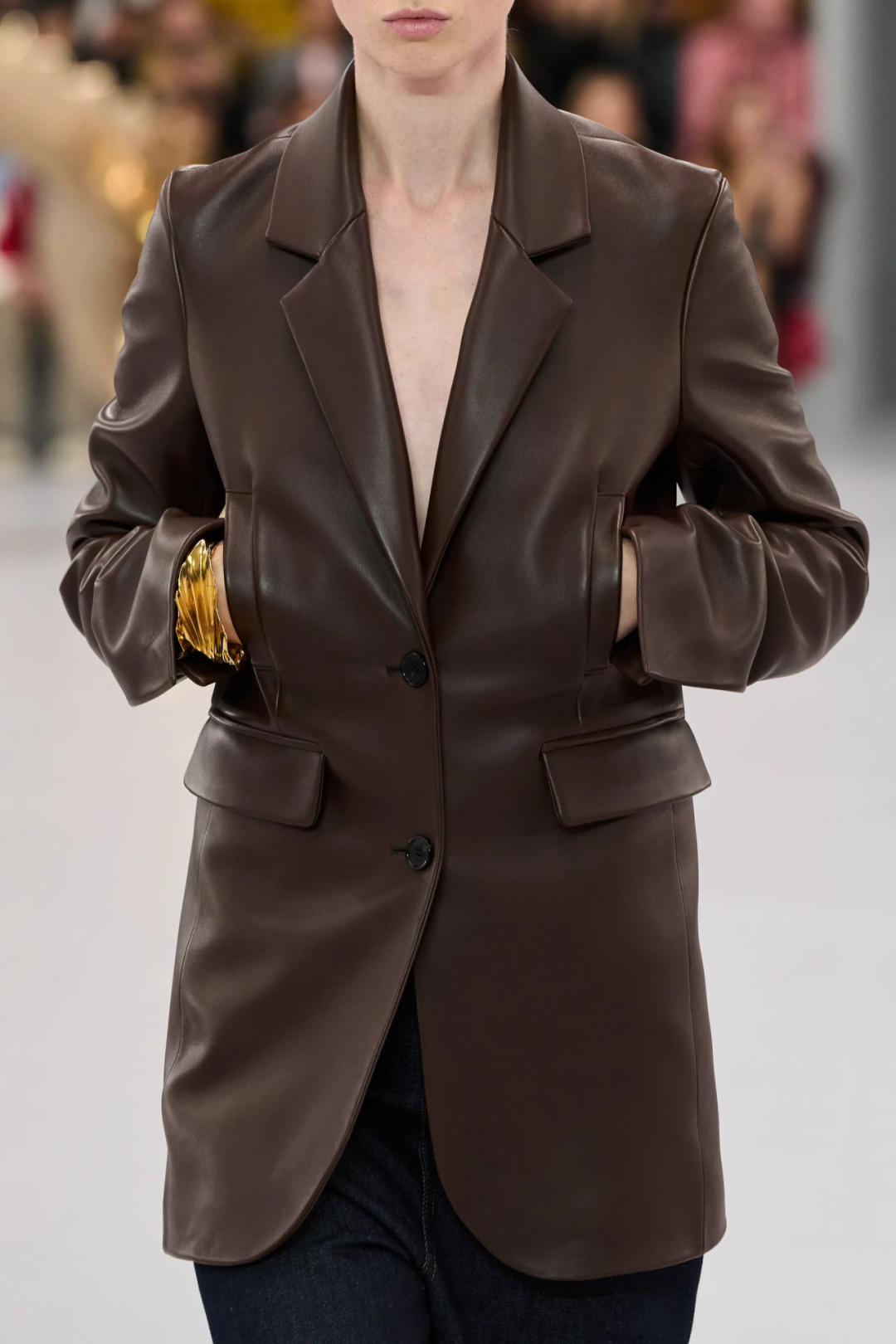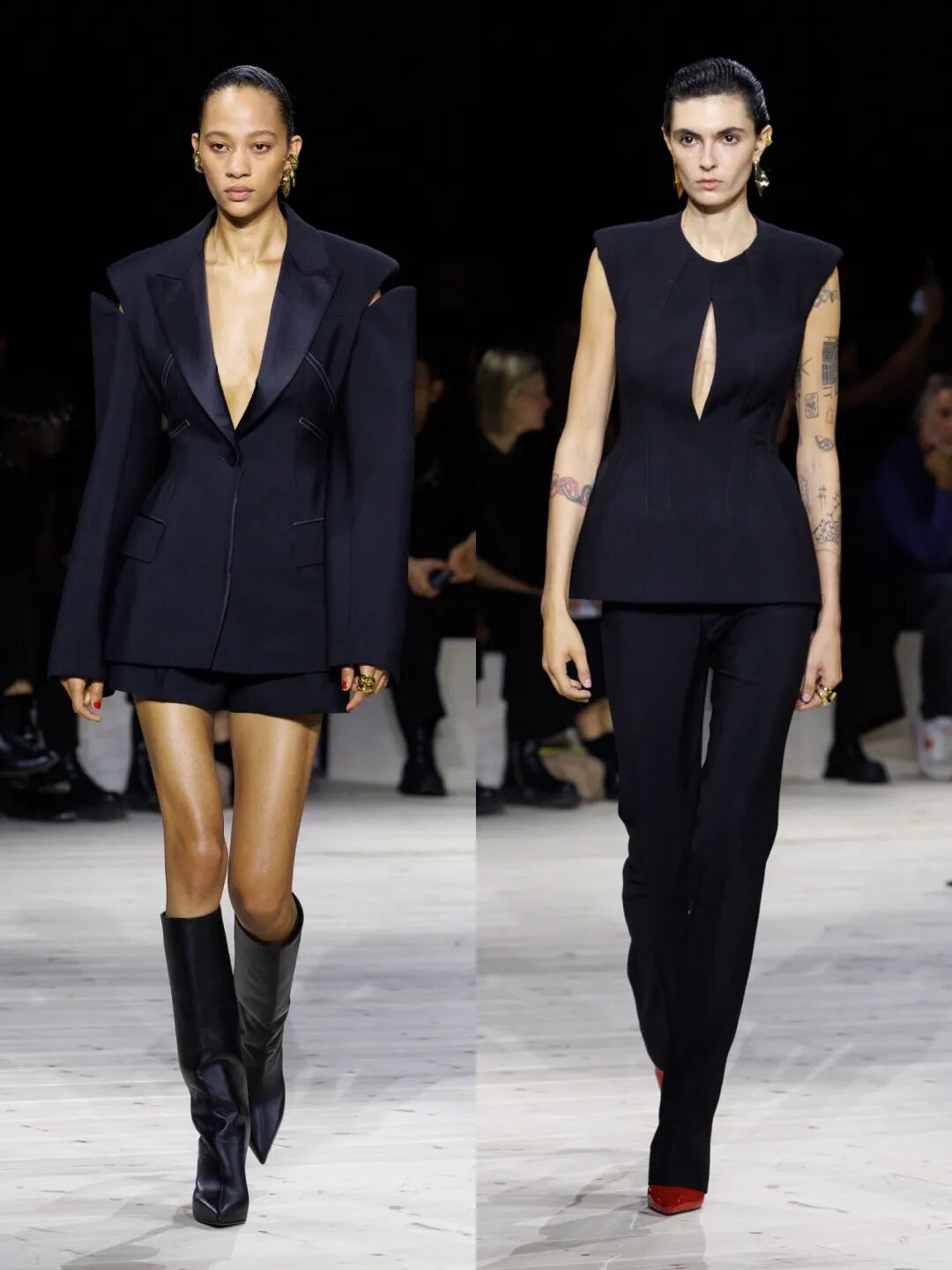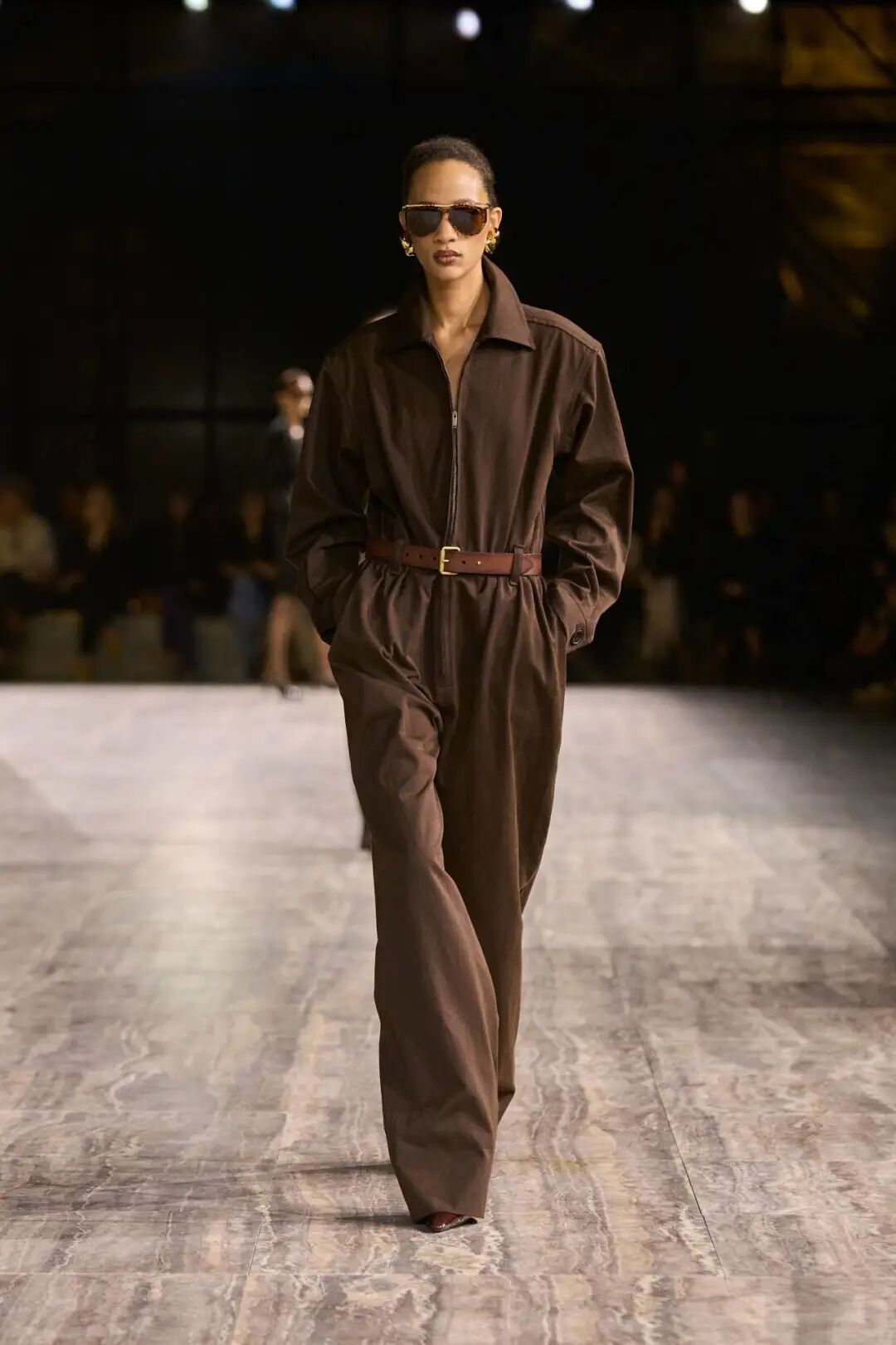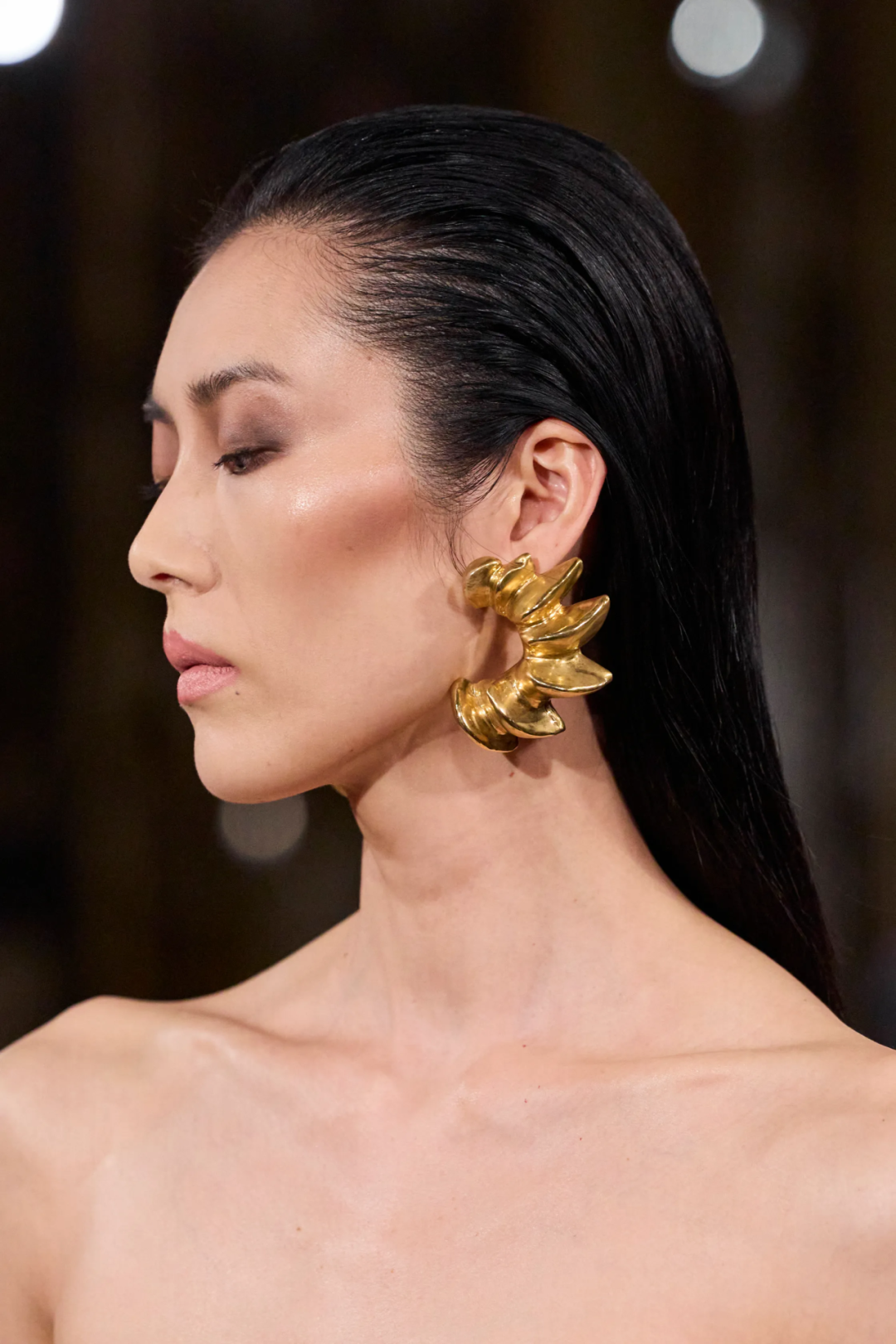 这一季创意总监 Anthony Vaccarello 一改之前轻薄略带流动性的材质,改用硬挺的棉质,不知道是不是受到 Quiet Luxury 风潮的影响。模特们梳着一丝不苟的发型,带着大体积金属耳环,充满 1980 年代风情。