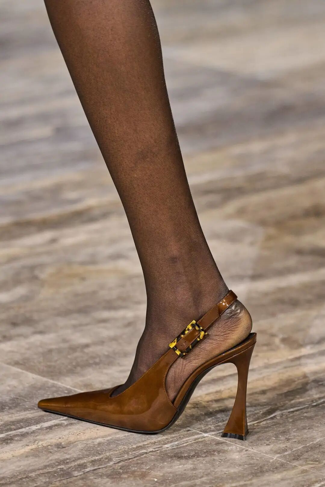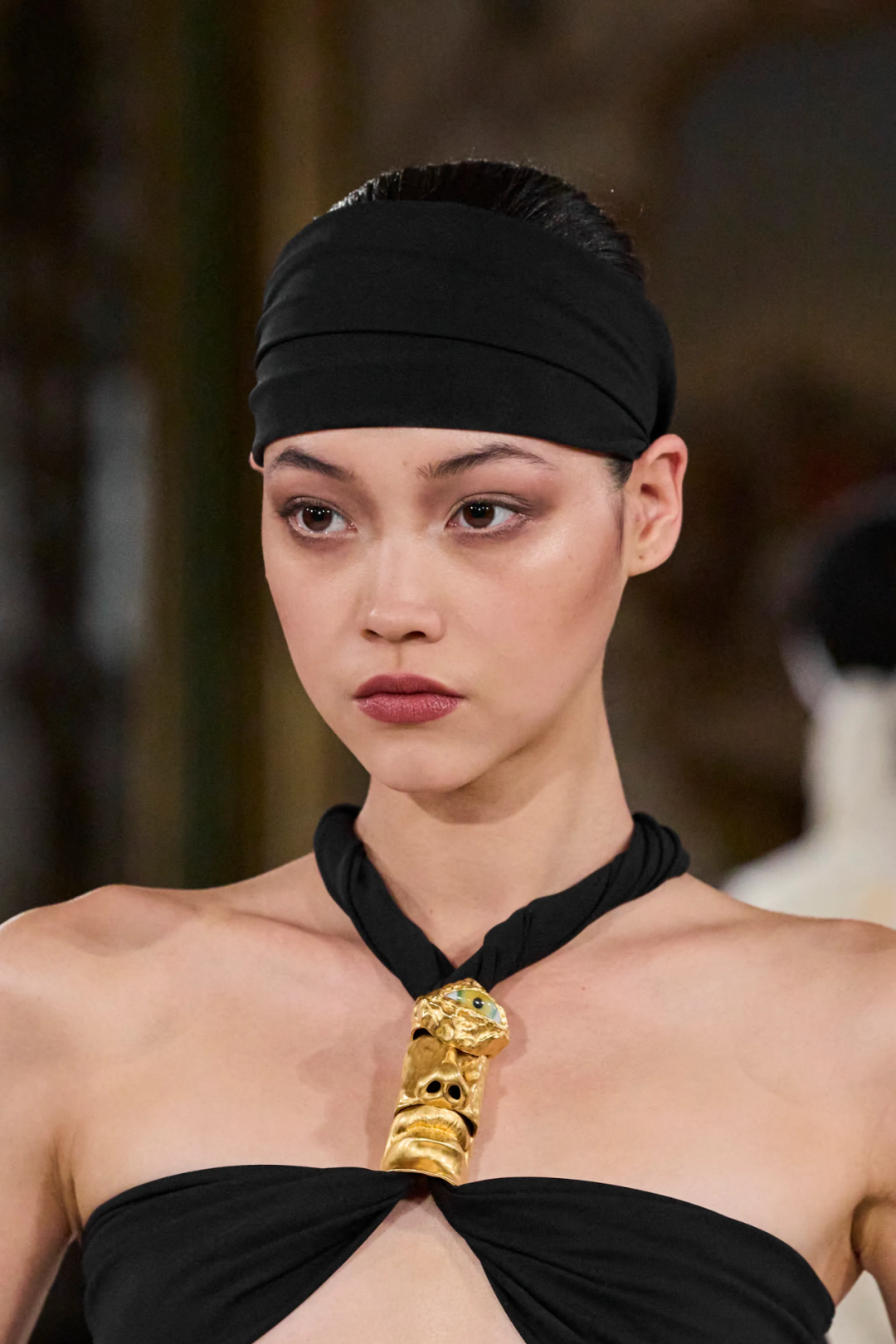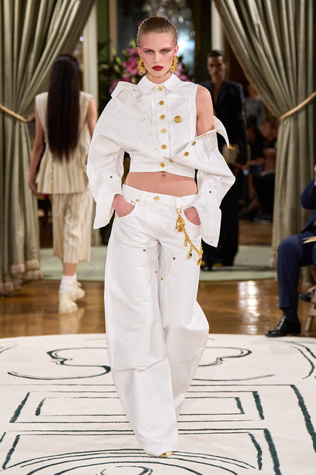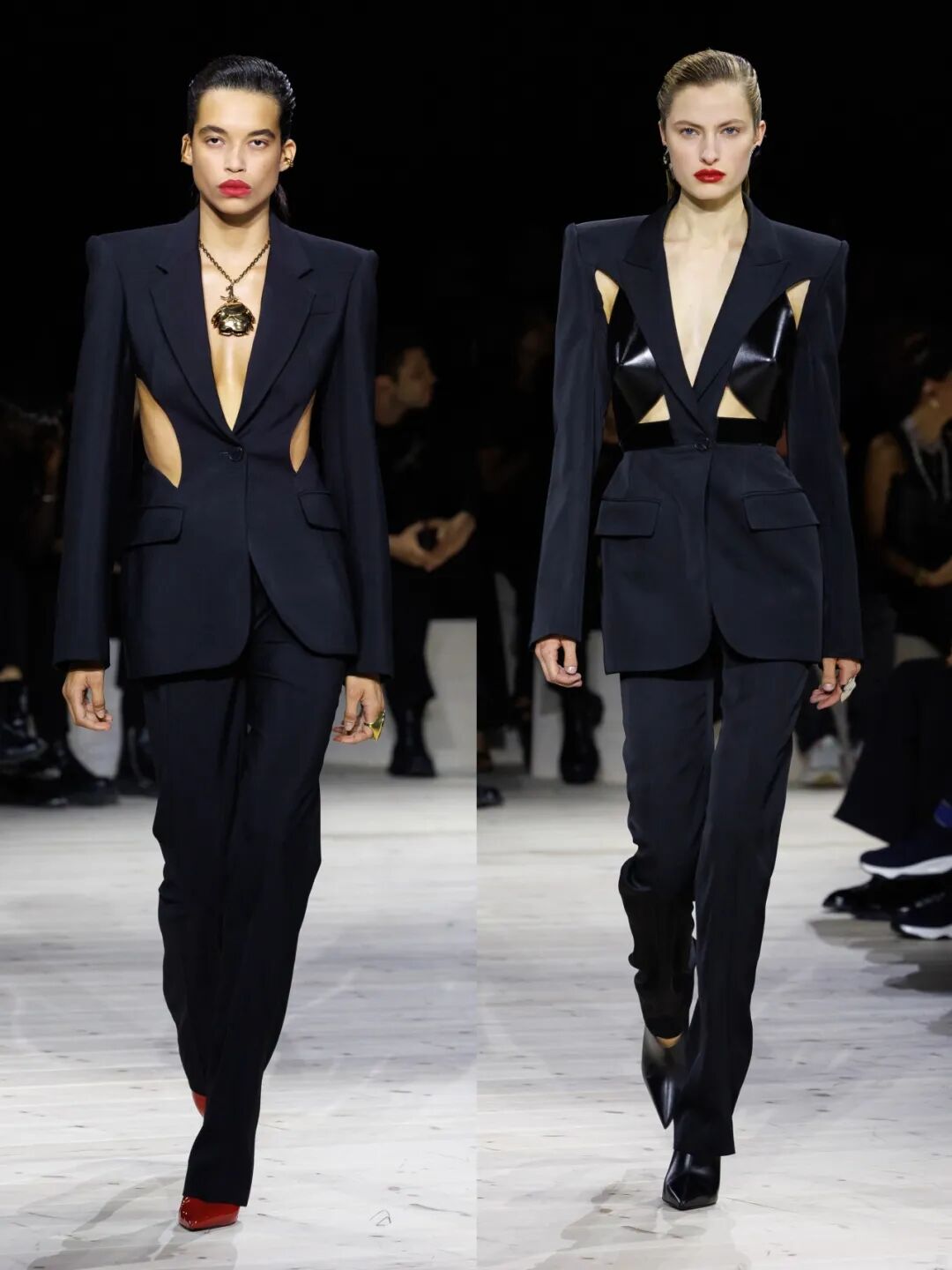 这一季创意总监 Anthony Vaccarello 一改之前轻薄略带流动性的材质,改用硬挺的棉质,不知道是不是受到 Quiet Luxury 风潮的影响。模特们梳着一丝不苟的发型,带着大体积金属耳环,充满 1980 年代风情。