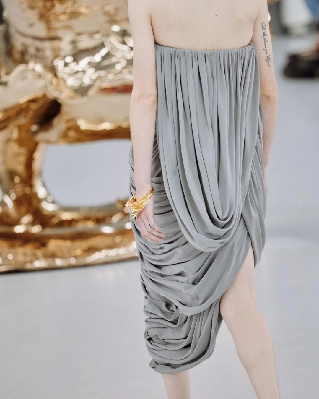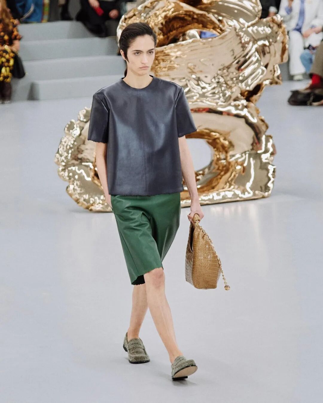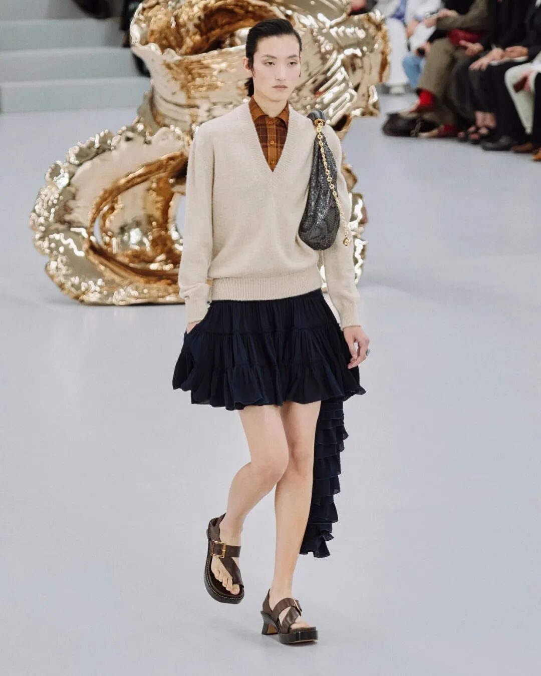 Loewe 2024 春夏女装时装秀在巴黎近郊的文森城堡(Château de Vincennes)举办,秀场上摆放的 6 件巨型青铜雕塑来自雕塑艺术大师 Lynda Benglis 《Elephant Necklace》 的系列作品,Lynda 是战后美国雕塑艺术界的重量级人物,长期钻研革新艺术品形态与材质,以选用多元素材挑战雕塑创作的固有框架而闻名。这次秀上所看到的青铜装置,是将黏土作品放大再经铸造而来,保留黏土原有的斑点、瑕疵与纹路,呼应 Jonathan Anderson 本季想强调的材质视觉效果。