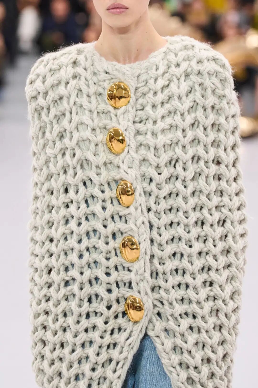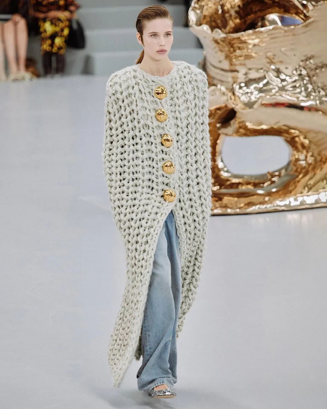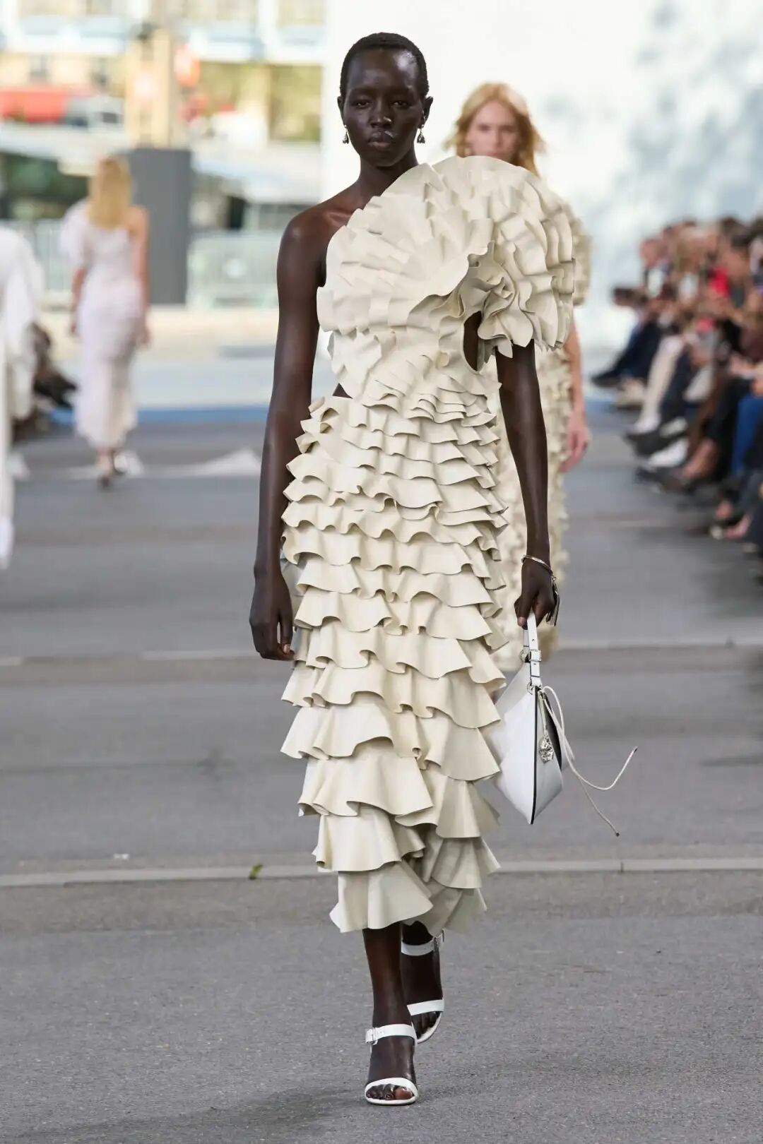 Loewe 2024 春夏女装时装秀在巴黎近郊的文森城堡(Château de Vincennes)举办,秀场上摆放的 6 件巨型青铜雕塑来自雕塑艺术大师 Lynda Benglis 《Elephant Necklace》 的系列作品,Lynda 是战后美国雕塑艺术界的重量级人物,长期钻研革新艺术品形态与材质,以选用多元素材挑战雕塑创作的固有框架而闻名。这次秀上所看到的青铜装置,是将黏土作品放大再经铸造而来,保留黏土原有的斑点、瑕疵与纹路,呼应 Jonathan Anderson 本季想强调的材质视觉效果。