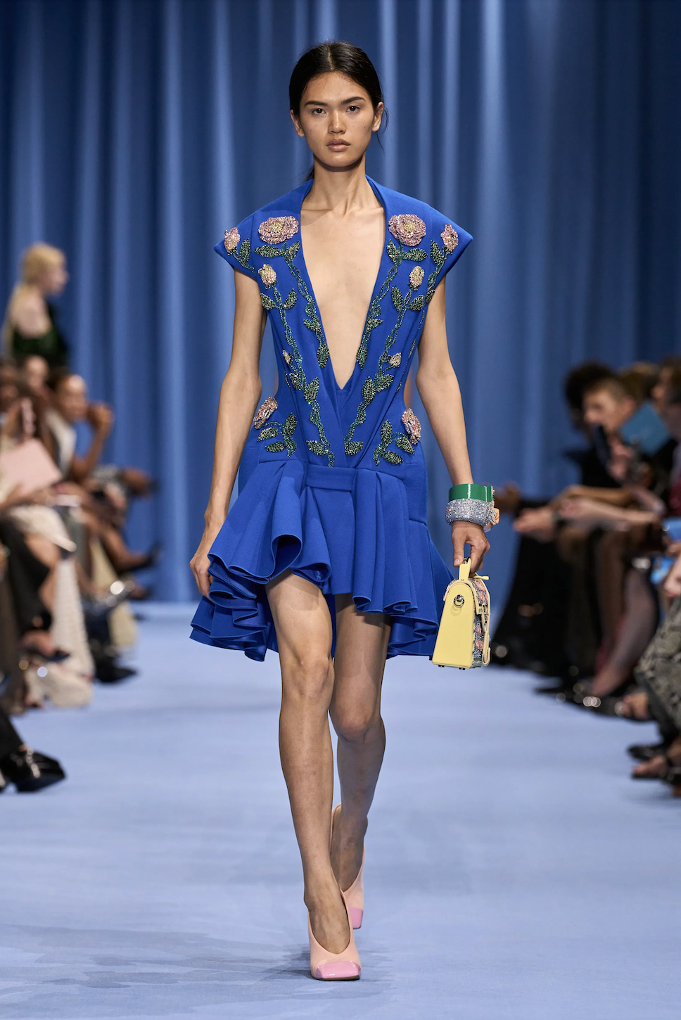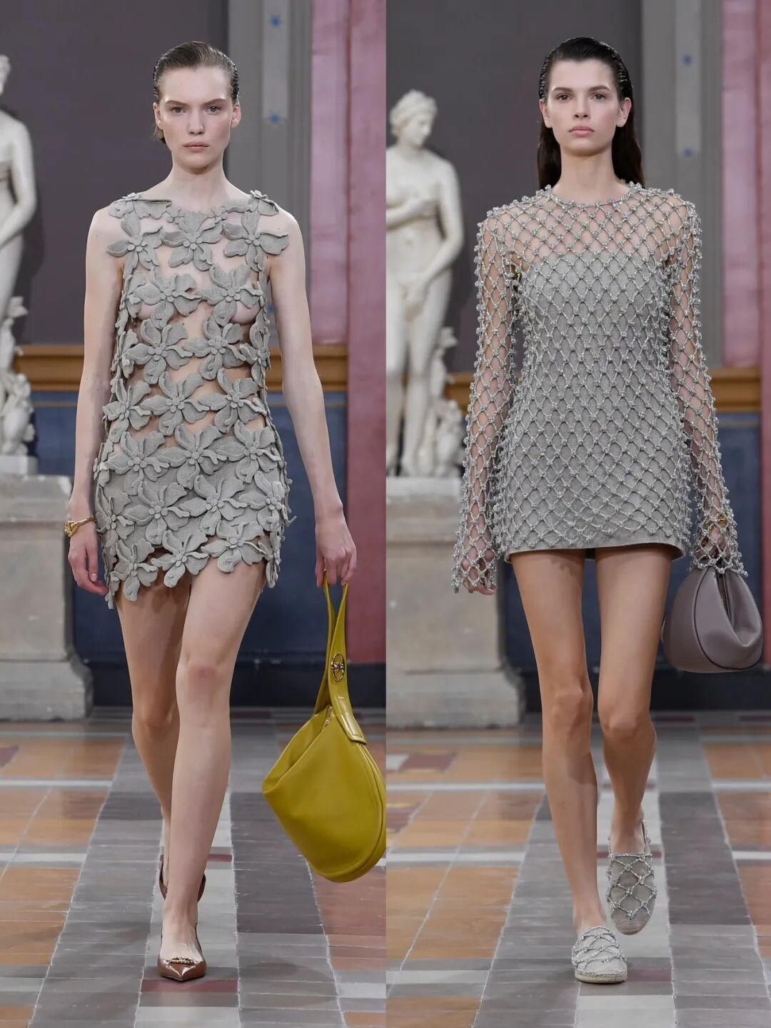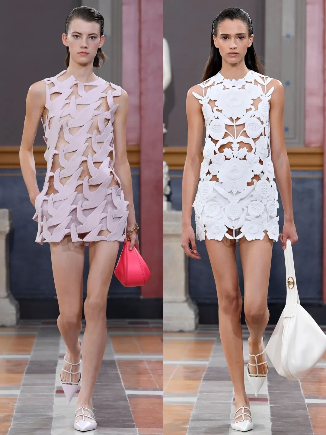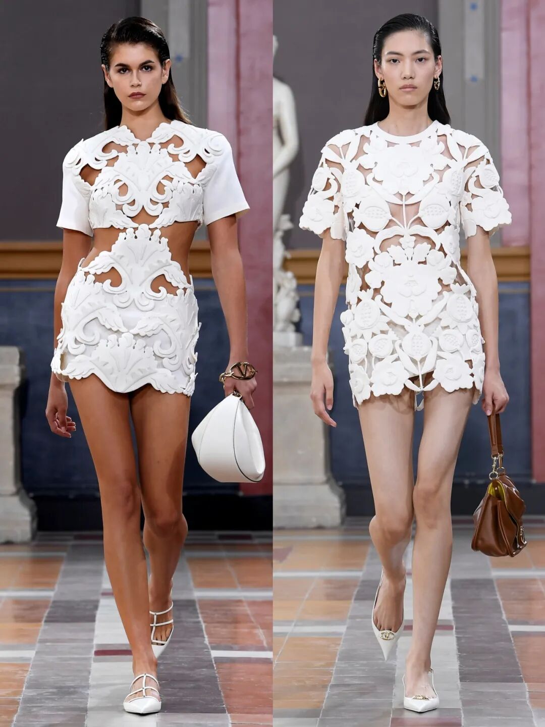 创意总监 Pierpaolo Piccioli 在这一季采用了全新工艺 Altorilievo——能巧妙地将织物雕刻成立体形态,巴洛克风格的植物纹饰、水果、花朵和动物图样,如画框一般环绕着身体,衬托出自身的纯真本质。让服装不再为了 “遮蔽身体” 而存在,而是与身体形成共生关系,让诠释这些衣物的女性也成为这件衣物的 “共同创作者”。