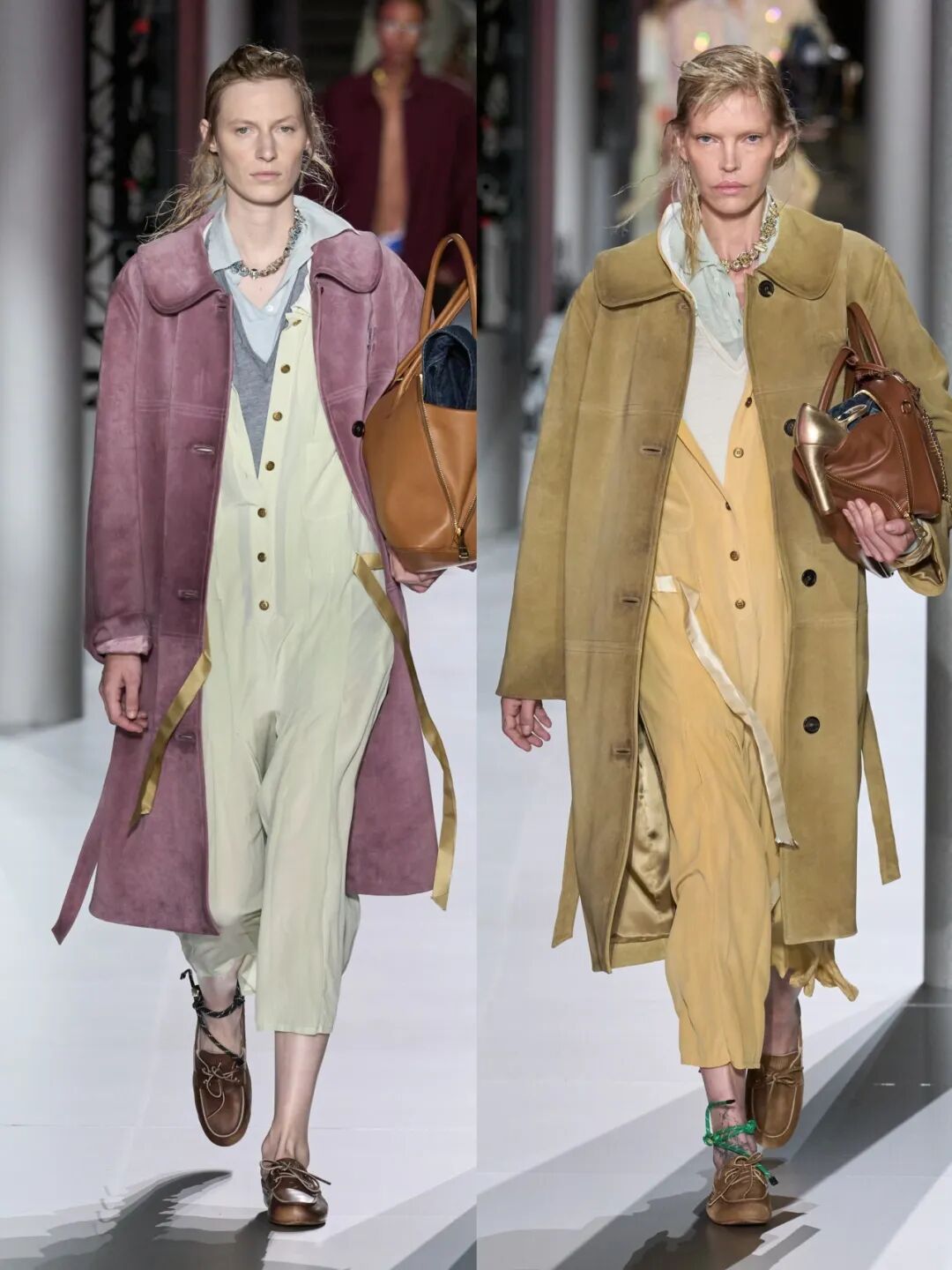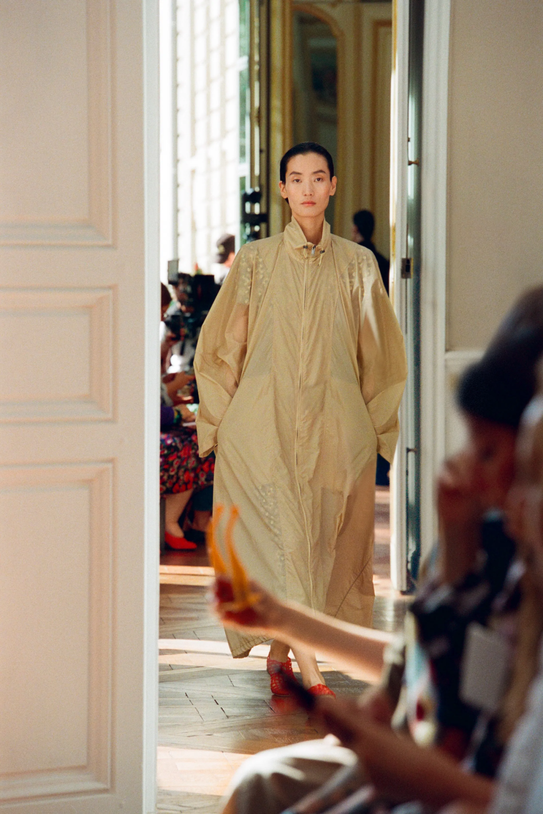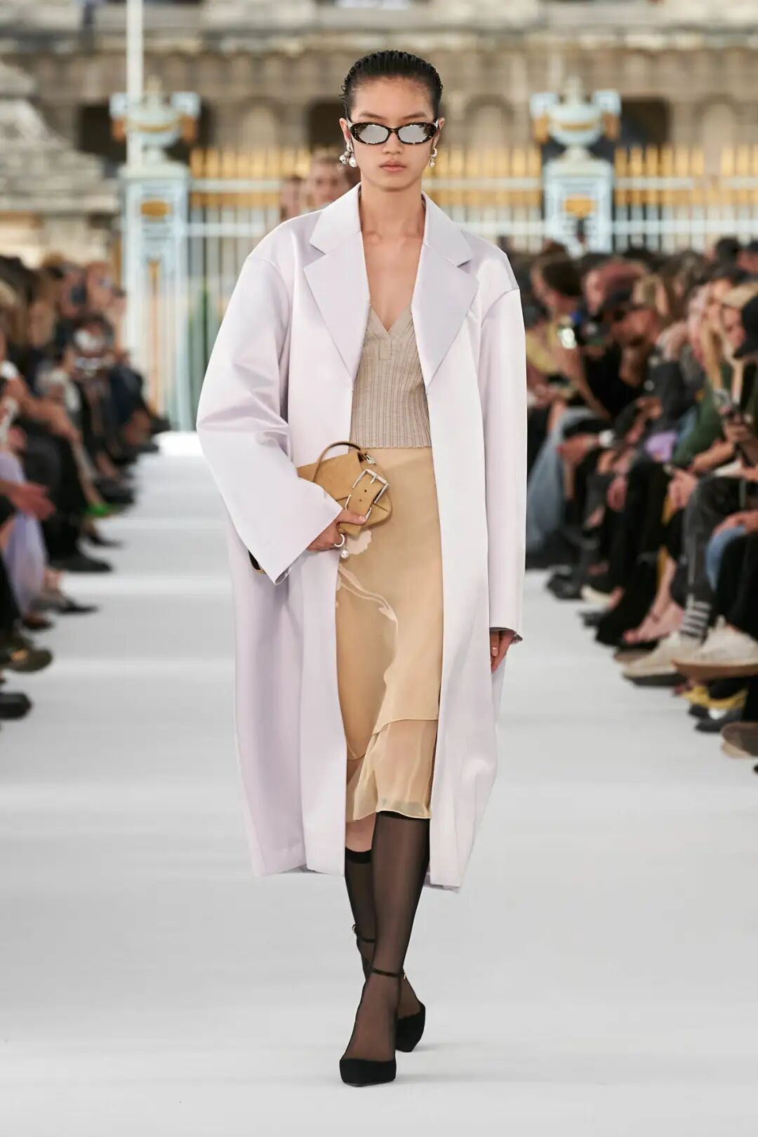 这一季的 THE ROW 一如既往的气定神闲,松弛有度。从 T 恤式连衣裙,雨衣、派克大衣、到斗篷和晚礼服,简约流畅的廓形加同色系的搭配适应各种场合,毫不费力地为女性打造了一个理想衣橱。这一季的时装秀中还融入了更多生活中的场景,模特把毛巾塞进风衣里或者搭在肩膀上,就像刚刚从海滩回来一样生动。