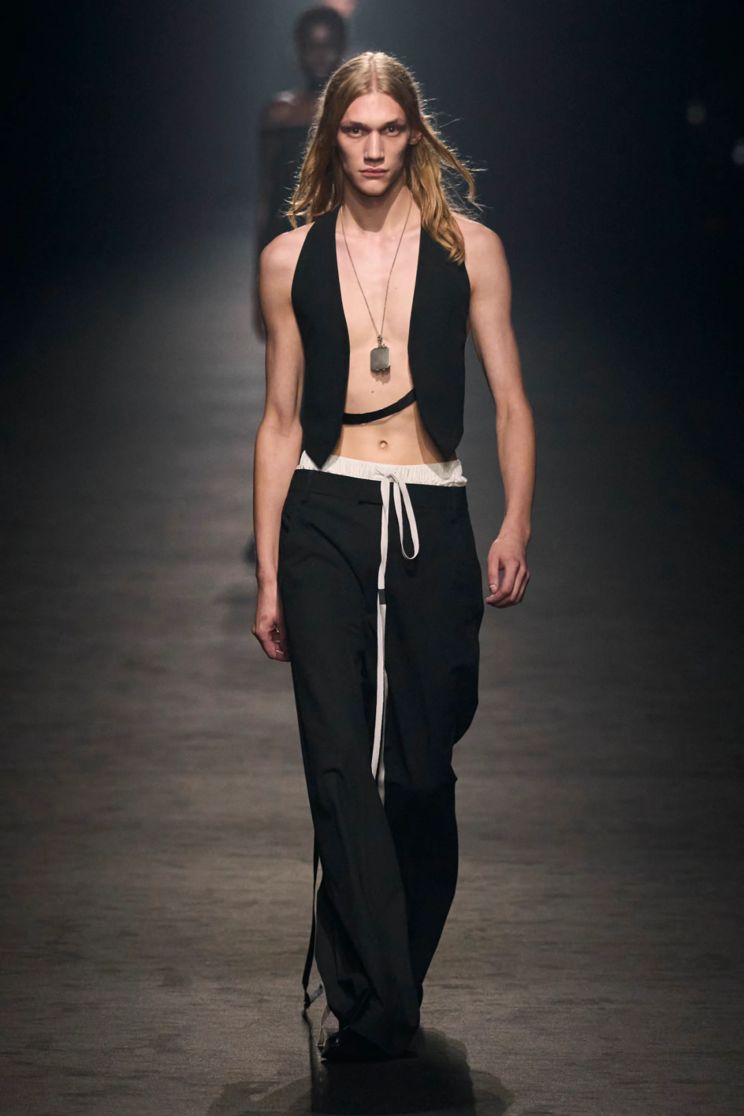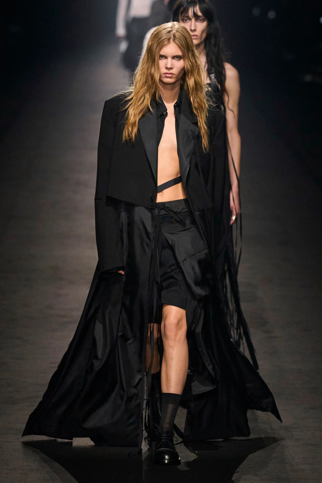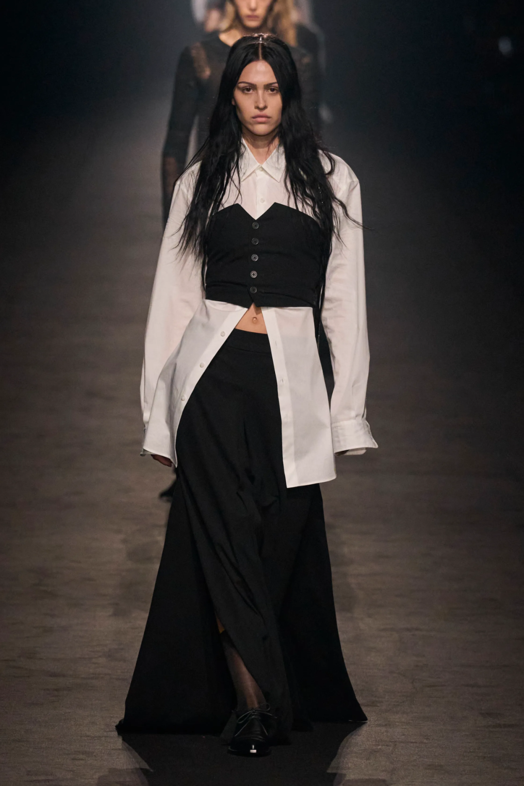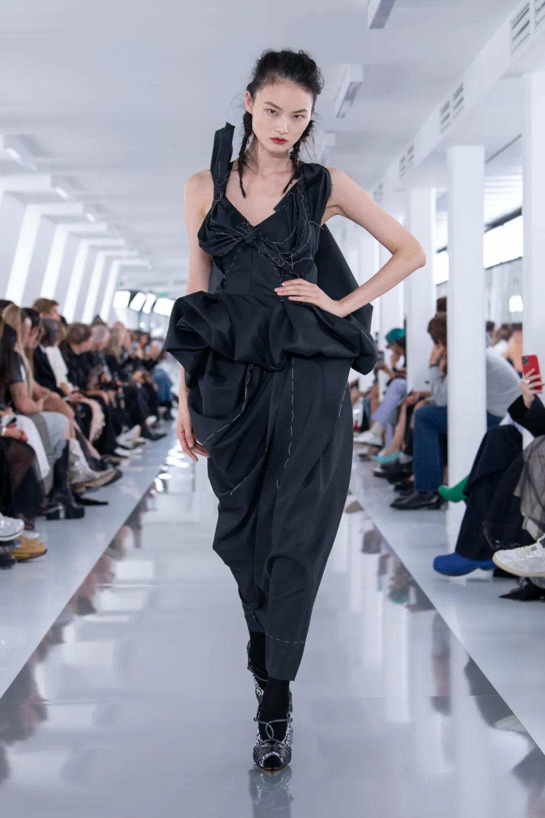 Stefano Gallici 1996 年出生,2020 年加入 Ann Demeulemeester ,今年 6 月在前任创意总监离职后升任为品牌创意总监。他带来的首季作品对品牌标志性元素有着很好的传承:不对称的解构主义剪裁、雌雄同体的风格、皮革与透明面料的结合、皮革束腰和背带等单品...在黑白光影之下演绎动态的美感。