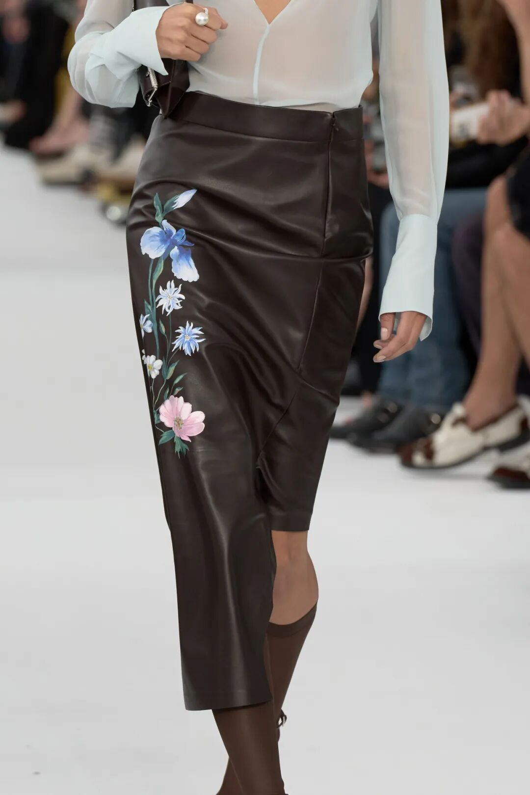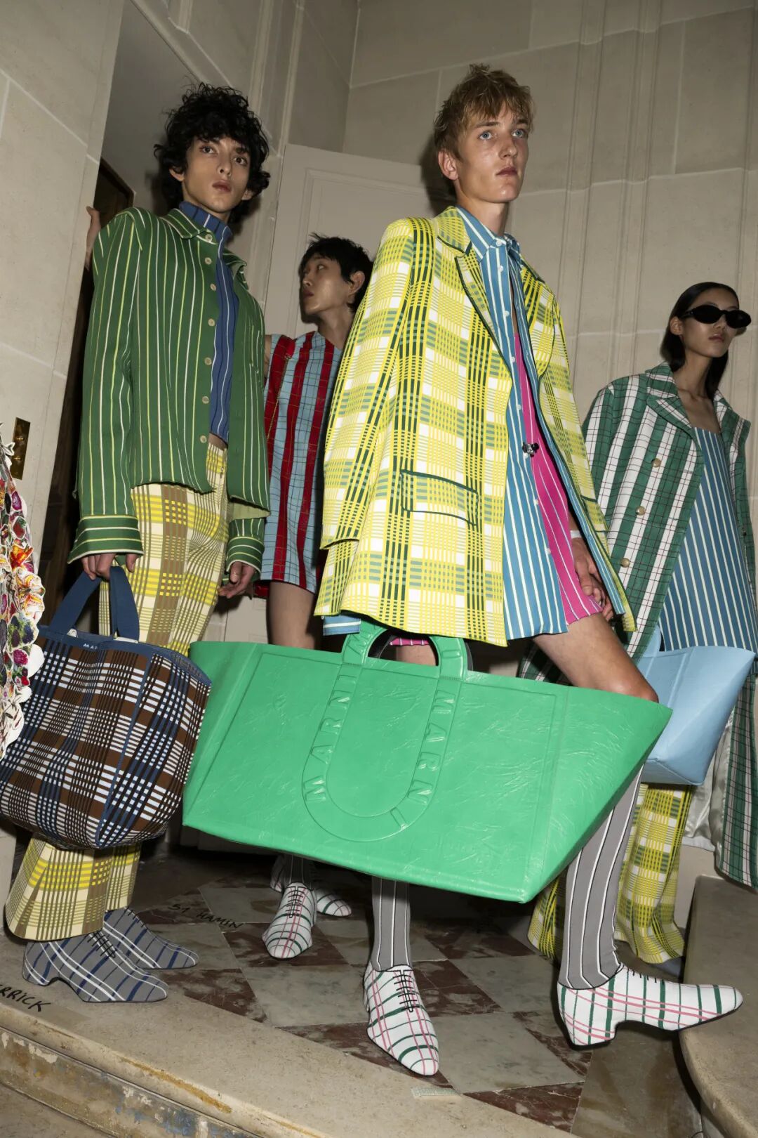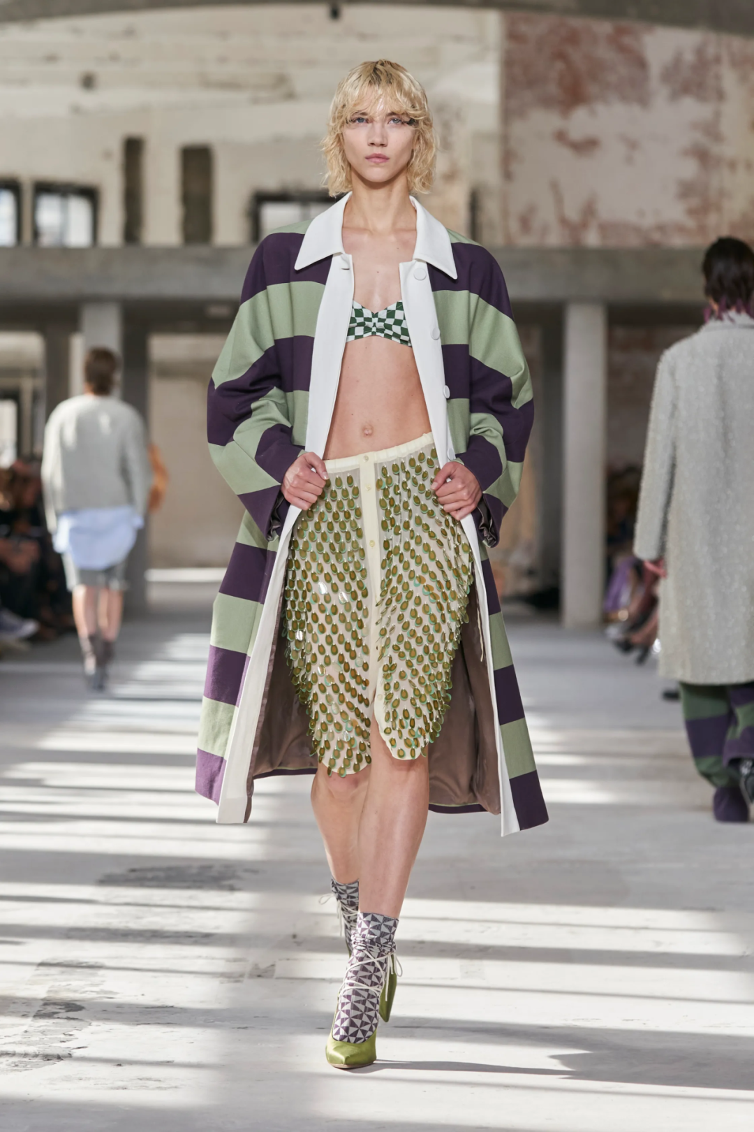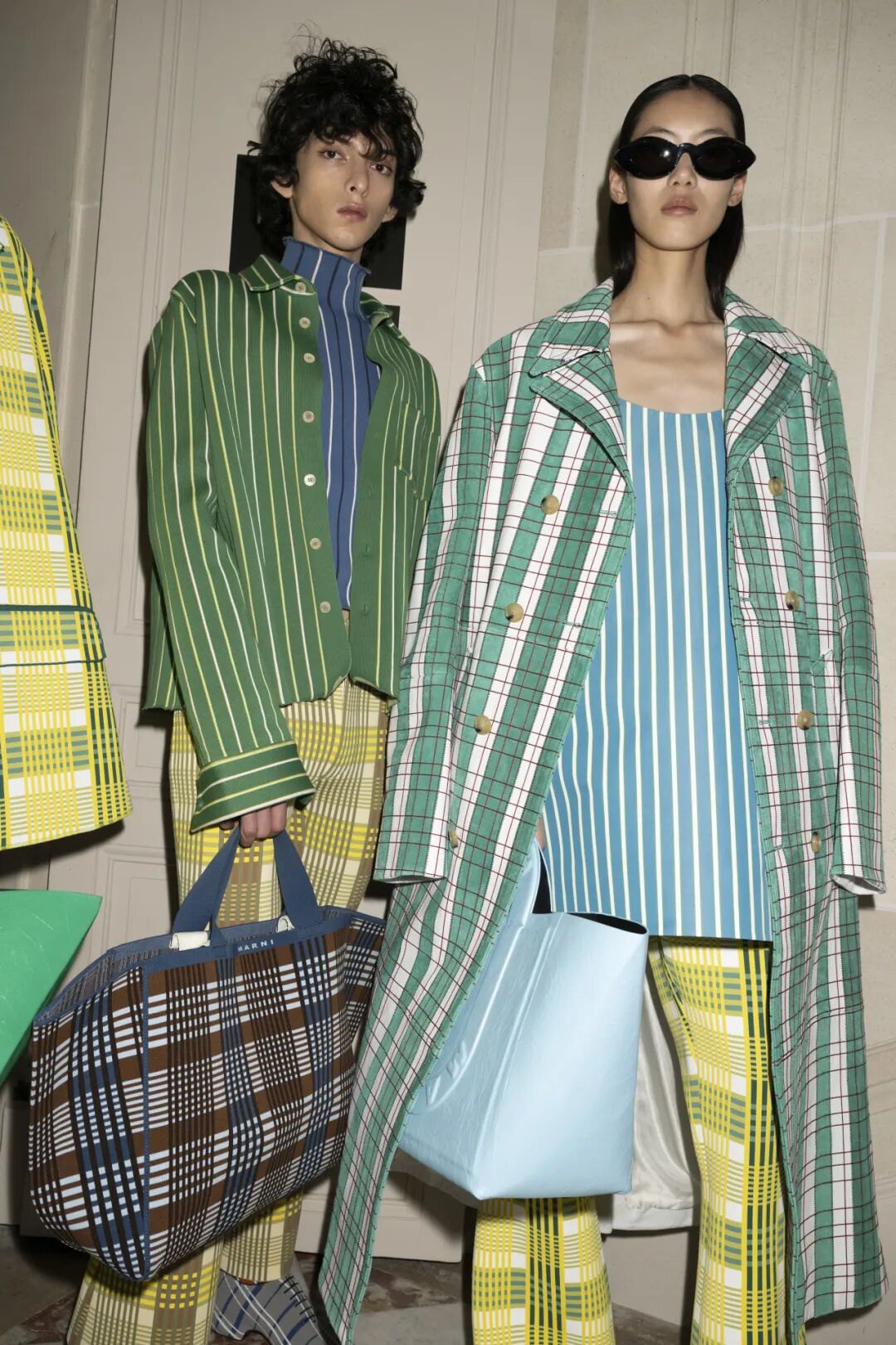 本季 Marni 加强了条纹、格子、花朵等品牌标志性元素,格纹元素焕新呈现出编织提花与鞣制皮革拼接式样,也出现了低饱和度罗纹背心搭配低腰长裙这样全新的视觉风格。各式贴纸式花朵拼接短裙十分抢眼,使用五颜六色的布料制作,在上方覆盖亮面立体花朵,非常符合 Francesco Risso 一贯的设计风格。