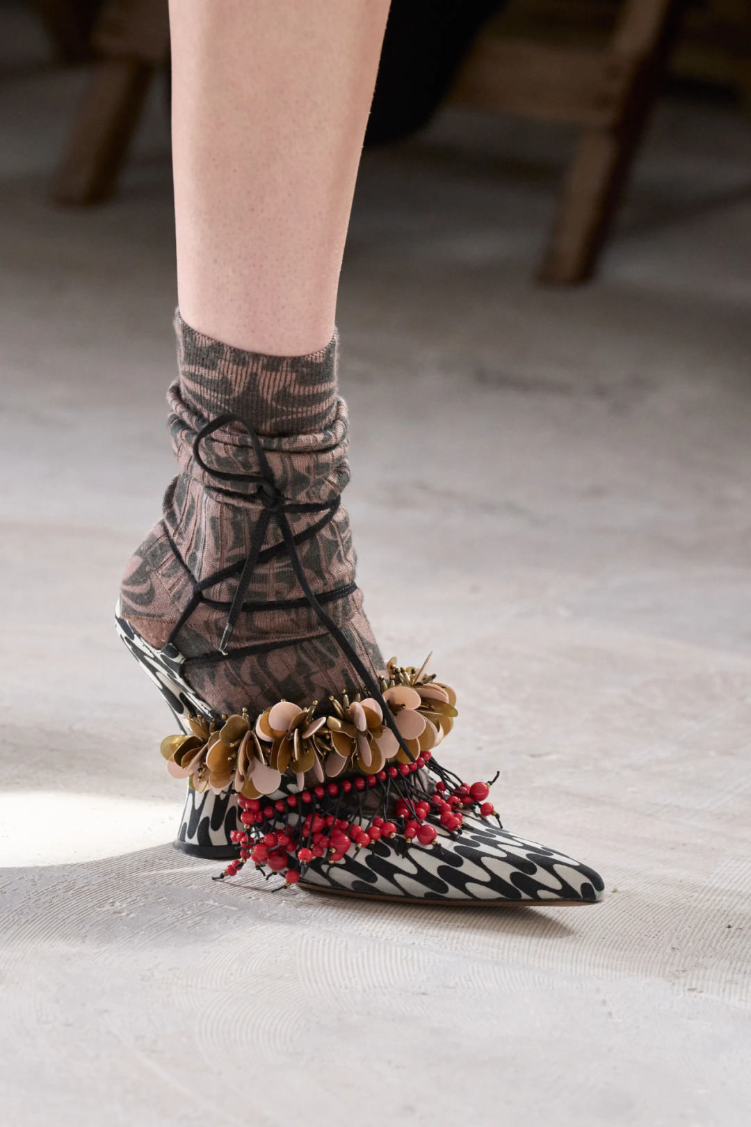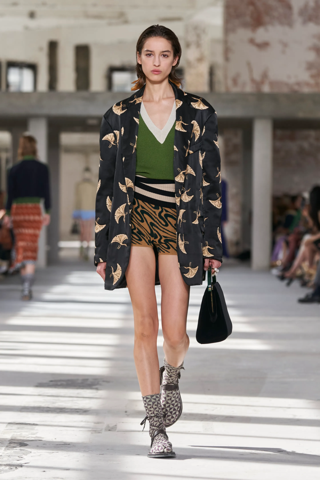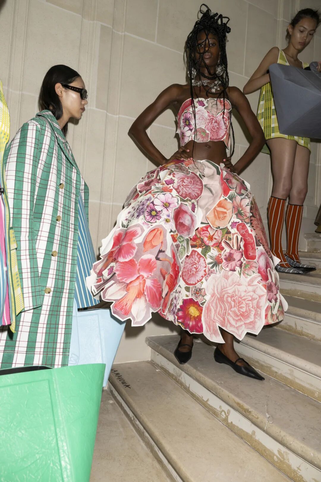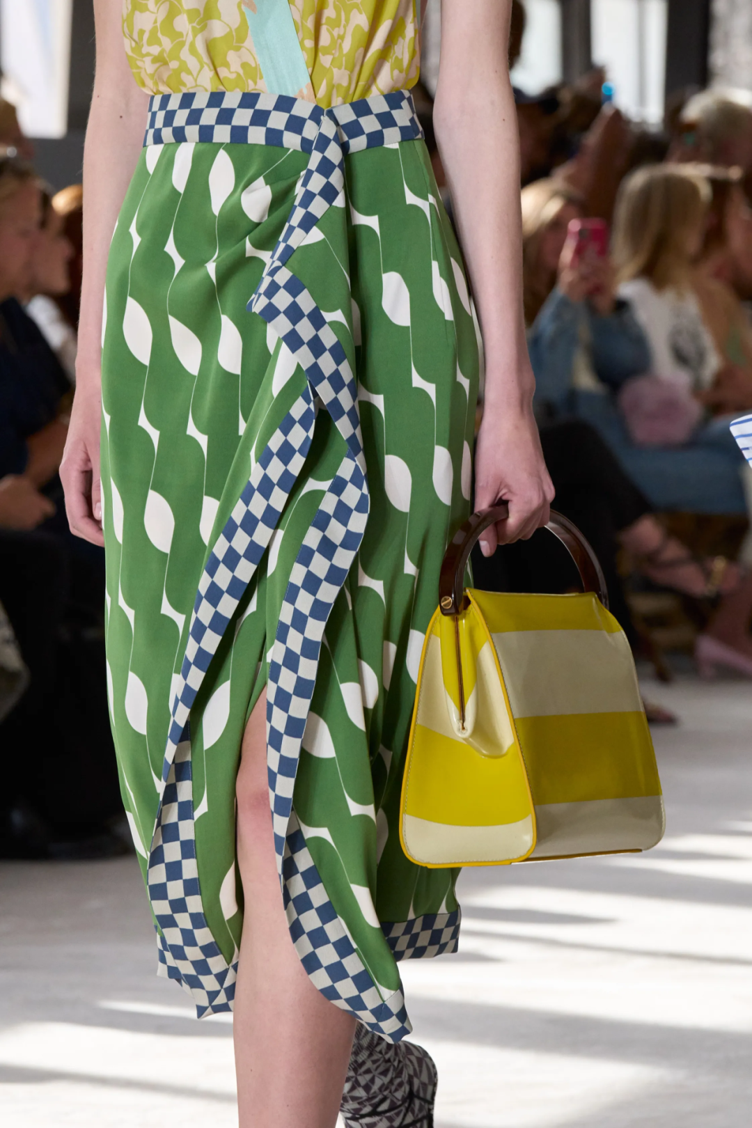 本季 Marni 加强了条纹、格子、花朵等品牌标志性元素,格纹元素焕新呈现出编织提花与鞣制皮革拼接式样,也出现了低饱和度罗纹背心搭配低腰长裙这样全新的视觉风格。各式贴纸式花朵拼接短裙十分抢眼,使用五颜六色的布料制作,在上方覆盖亮面立体花朵,非常符合 Francesco Risso 一贯的设计风格。