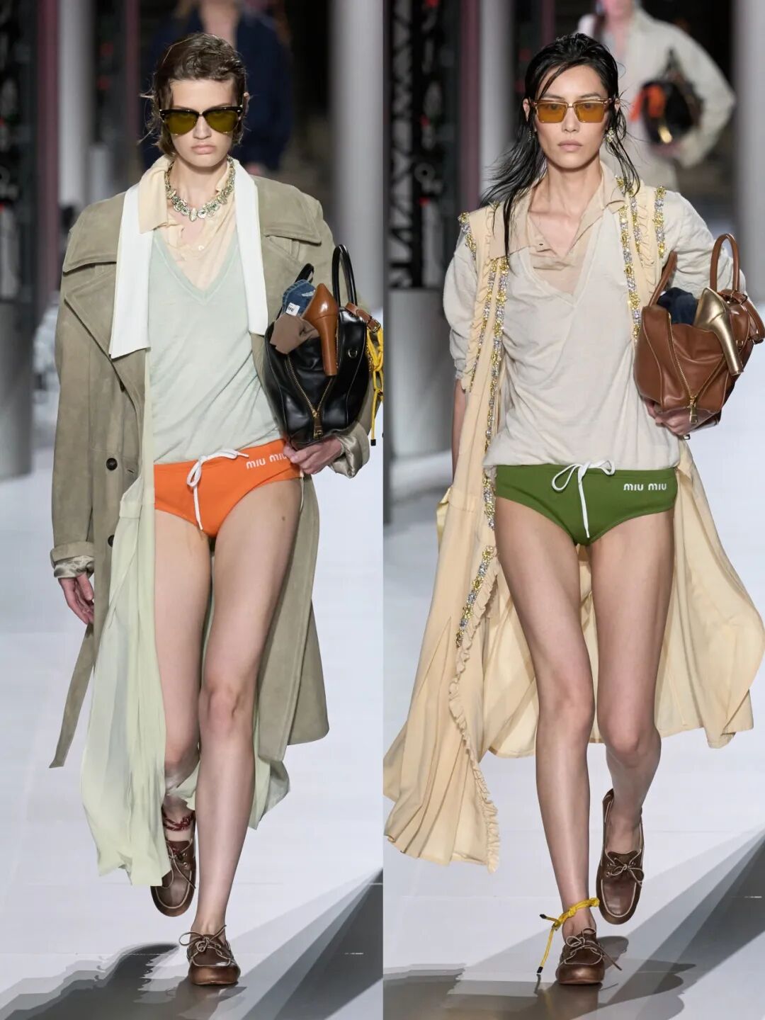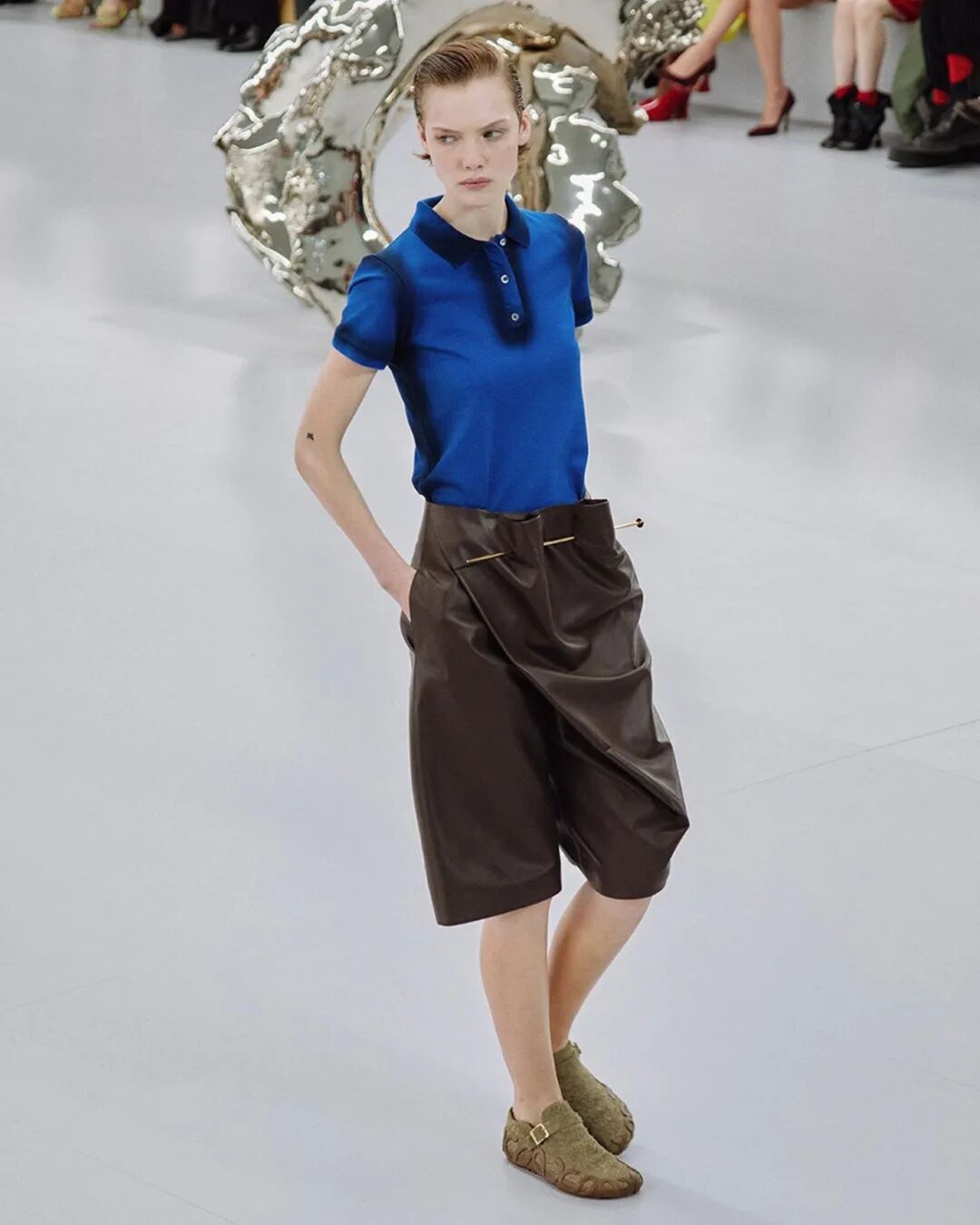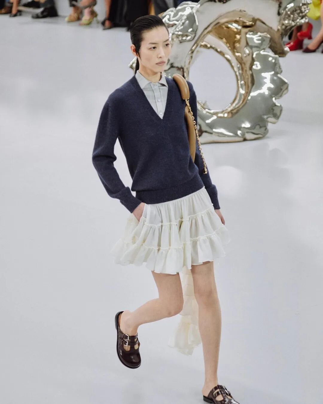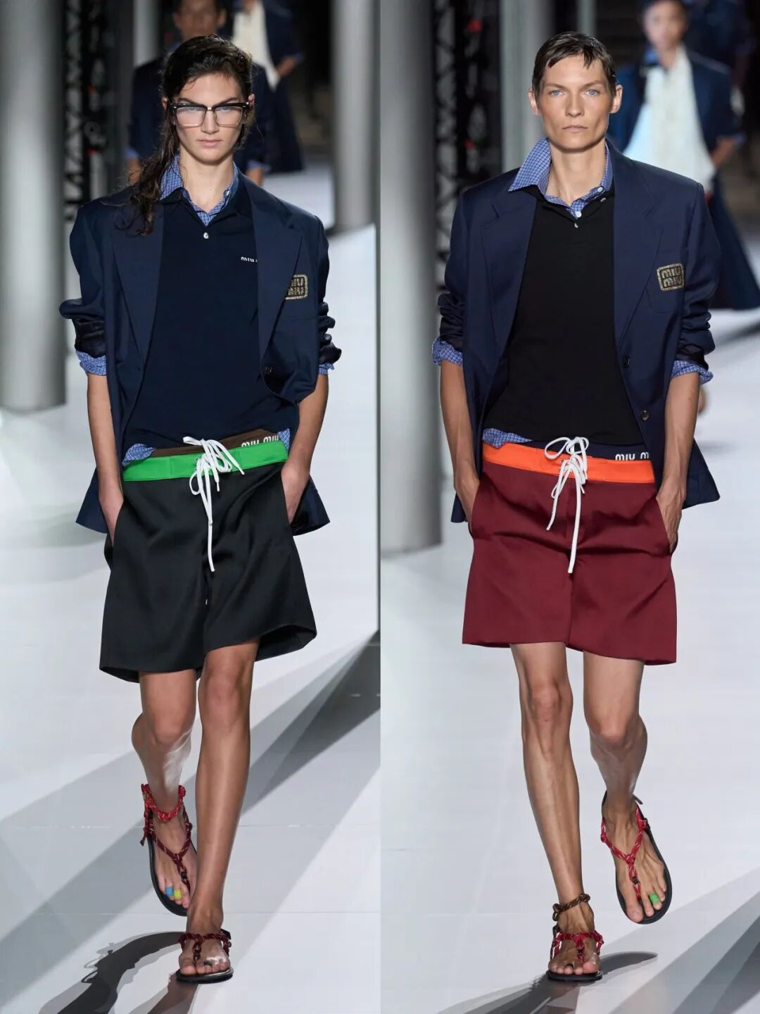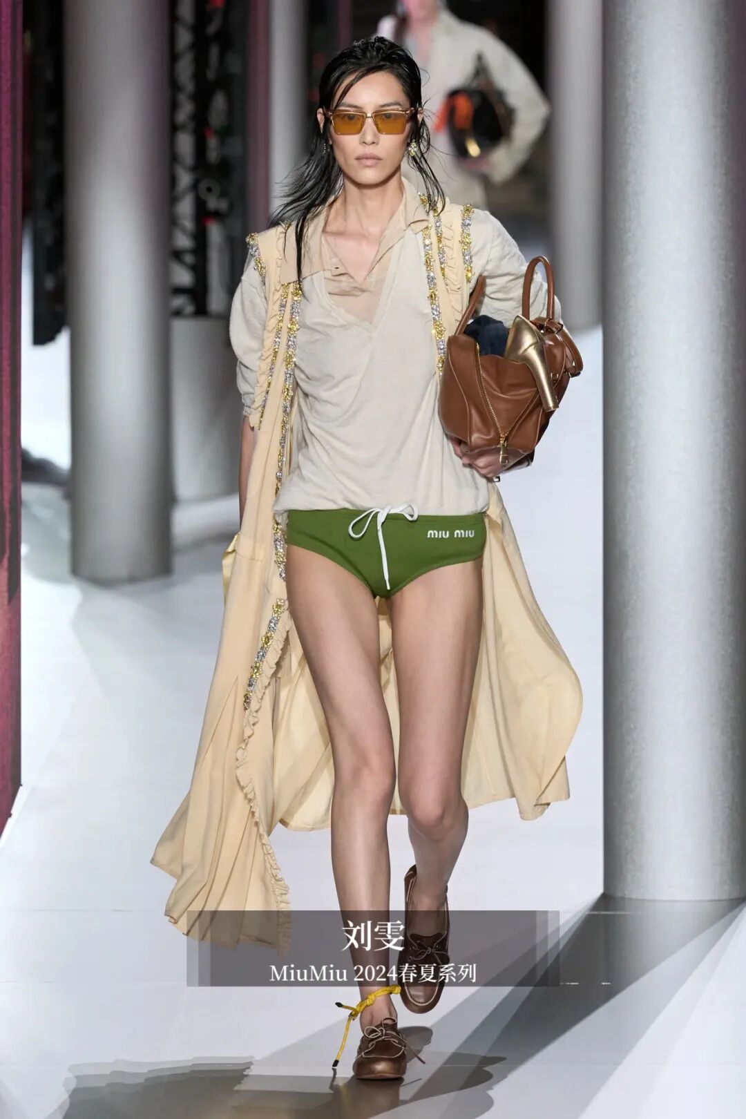 低腰短裤、学院派 Polo 衫、小巧迷你裙是早期的青少年制服,这些单品在 Miuccia Prada 的手中在近几季的 MiuMiu 得到了复兴,像是从 1960 年代日本石津祥介所著的 《Take Ivy》 书中走出的少年形象。比基尼泳裤和宽领外套等廓形,是 2023 秋冬系列的延续,通过裸露皮肤传递出一种性感,用高饱和度的橘色与草绿色增添了全新活力。穿着沙滩凉鞋的脚上贴着彩色创可贴,既体现着生活的繁杂无序,又在无奈中,彰显着生活的缤纷美好。