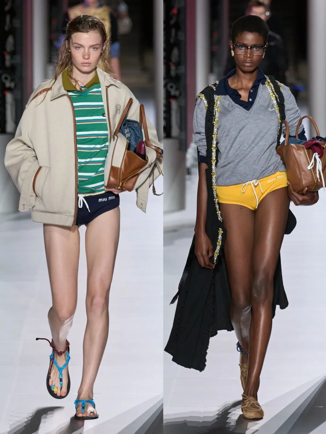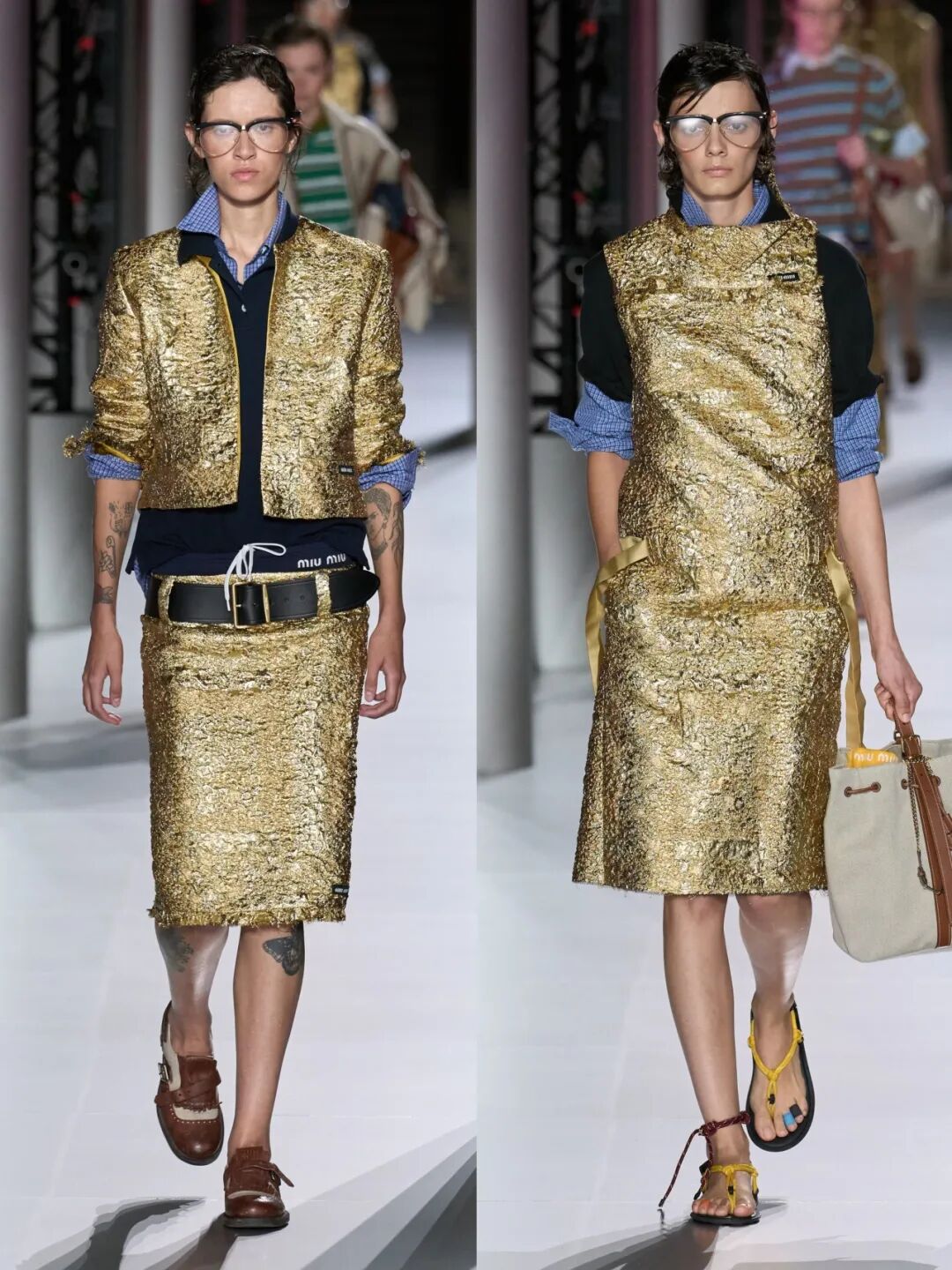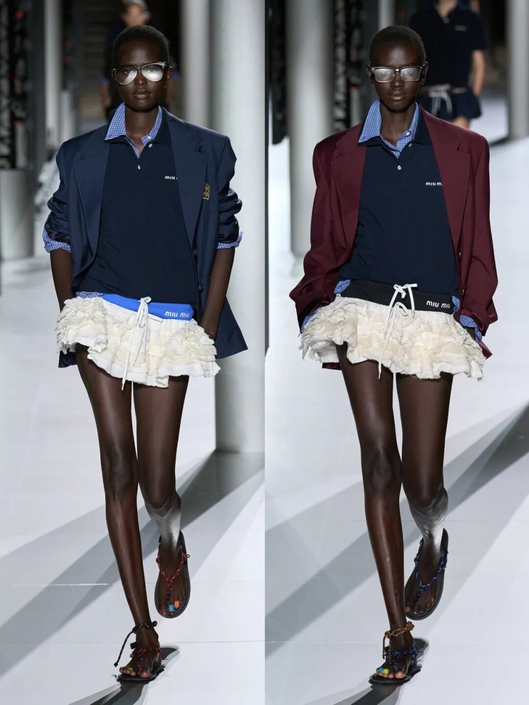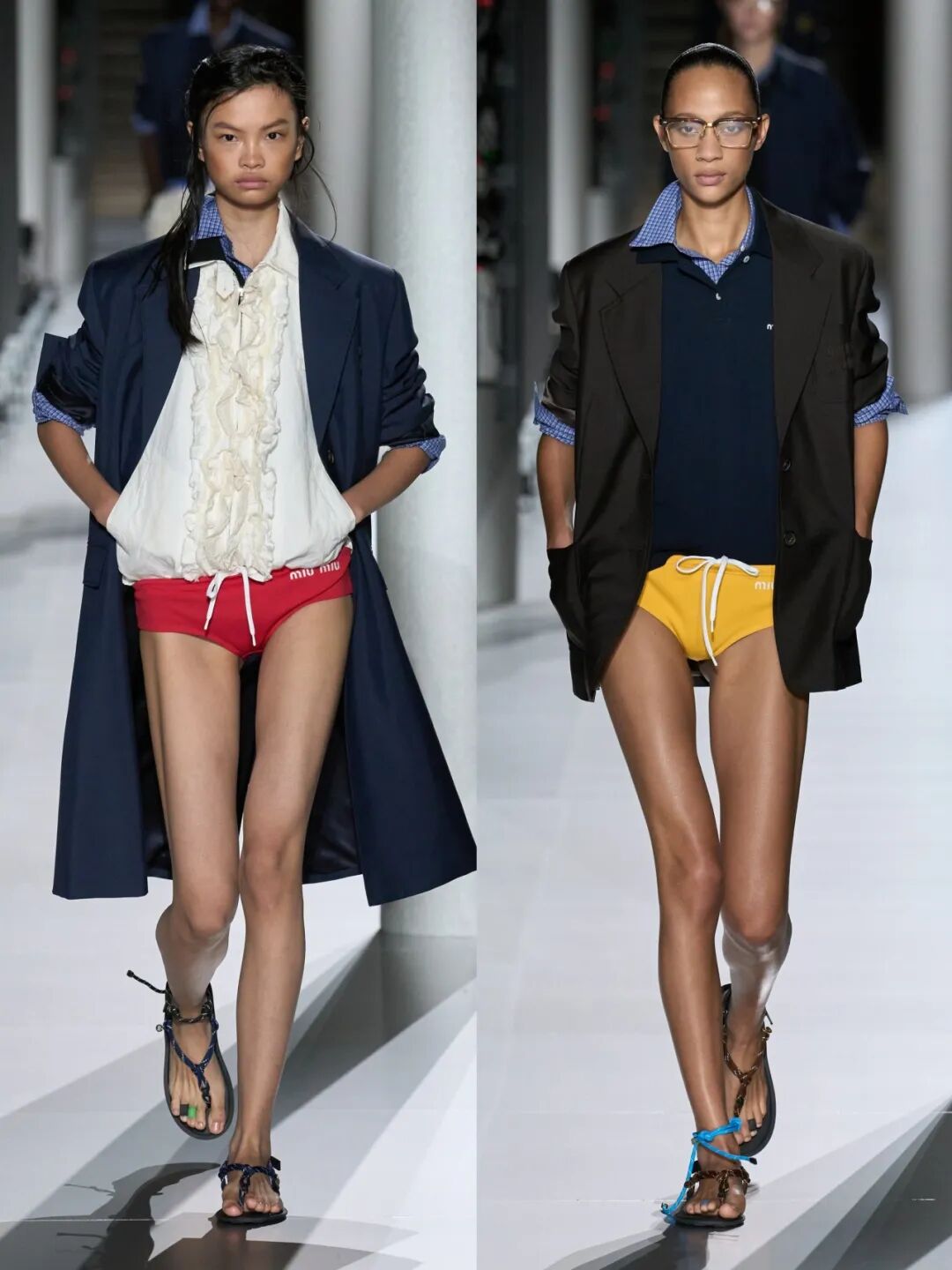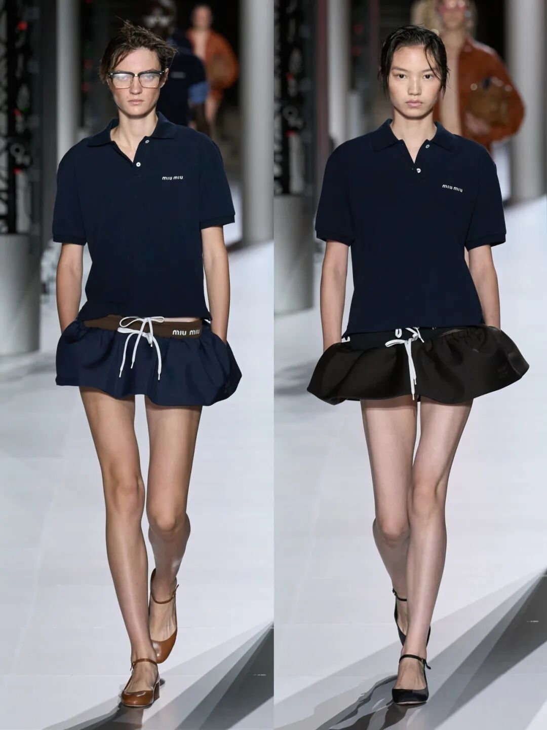 低腰短裤、学院派 Polo 衫、小巧迷你裙是早期的青少年制服,这些单品在 Miuccia Prada 的手中在近几季的 MiuMiu 得到了复兴,像是从 1960 年代日本石津祥介所著的 《Take Ivy》 书中走出的少年形象。比基尼泳裤和宽领外套等廓形,是 2023 秋冬系列的延续,通过裸露皮肤传递出一种性感,用高饱和度的橘色与草绿色增添了全新活力。穿着沙滩凉鞋的脚上贴着彩色创可贴,既体现着生活的繁杂无序,又在无奈中,彰显着生活的缤纷美好。