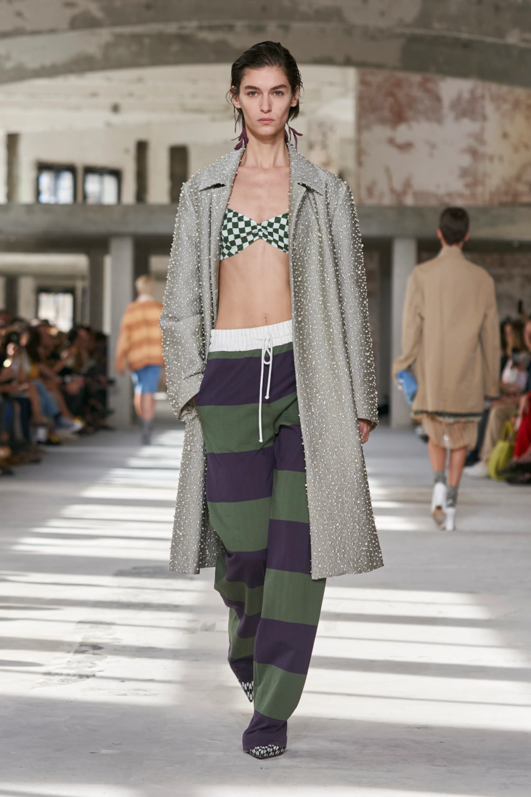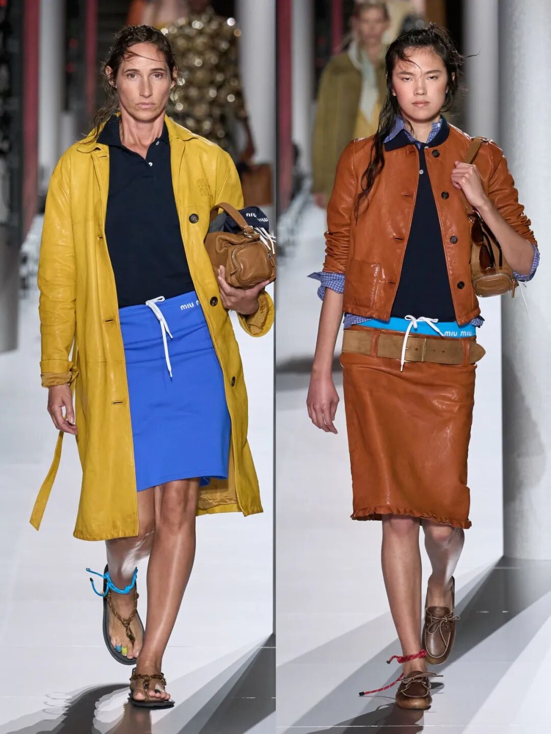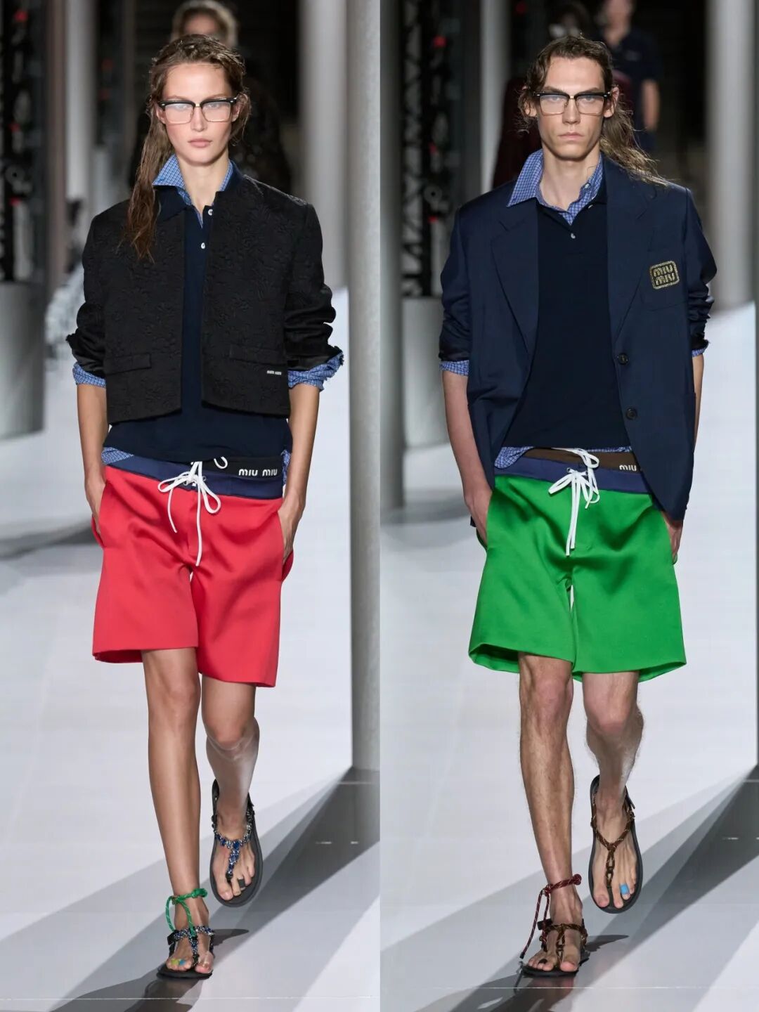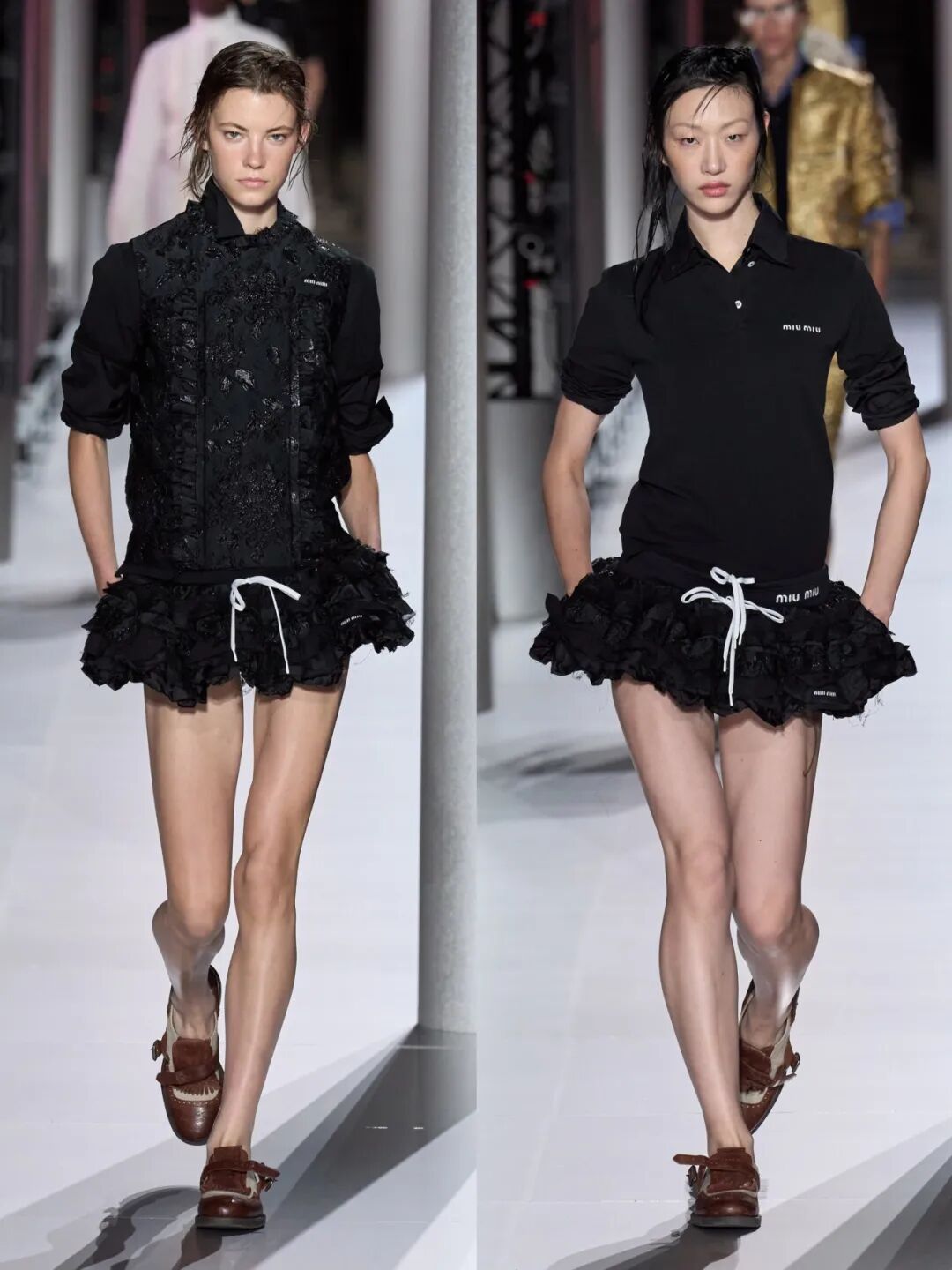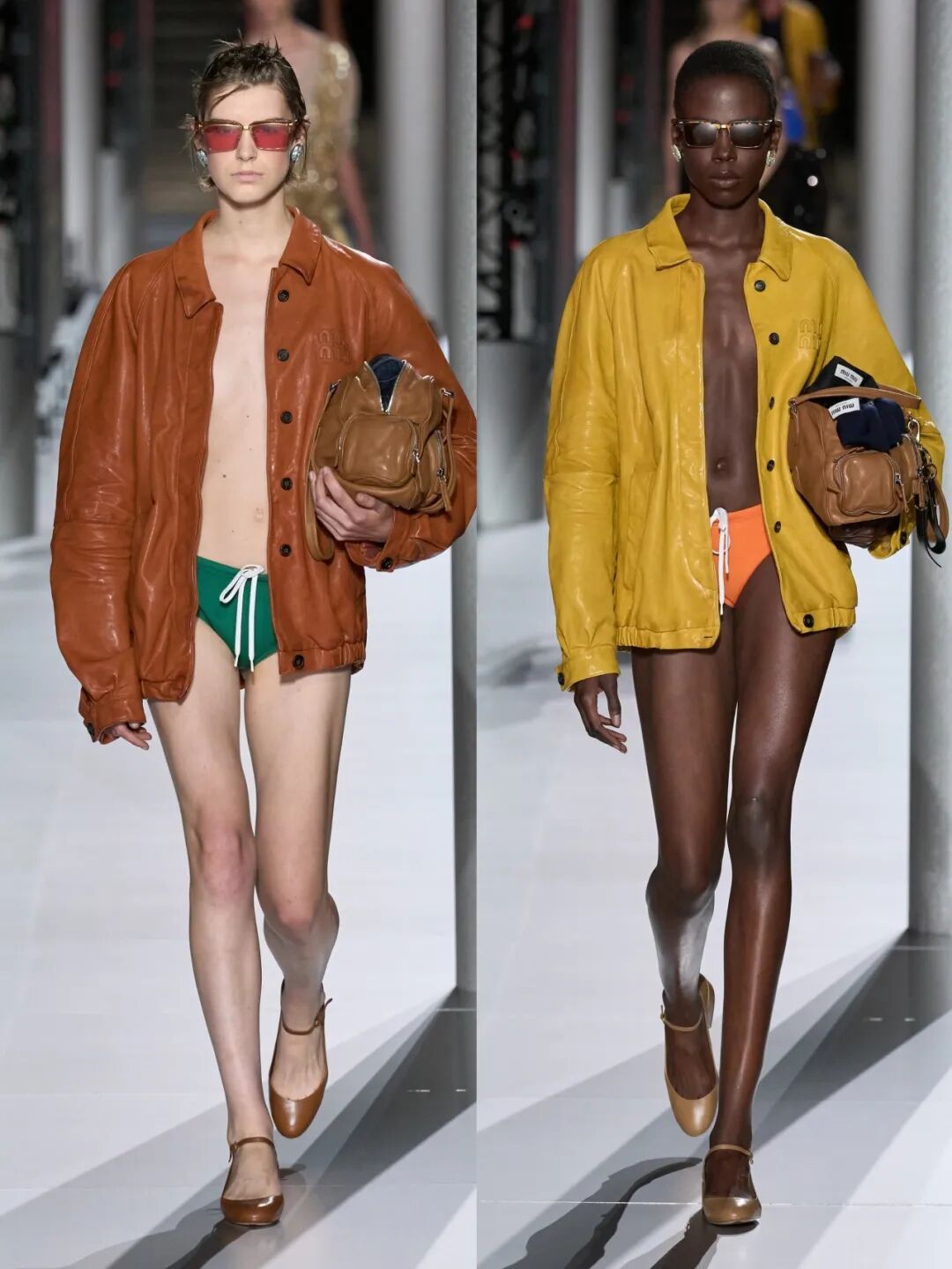 低腰短裤、学院派 Polo 衫、小巧迷你裙是早期的青少年制服,这些单品在 Miuccia Prada 的手中在近几季的 MiuMiu 得到了复兴,像是从 1960 年代日本石津祥介所著的 《Take Ivy》 书中走出的少年形象。比基尼泳裤和宽领外套等廓形,是 2023 秋冬系列的延续,通过裸露皮肤传递出一种性感,用高饱和度的橘色与草绿色增添了全新活力。穿着沙滩凉鞋的脚上贴着彩色创可贴,既体现着生活的繁杂无序,又在无奈中,彰显着生活的缤纷美好。