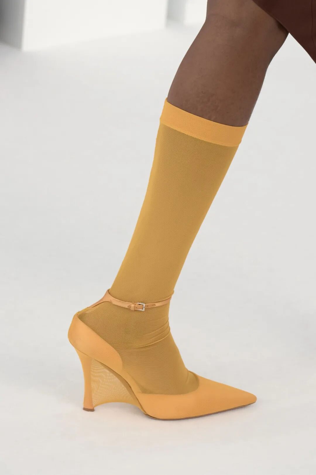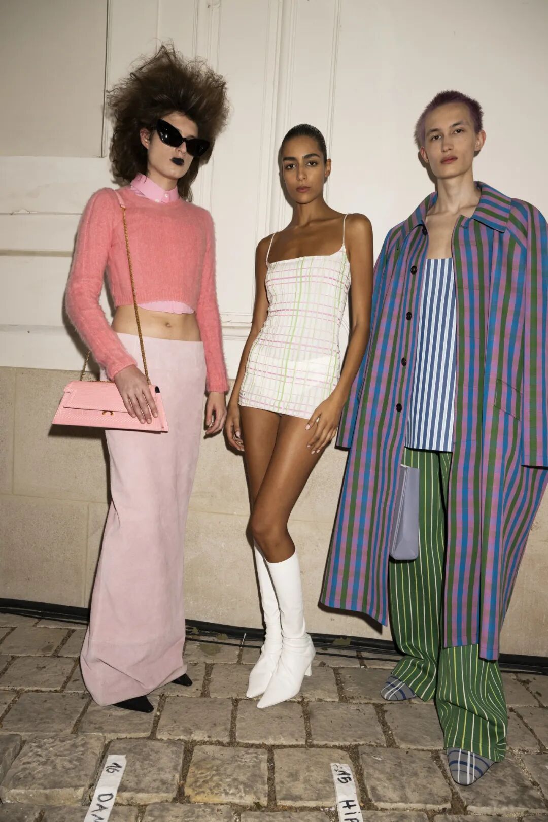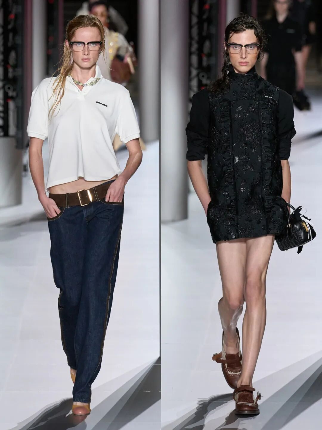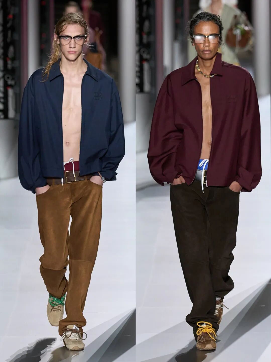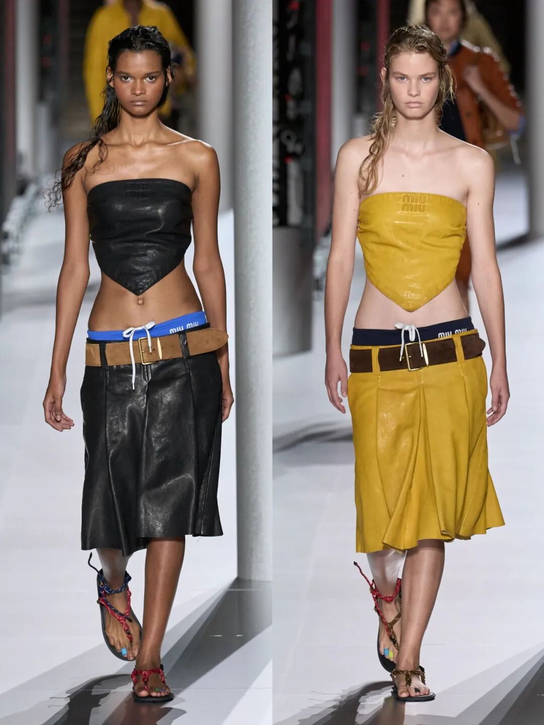 低腰短裤、学院派 Polo 衫、小巧迷你裙是早期的青少年制服,这些单品在 Miuccia Prada 的手中在近几季的 MiuMiu 得到了复兴,像是从 1960 年代日本石津祥介所著的 《Take Ivy》 书中走出的少年形象。比基尼泳裤和宽领外套等廓形,是 2023 秋冬系列的延续,通过裸露皮肤传递出一种性感,用高饱和度的橘色与草绿色增添了全新活力。穿着沙滩凉鞋的脚上贴着彩色创可贴,既体现着生活的繁杂无序,又在无奈中,彰显着生活的缤纷美好。