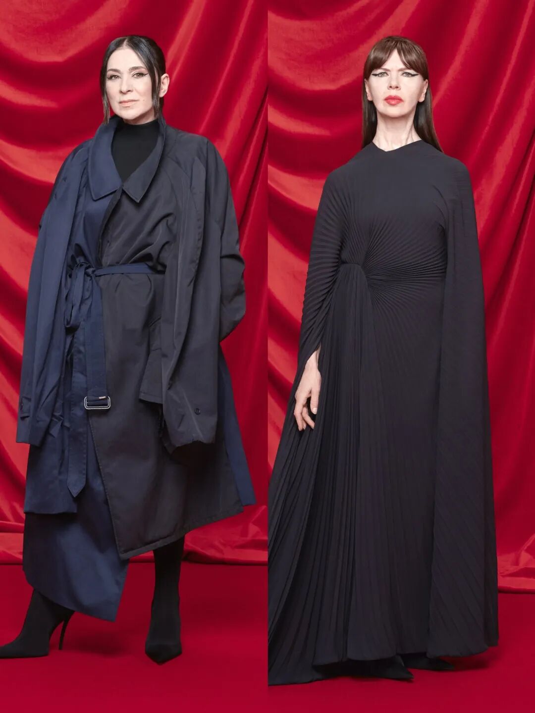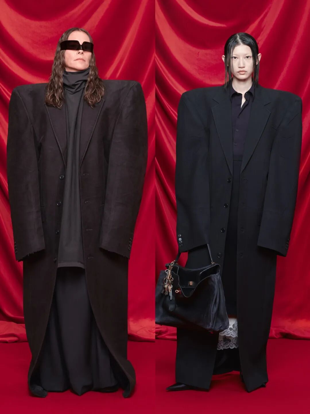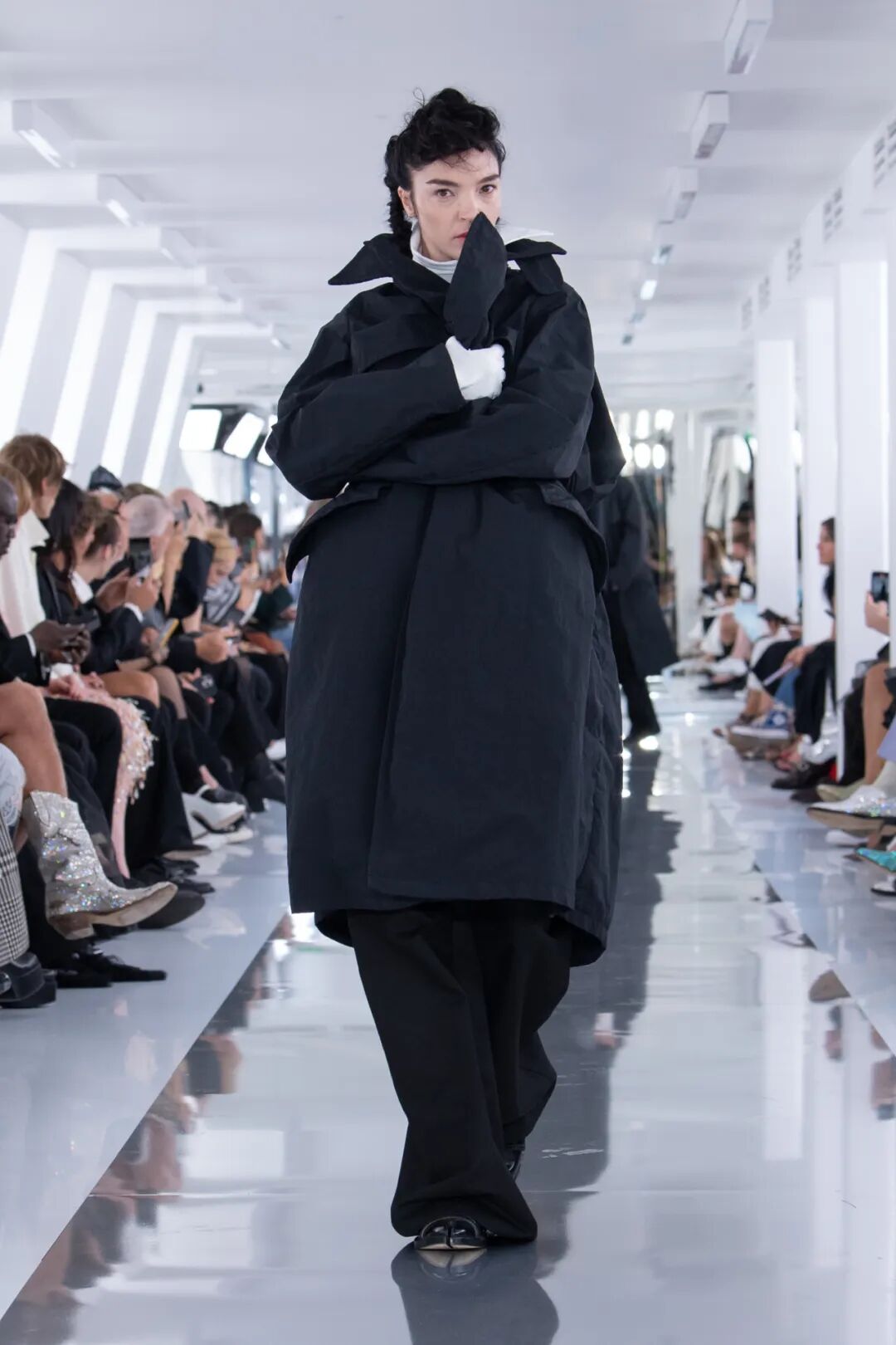 出场第一个造型是 Demna 的母亲 Ella,她身着一款经过升级再造制作而成的轻便大衣外套缓缓走来。她是 Demna 设计风格的最初灵感来源。这件大衣由 3 件经过解构和改造的复古服饰拼接制成,运用品牌标志性的剪裁技法,体现了一贯的风格态度。肩部未采用立体肩垫,却呈现出平整而笔直的肩部线条。整体版型宽松,同时加入褶裥细节,更有同款造型选用英国羊毛彰显裁缝精湛的制衣工艺。