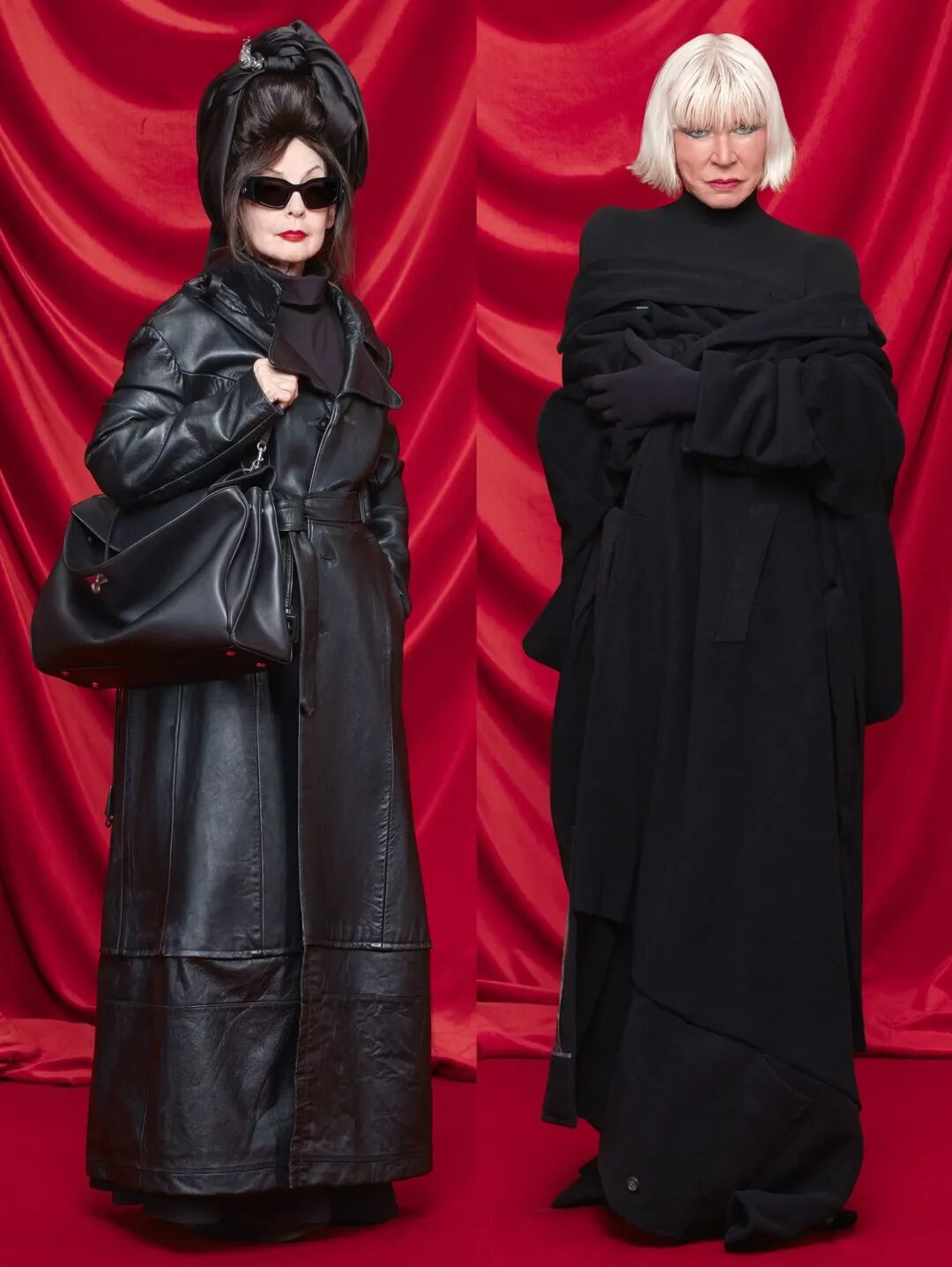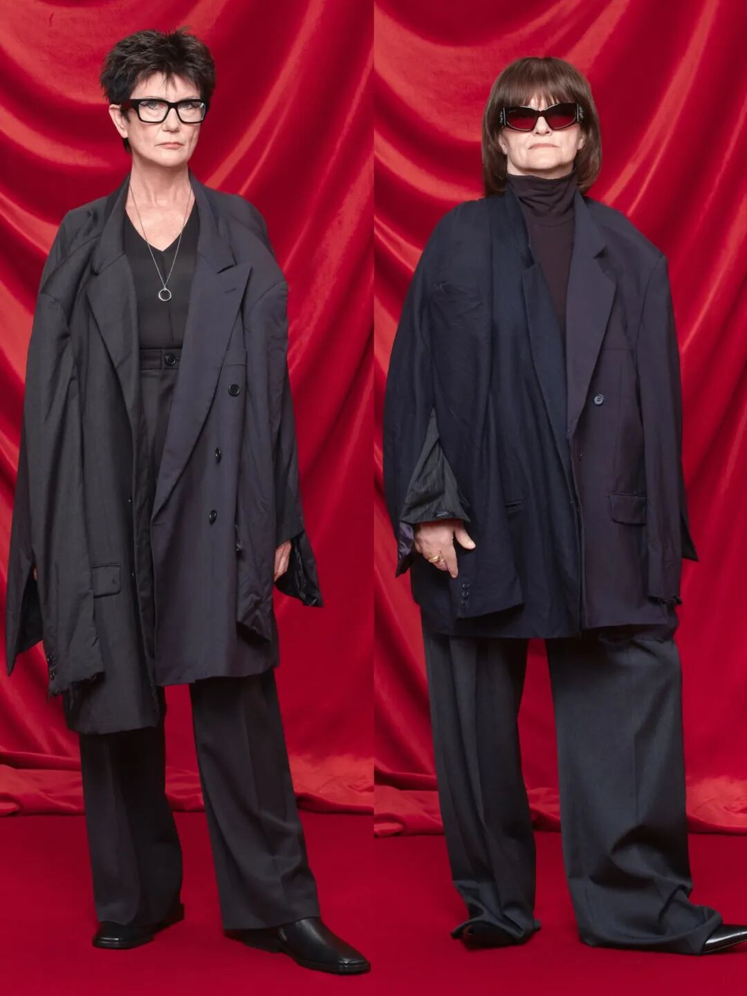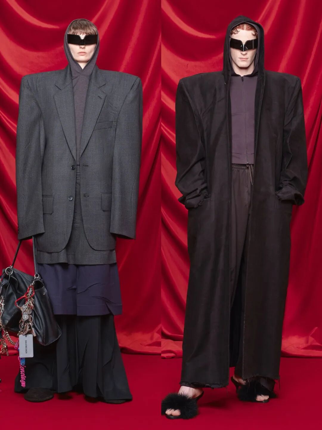 出场第一个造型是 Demna 的母亲 Ella,她身着一款经过升级再造制作而成的轻便大衣外套缓缓走来。她是 Demna 设计风格的最初灵感来源。这件大衣由 3 件经过解构和改造的复古服饰拼接制成,运用品牌标志性的剪裁技法,体现了一贯的风格态度。肩部未采用立体肩垫,却呈现出平整而笔直的肩部线条。整体版型宽松,同时加入褶裥细节,更有同款造型选用英国羊毛彰显裁缝精湛的制衣工艺。