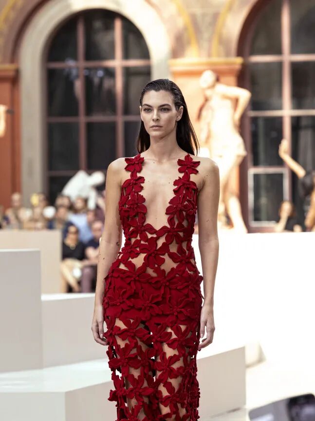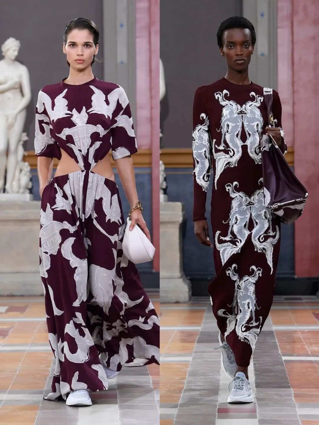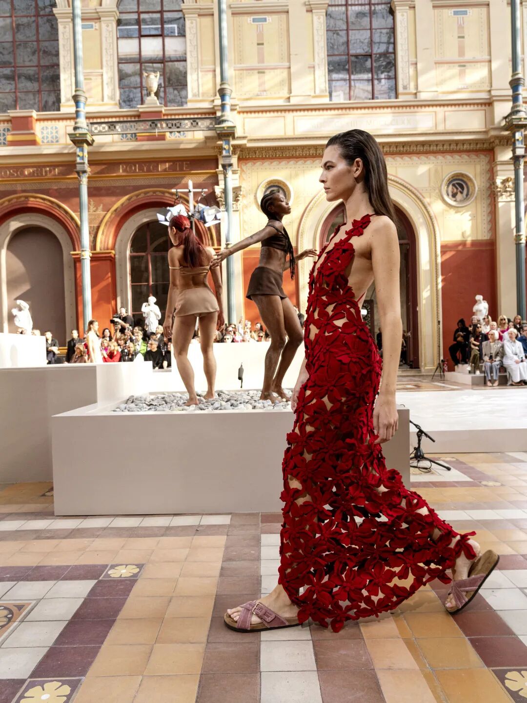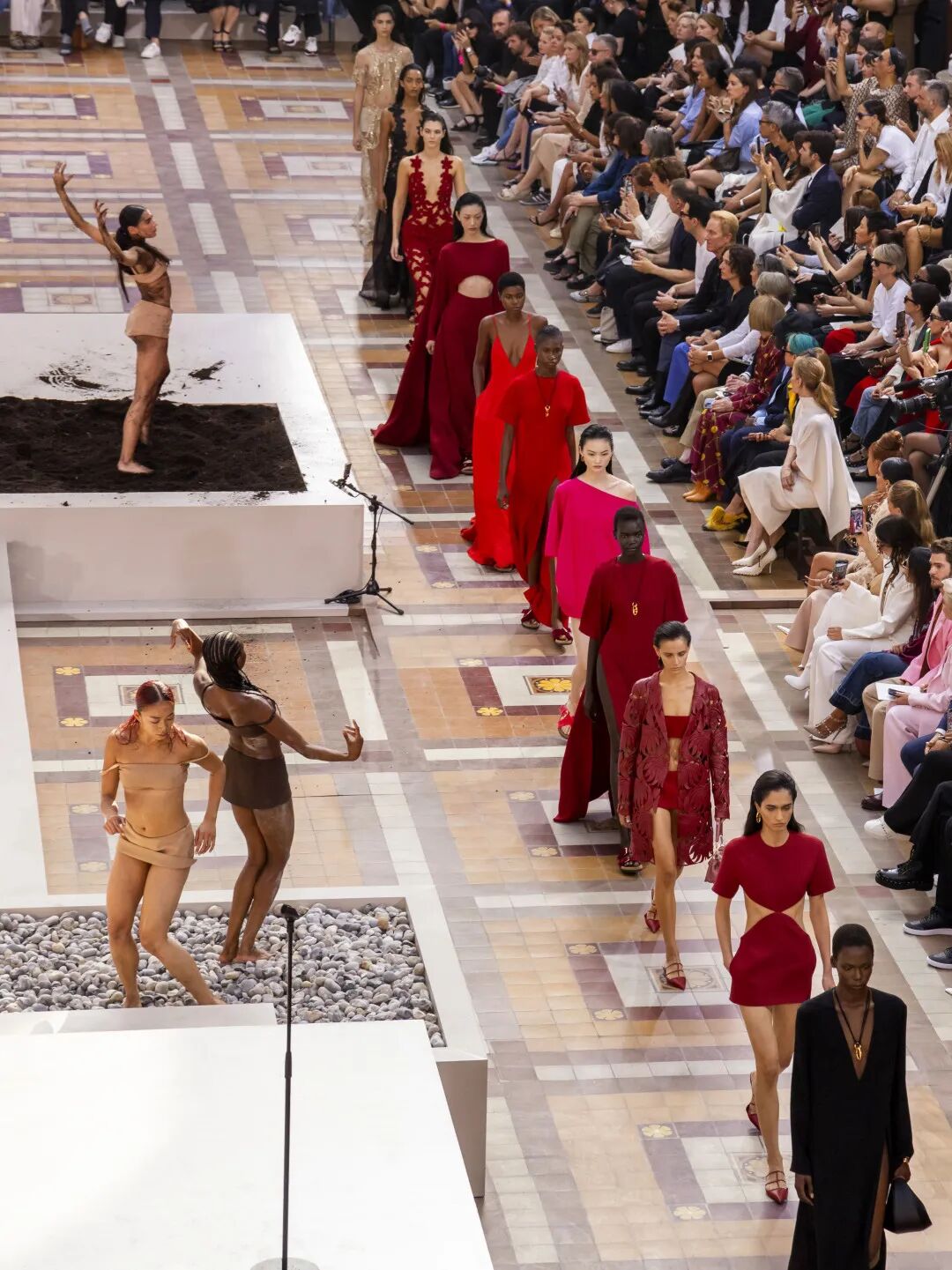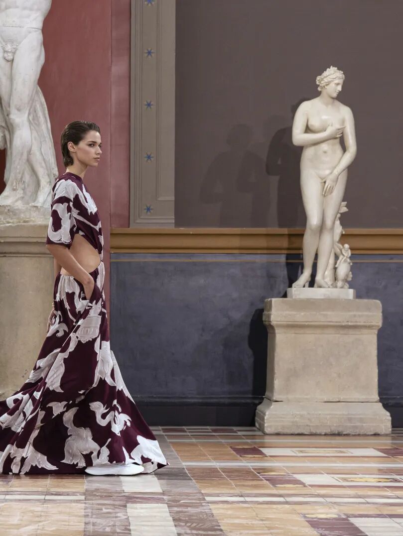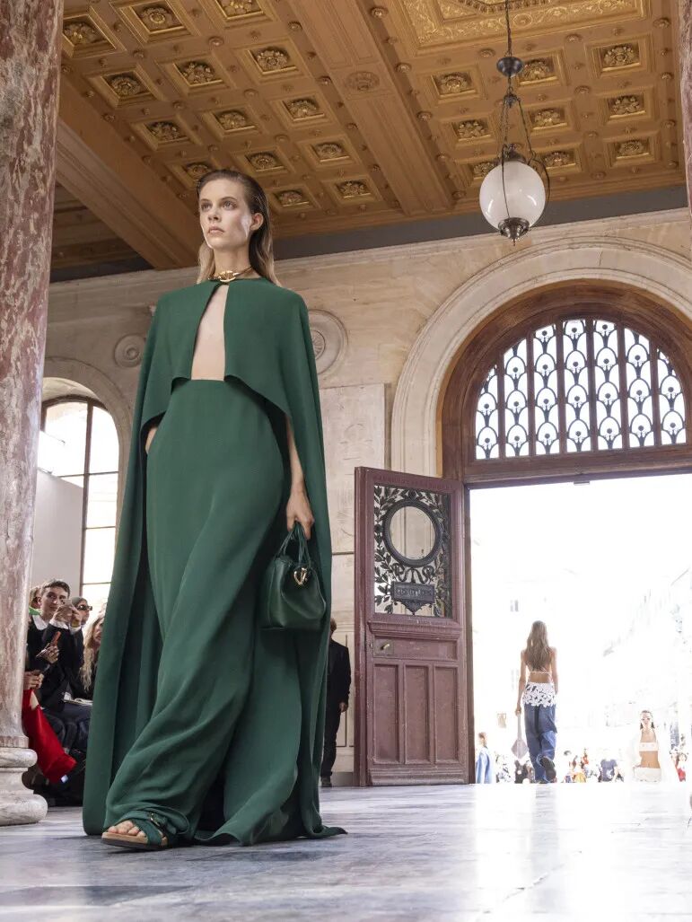 秀场选址于法国美术学院(École des Beaux-Arts)的 Cour Vitrée 玻璃庭院,这所历史悠久的艺术名校不仅曾经孕育众多名家大师,更是品牌创办人 Valentino Garavani 的起点,呼应这一季的主题。现场环绕着许多雕像,歌手 FKA Twigs 与众多舞者在舞台上翩然起舞,展开象征身体自由与庆祝女性之美的盛会。
