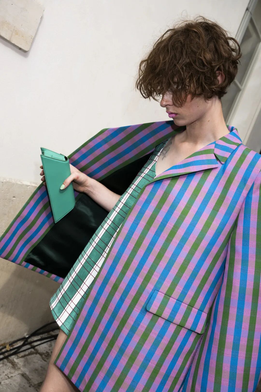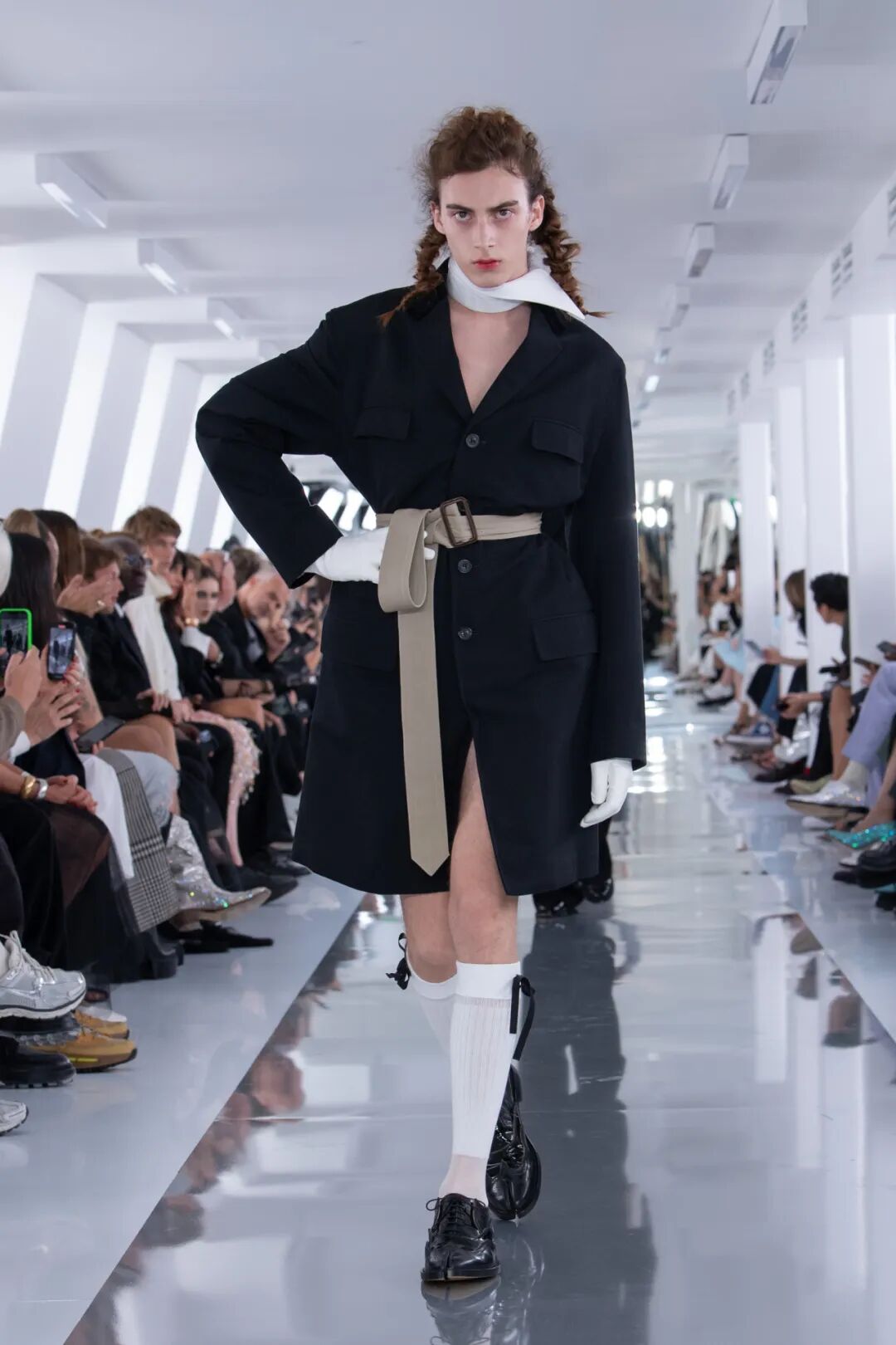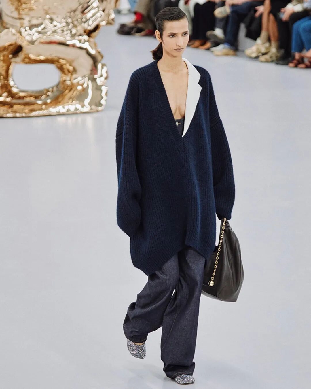 这一季,Jonathan Anderson 让服装回归到基本线条,把重点放在衣服的外观轮廓和比例上——极高腰的西装长裤,西装外套或是卫衣上被拉高的口袋位置,将大衣一边挂在手臂上犹如手拎包款,像茧一样的无袖套头粗针织罩衫,巨型大头针别在裤头上…给人带来混淆视觉的趣味感。