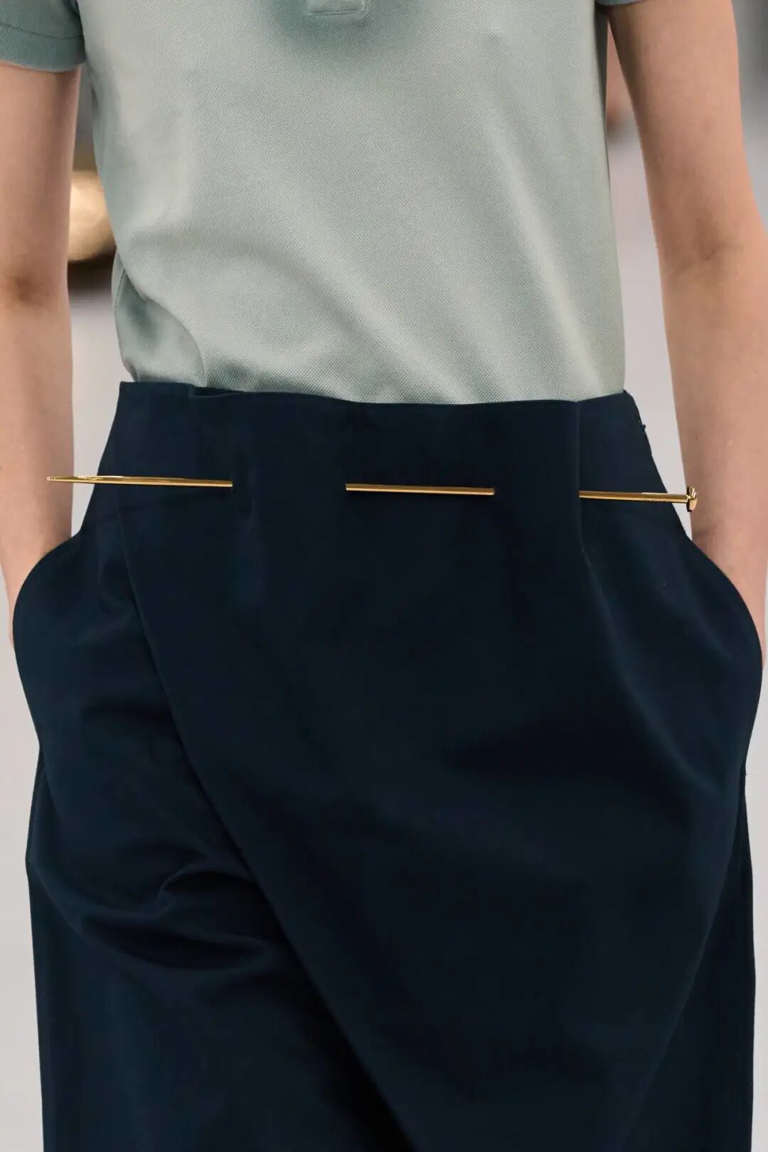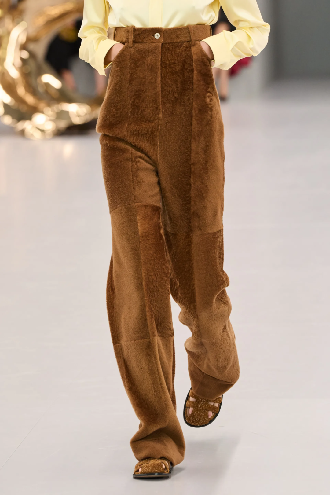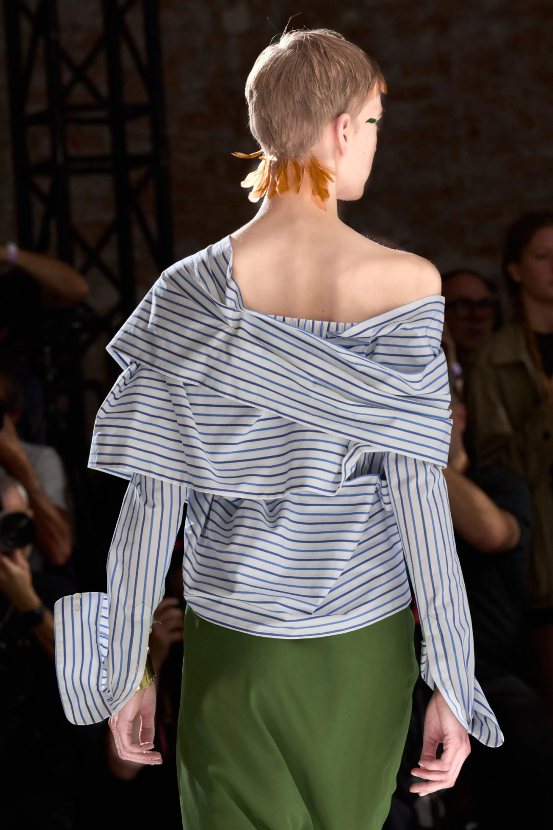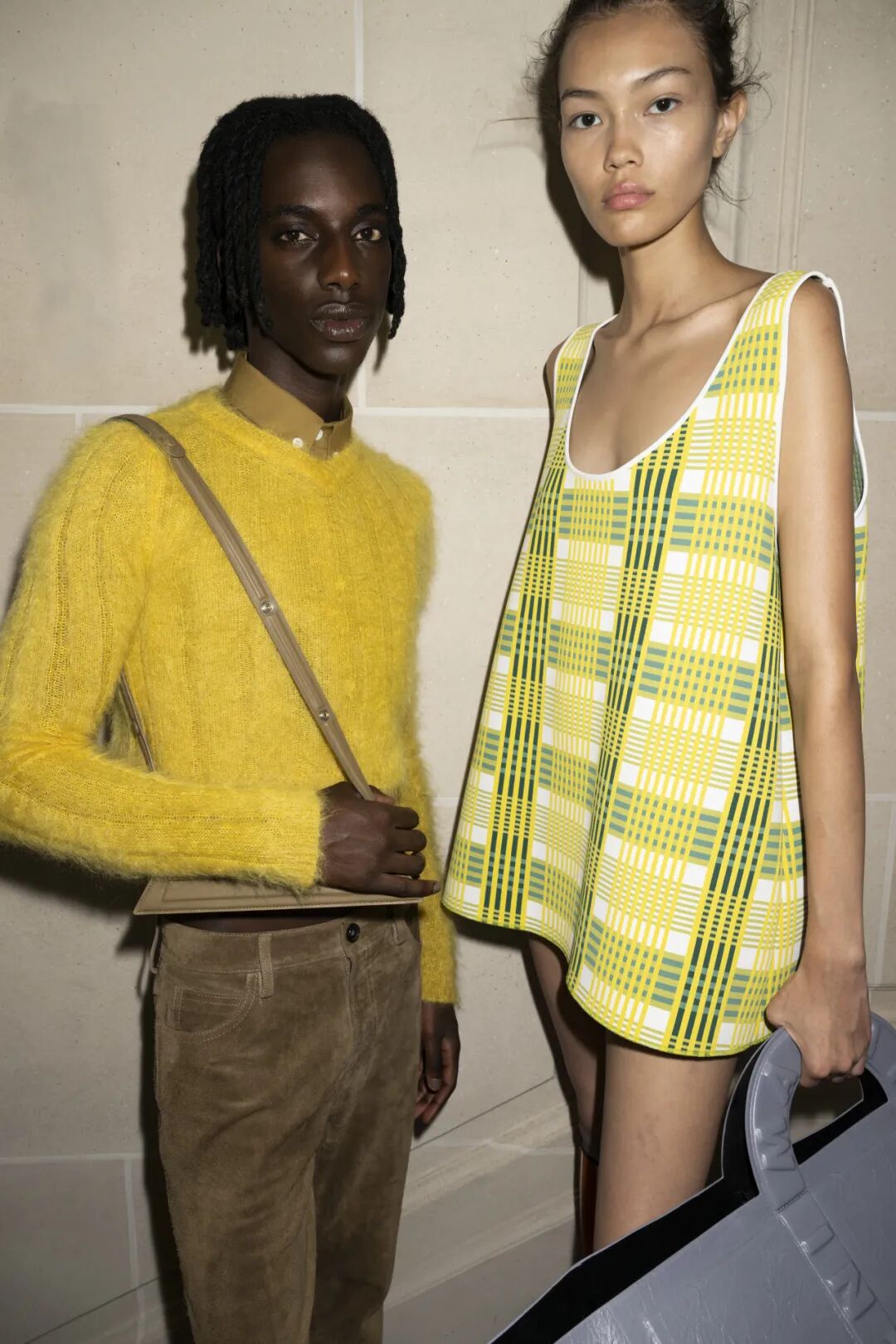 这一季,Jonathan Anderson 让服装回归到基本线条,把重点放在衣服的外观轮廓和比例上——极高腰的西装长裤,西装外套或是卫衣上被拉高的口袋位置,将大衣一边挂在手臂上犹如手拎包款,像茧一样的无袖套头粗针织罩衫,巨型大头针别在裤头上…给人带来混淆视觉的趣味感。