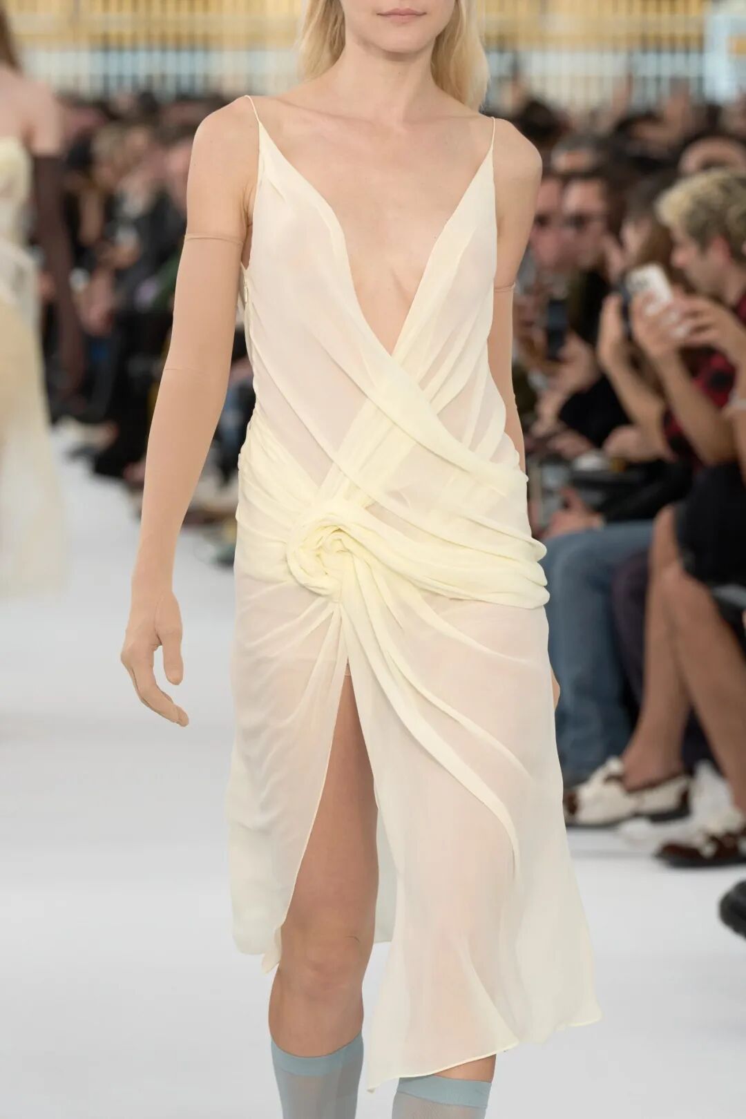 第二个 look 由 YVONNE 演绎,她是 Demna 在 Antwerp Academy 的教授。压轴造型由 Demna 伴侣 BFRND 演绎,演绎一件由 7 件 2000 年以前的婚纱经过剪裁、叠层和堆积拼接而成的全新礼服。