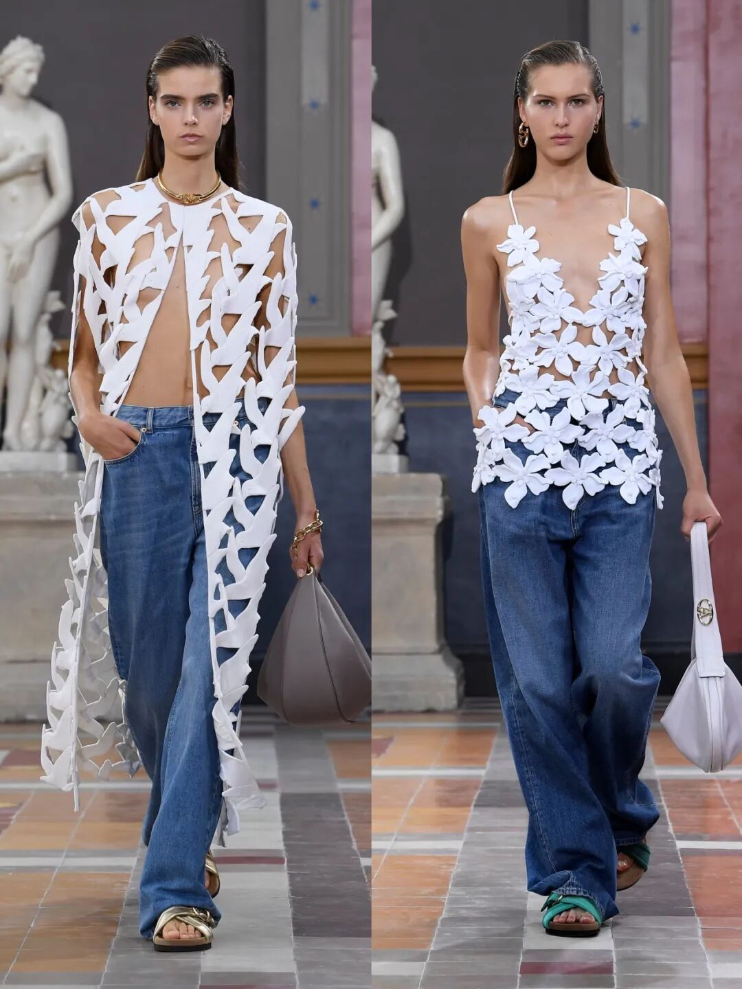 在一系列唯美的浮雕刺绣中,还穿插着一些简约的日常单品——T 恤、衬衫、牛仔裤,没有夸张的装饰与多余的线条,仅通过精致面料与剪裁,重新定义日常单品,着重于与身体接触的奢华触感。看似平凡的素 Tee,其实是由亲肤丝绸制成,寻常的丹宁与亚麻,则承载了精湛剪裁,柔软而富有层次感地呈现女性的率性轮廓,对于选择该系列的独立女性而言,这是一种内在的、个性化的表达。