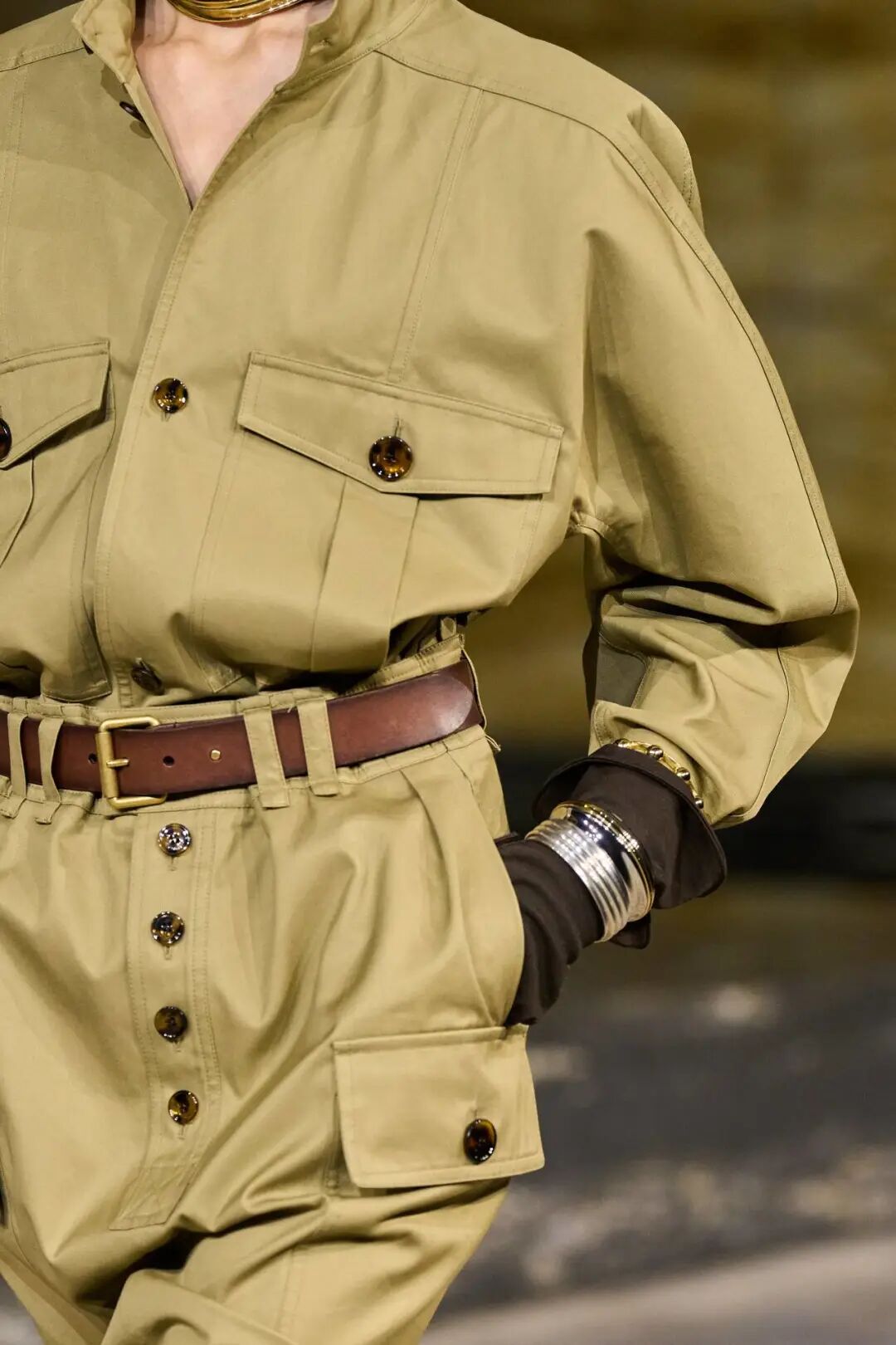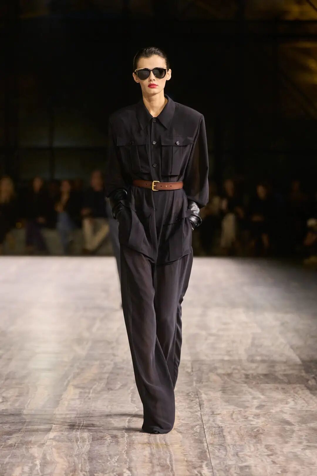 2024 春夏系列女装照例在巴黎埃菲尔铁塔下举办了新季发布秀,灵感来自 Yves Saint Laurent 先生 1967 年设计的革命性 “Saharien” 夹克外套,也是向美国女性飞行员 Amelia Earhart 与 Adrienne Bolland 致敬。