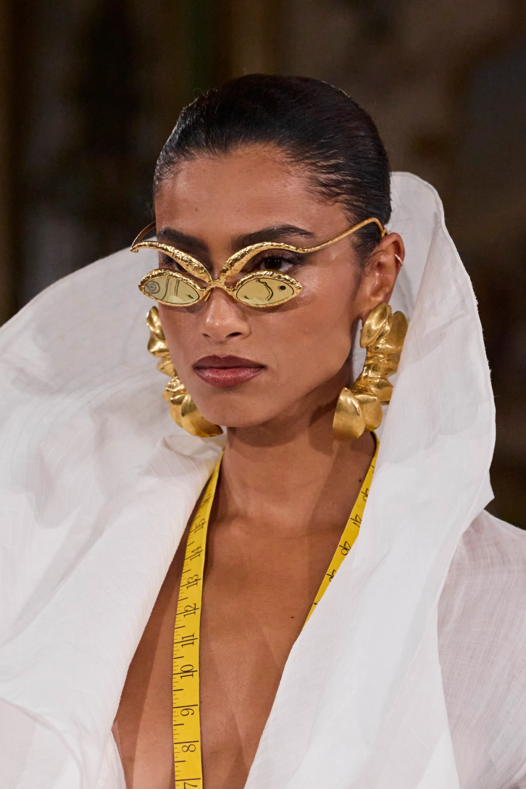 这一季,主角是时装上华丽抢眼的水生动物,龙虾、螃蟹、海胆、鱼骨...各种华丽有趣的配饰装点同样夸张的廓形剪裁服装。金灿灿的巨型龙虾项链灵感来自Elsa Schiaparelli 与 Salvador Dalí 在 1937 年合作的龙虾礼服,这次新系列将龙虾从二维变成了三维,绘制在礼服上的图案变成了“升级版”华丽饰品。