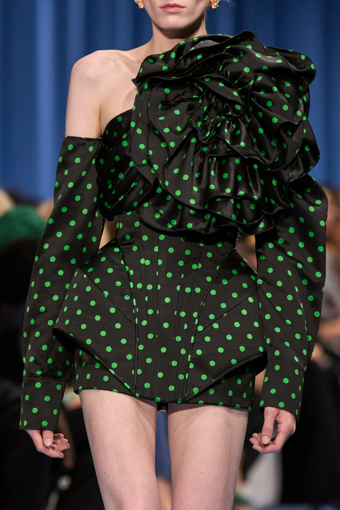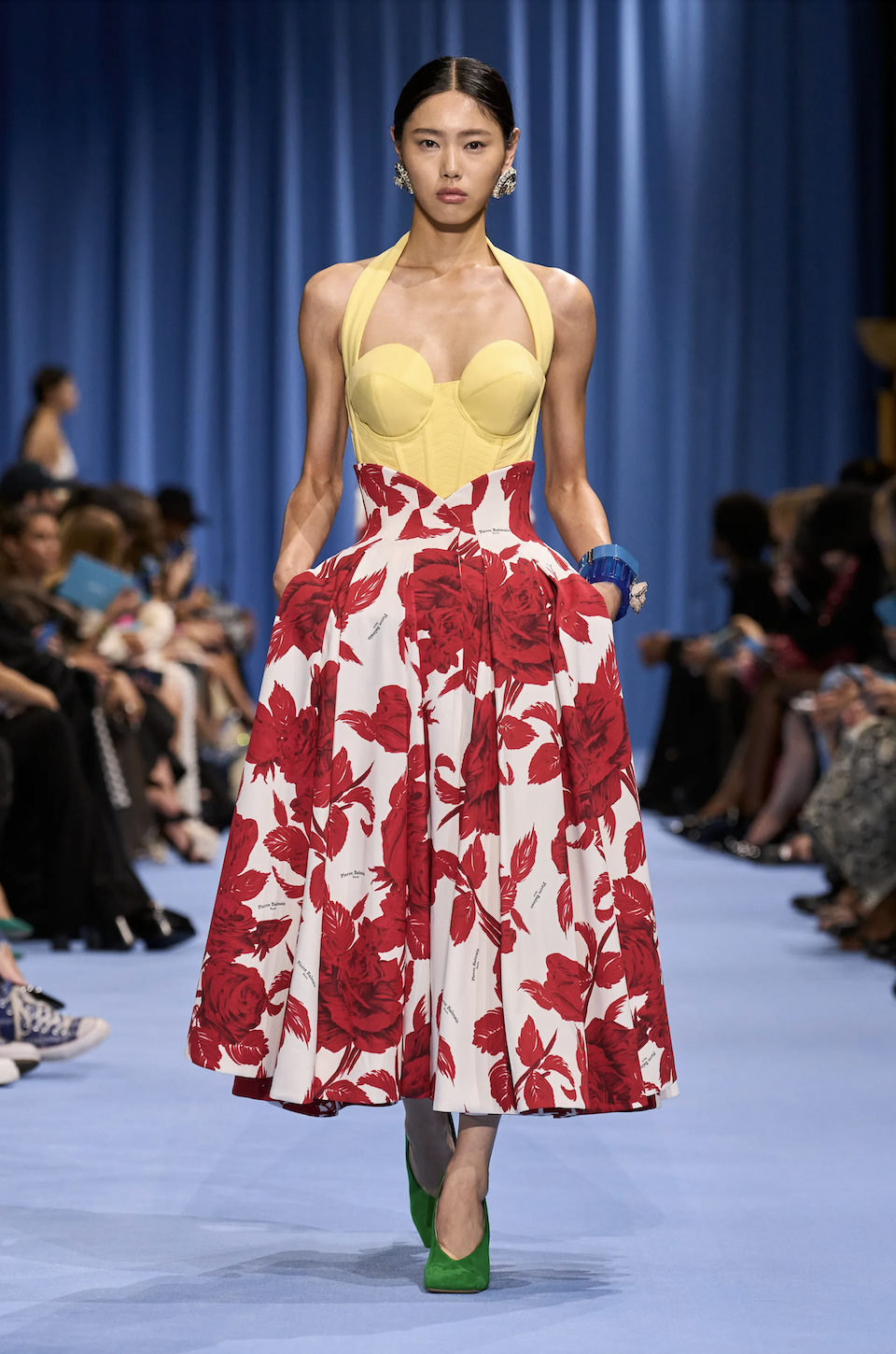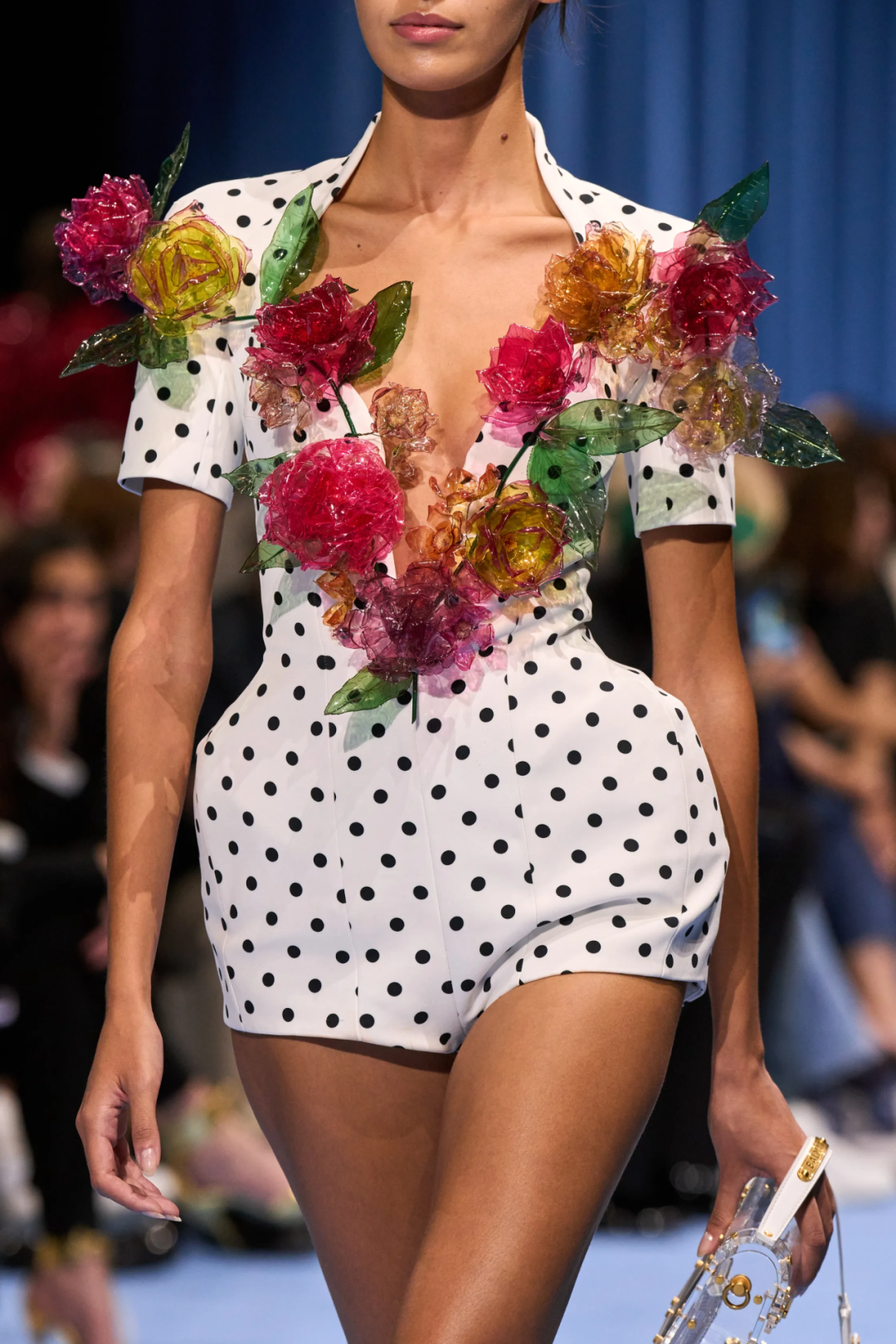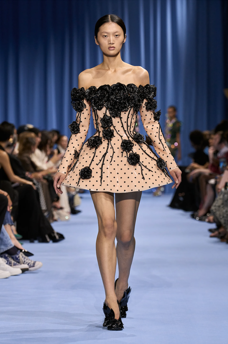 经典的玫瑰元素贯穿整场大秀,形态各异的 3D 花卉元素点缀在肩膀、手袋和裙摆边,演绎出生命怒放之美;立体的藤蔓、鸟类图案在连衣裙上栩栩如生,让 Balmain 的花园充满了生机;上世纪 50 年代风格的波点图案以及复古版型搭配缤纷的色彩,营造出宛如中世纪油画的美感...
