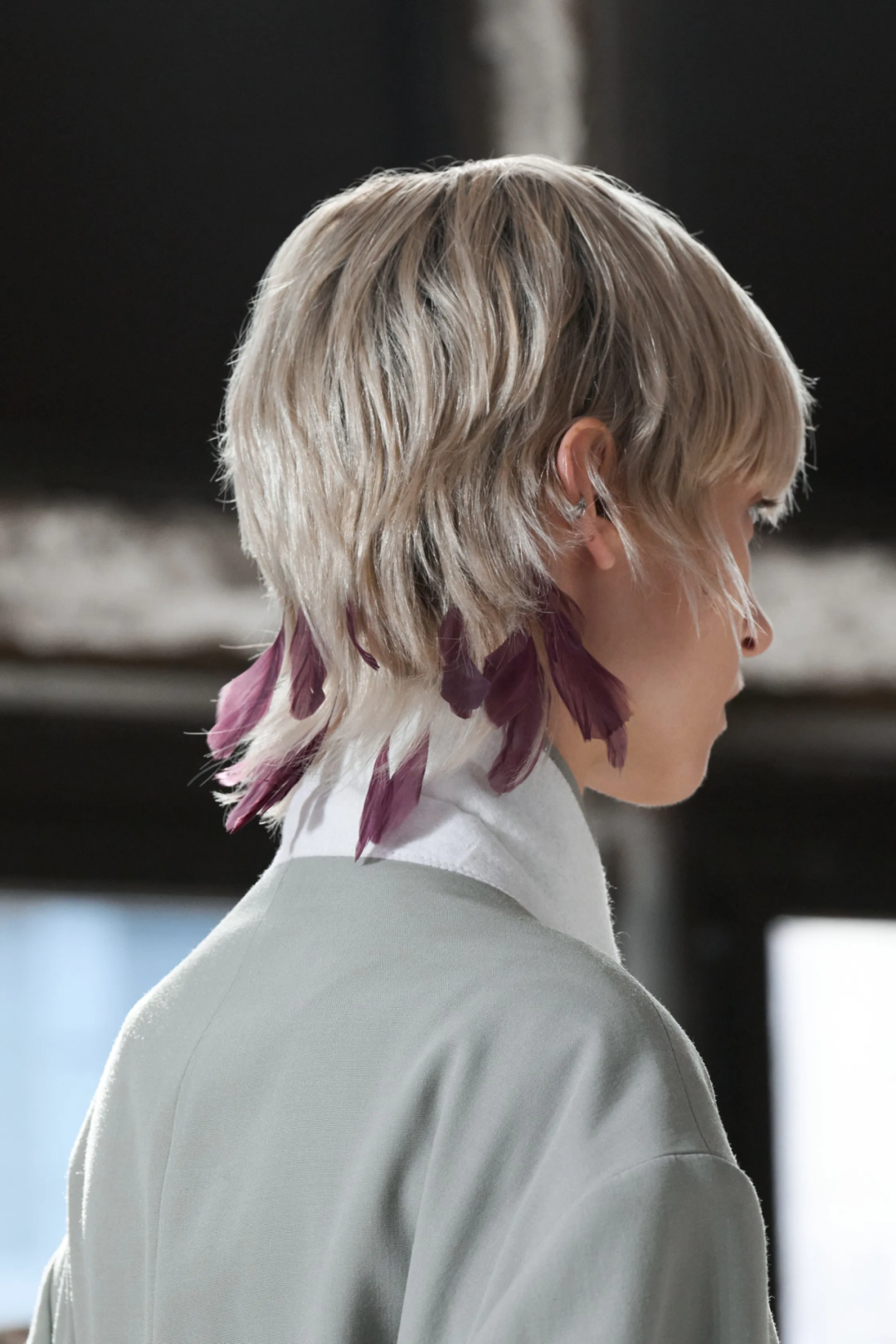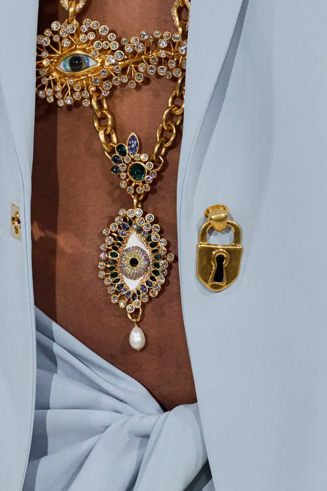整个系列的 look 以天空蓝、大地色、草绿色为主色调,充满春天的生机。服装简约有质感,搭配点缀在褶皱里的珠宝,发梢眼尾的羽毛...令人惊喜的设计都藏在细节里。