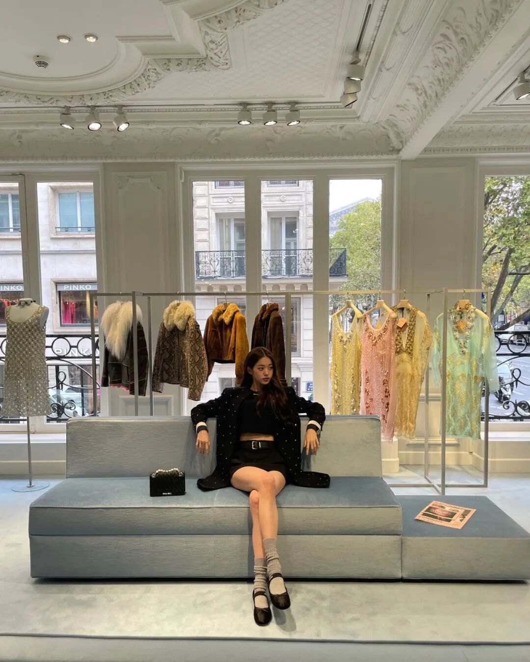 MiuMiu 少女张元英灰色短袜+黑色芭蕾鞋搭配了 mini 短裙,很有芭蕾少女的气质。