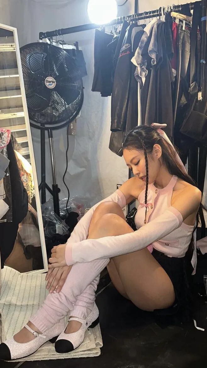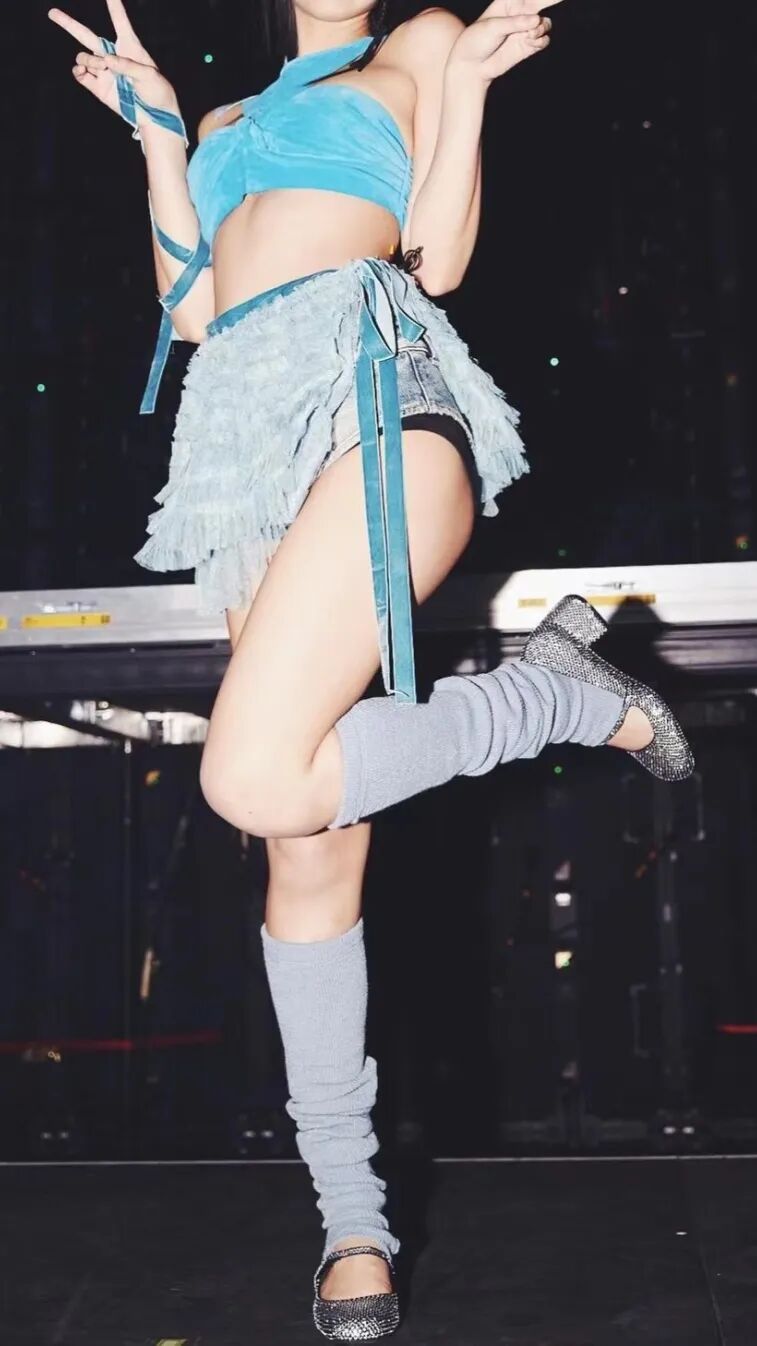 作为保暖又好看的配饰,也非常实用。Jennie 就坚持在巡回演唱会中,为每一个造型搭配同色系袜套,让芭蕾舞服那种精致、甜美感更加完整。