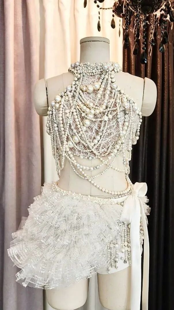 造型参考的是 Jennie 今年 4 月在 Coachella 音乐节的演出造型。穿的是韩国设计师品牌 Dénicheur 的定制珍珠套装,迷你蛋糕纱裙搭配白色袜套,俏皮浪漫。