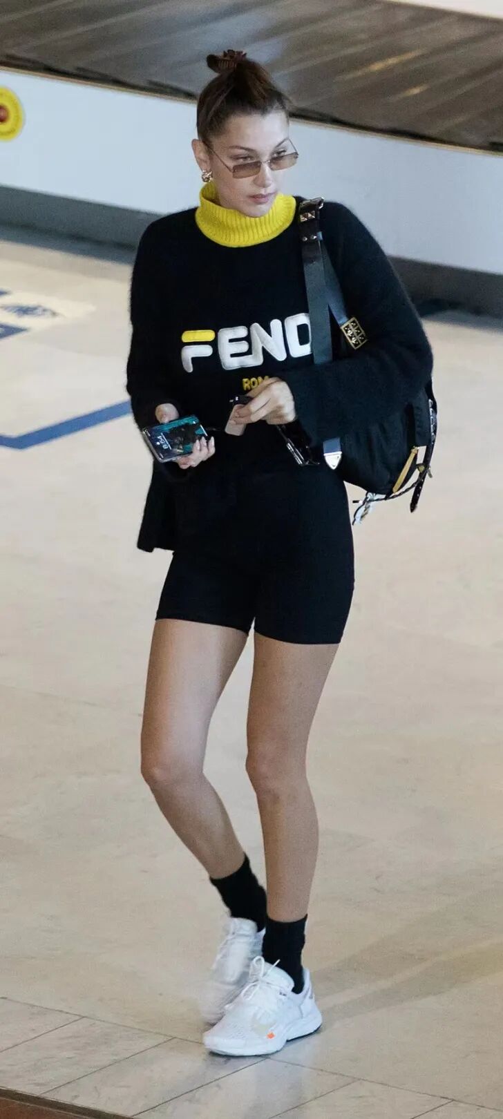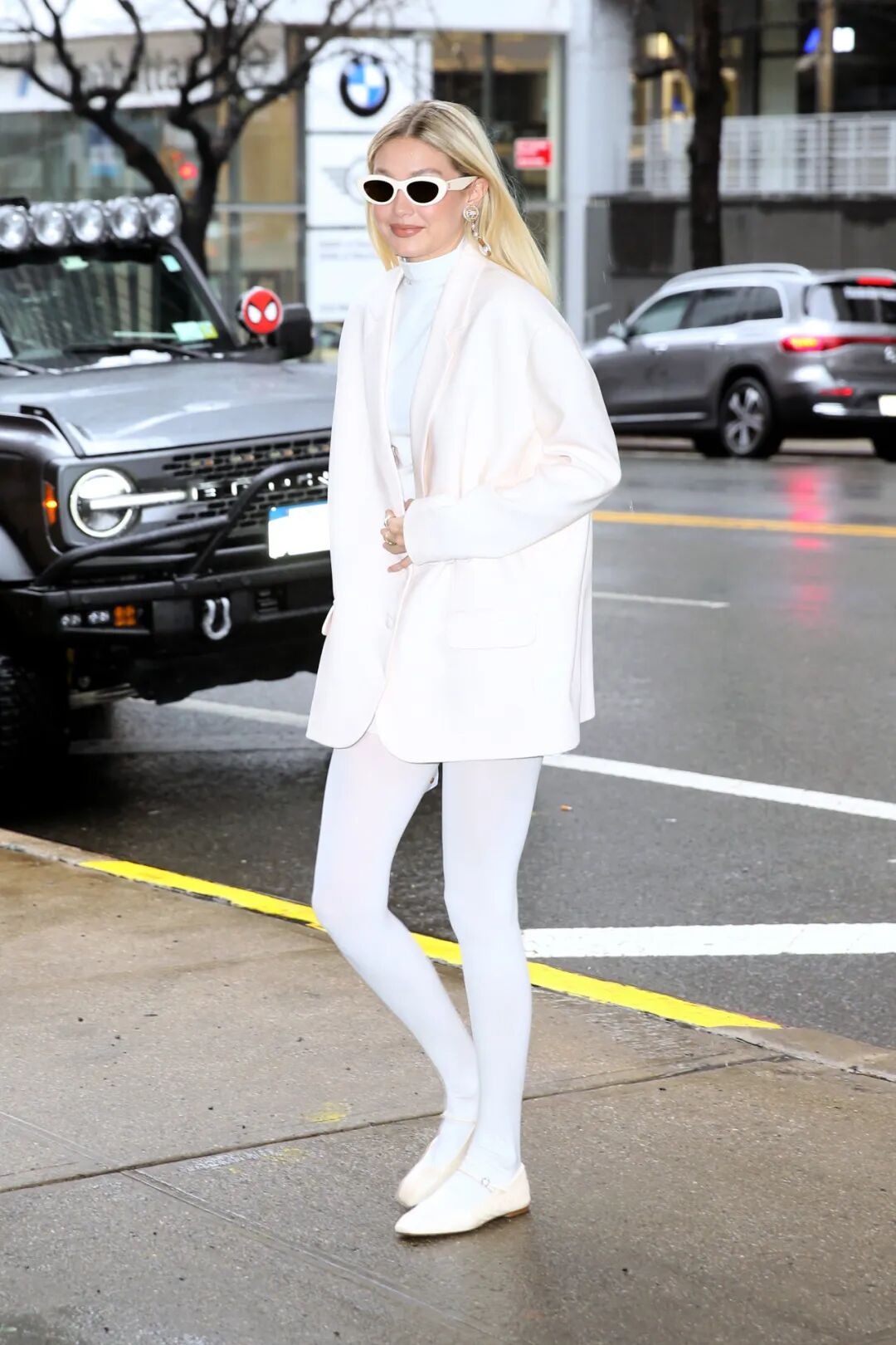 Gigi Hadid 这套 total white 本身就很优雅,白色裤袜搭配白色平底玛丽珍,“芭蕾味儿” 立刻就有了。