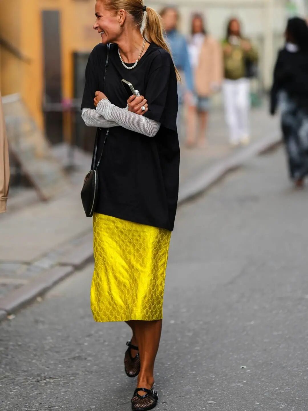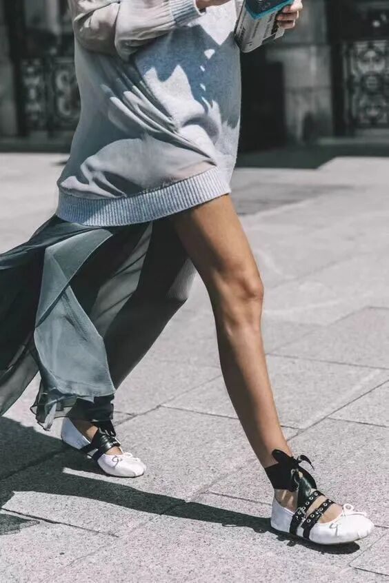 在最近一年的街拍中,芭蕾舞鞋的出镜率也相当高,搭配各种材质的长裙,增加浪漫气氛。