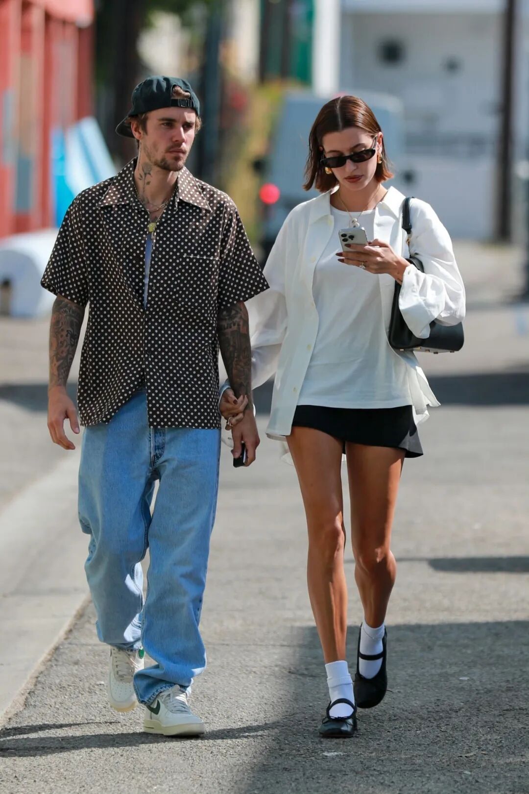 Hailey 最近和 Bieber 一起出街用白色短袜搭配黑色平底玛丽珍,用这组 “芭蕾搭配” 为整体造型增加了温柔与优雅。