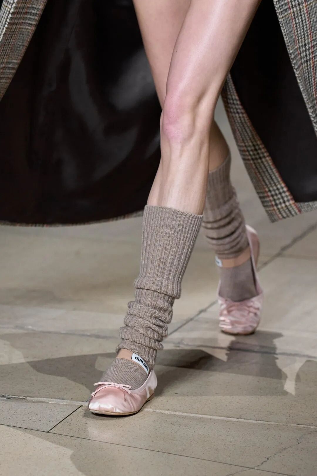 Miu Miu 秀场上示范了白袜+白色芭蕾鞋、鞋袜撞色的搭配,显然色彩反差强的穿法更时髦。