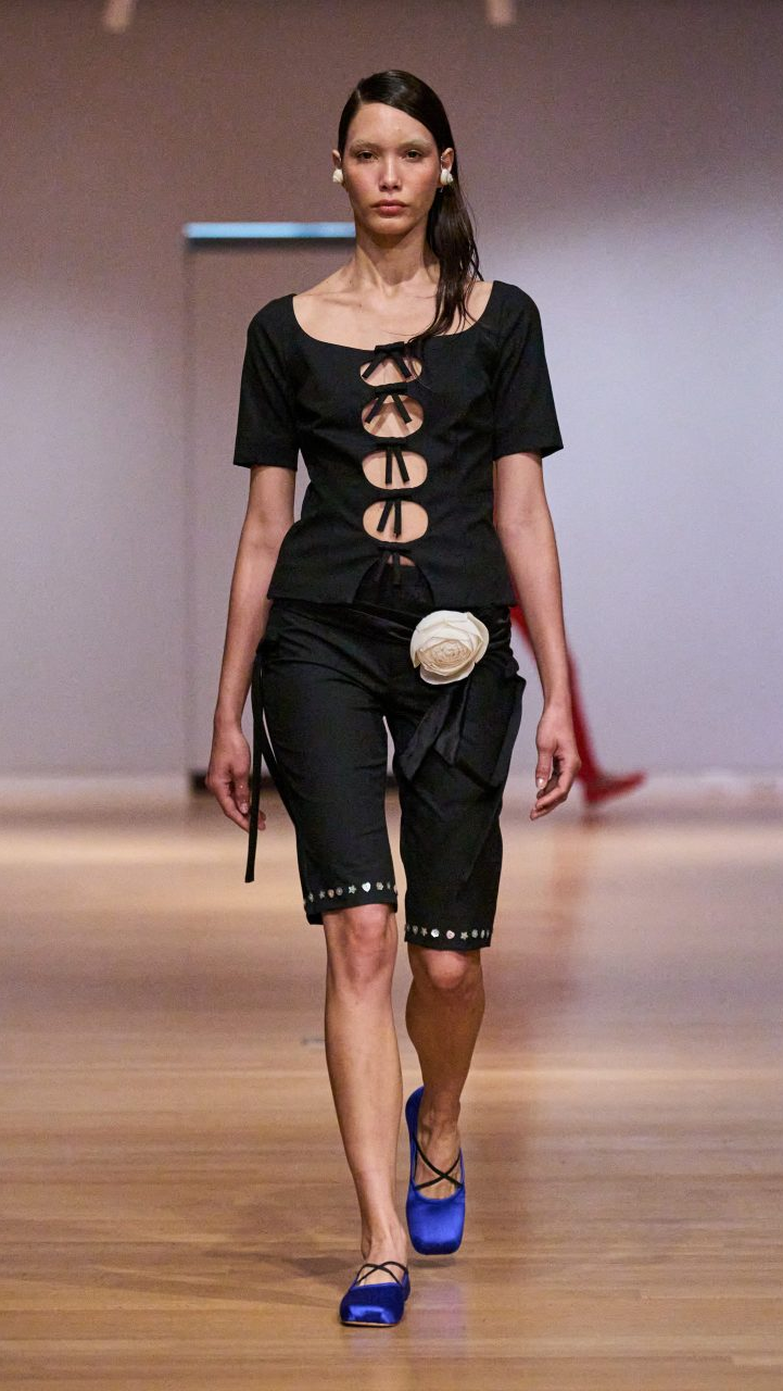 另一套黑色 look 走甜酷路线,露肩亮片刺绣上衣搭配黑色纱裙,黑色袜套搭配玛丽珍鞋,依然是精致的 Balletcore style。