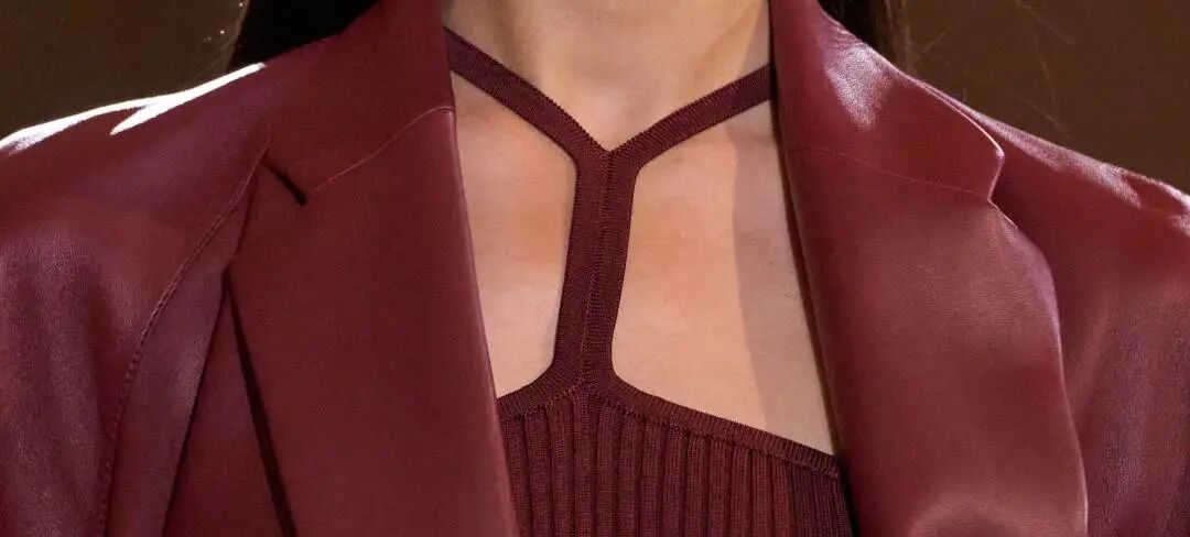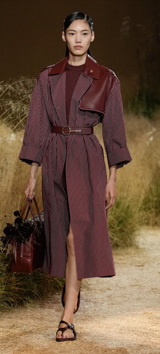 休闲风格的 Tattersall 格纹印花套装与皮革装饰碰撞,严谨的裹身半裙搭配针织与真丝上装,创意总监 Nadège Vanhee-Cybulski 让利落精致剪裁的皮革发挥出更多新风格。
