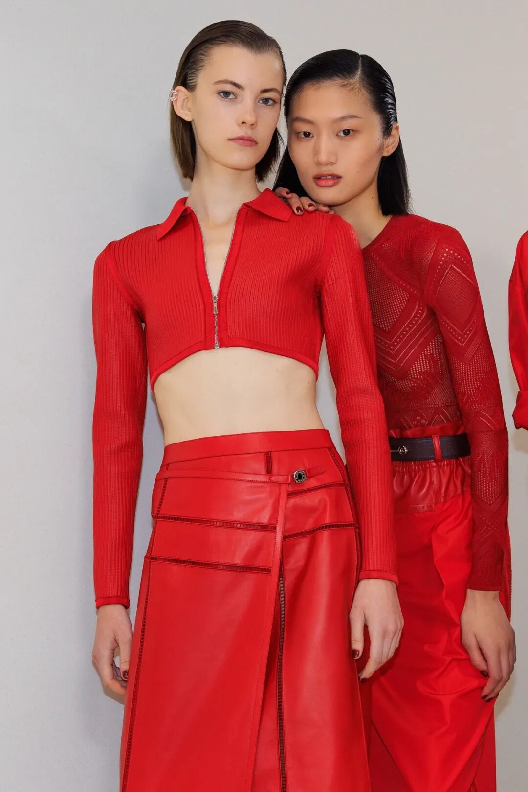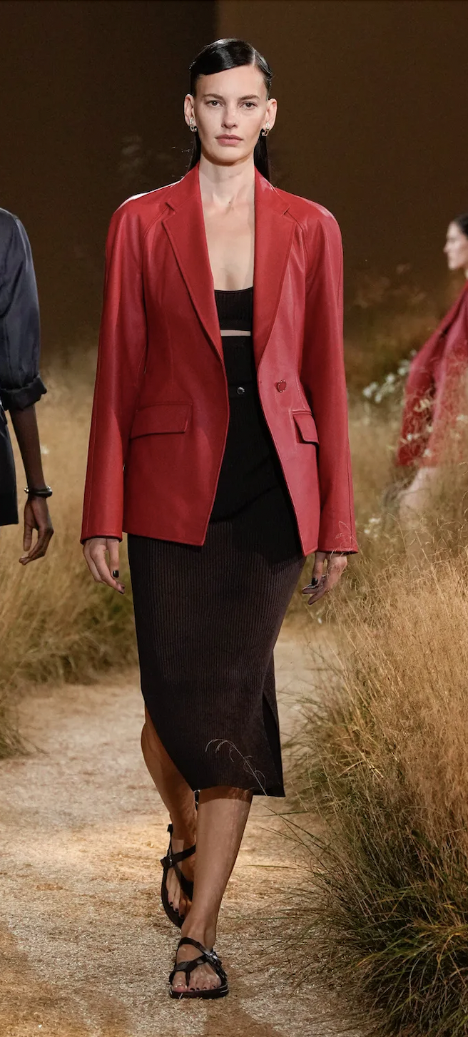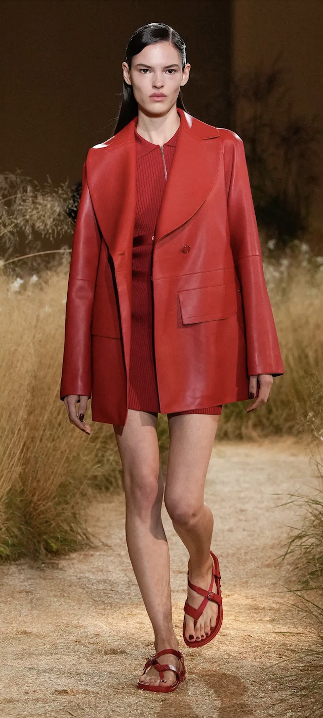 适合初春的皮革外套以红色系为基调,从深沉的酒红色风衣到活力番茄红西装,好像从寒冷过渡到万物复苏的春天。