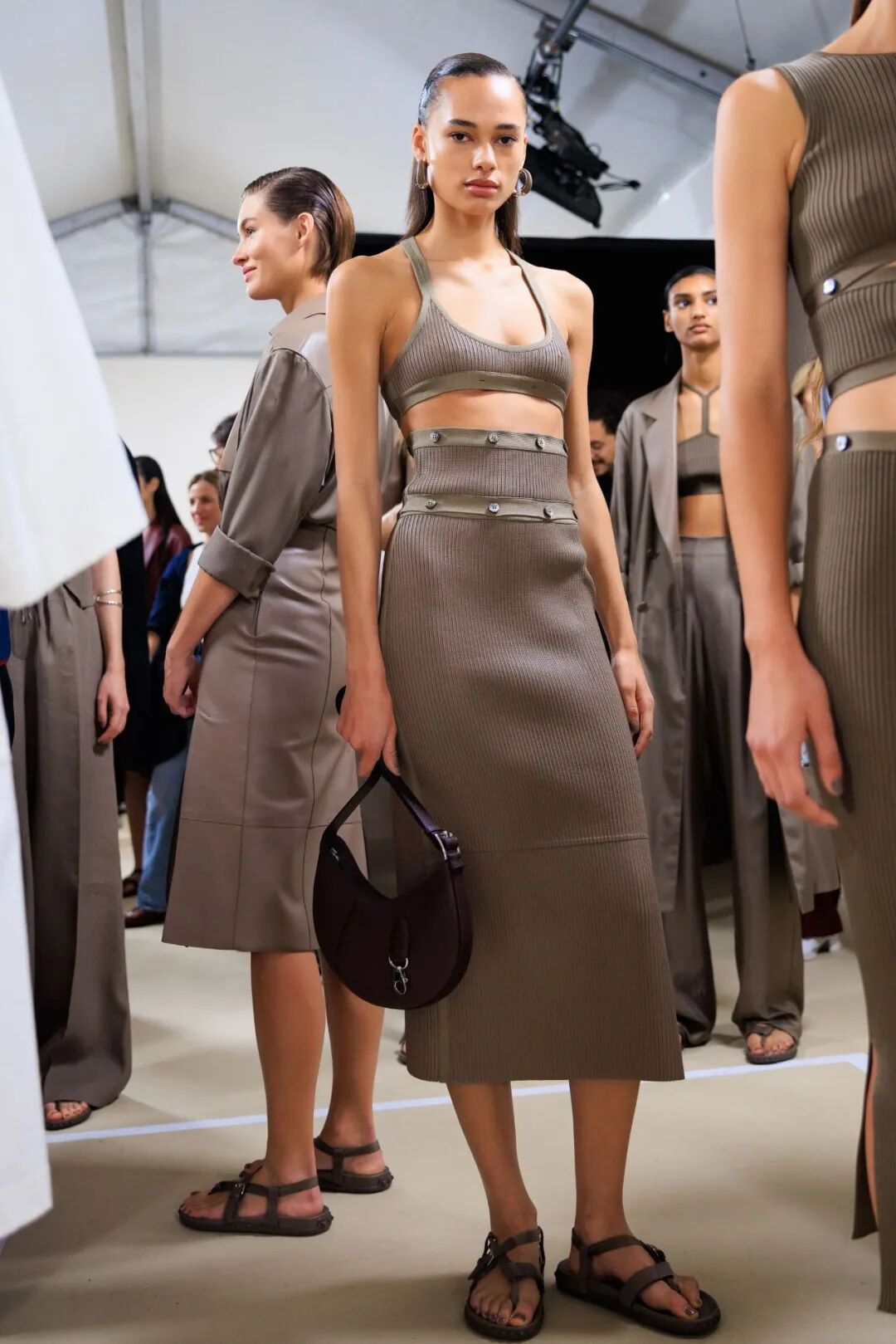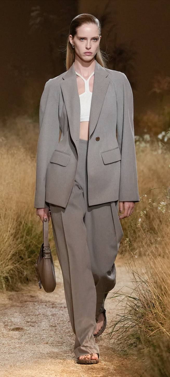 针织、皮革等不同材质与精致细节碰撞,大地棕、大象灰、暮光橙等自然的色调交汇,不同风格的单品搭配组合成轻盈的春日时装。
