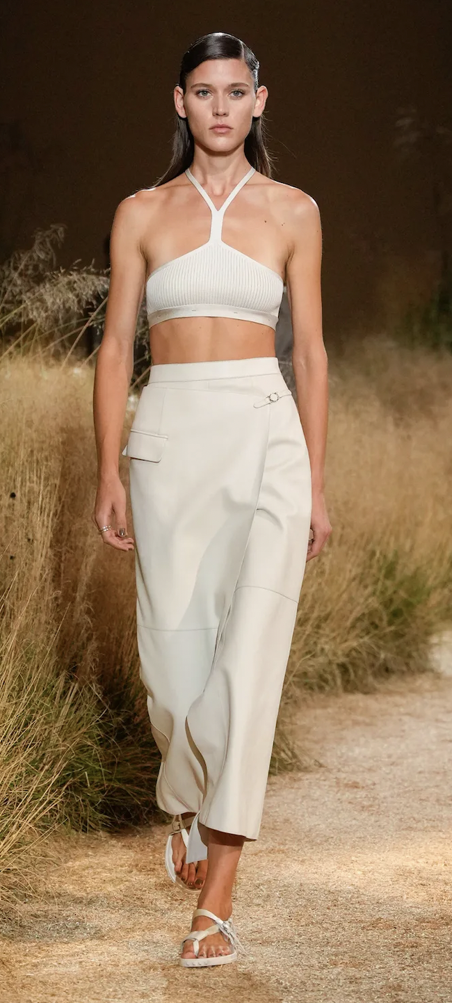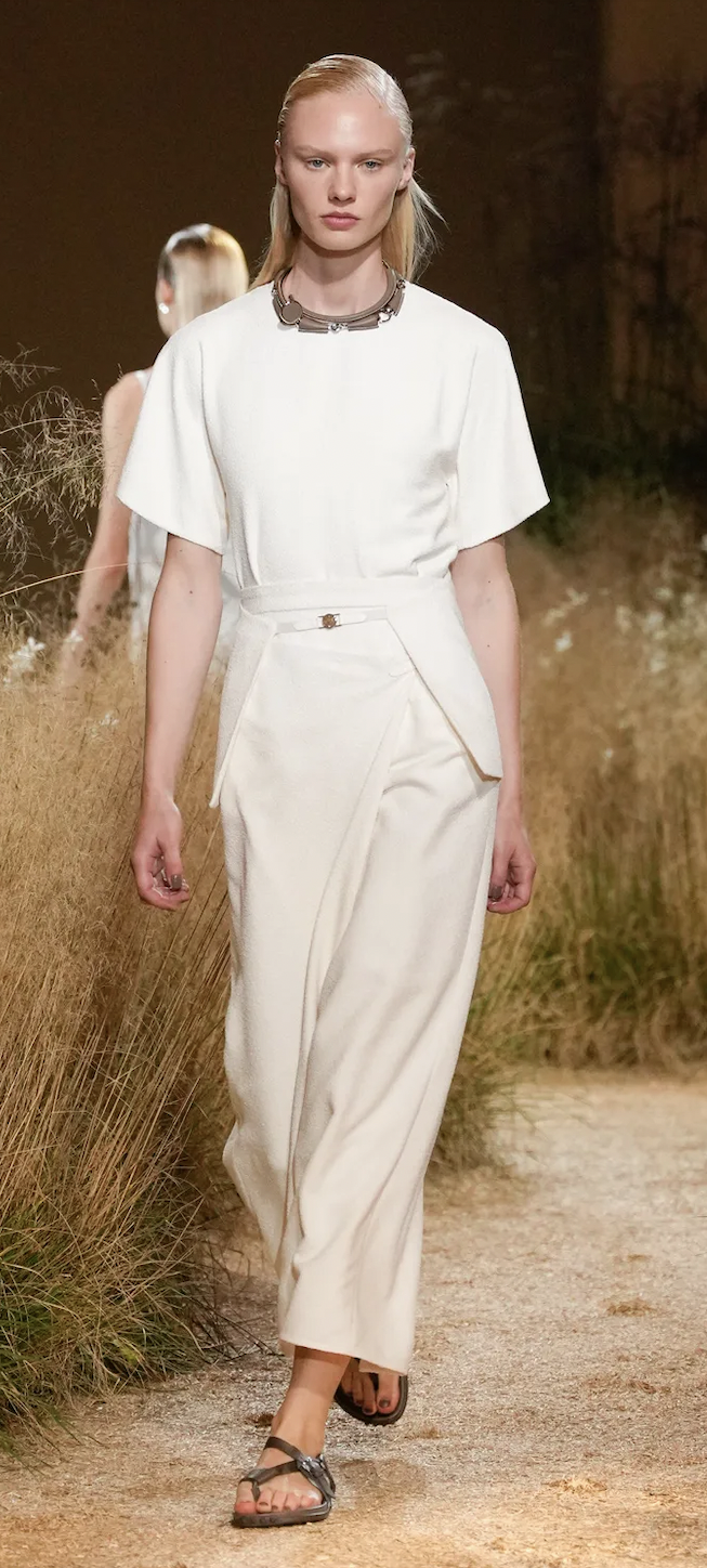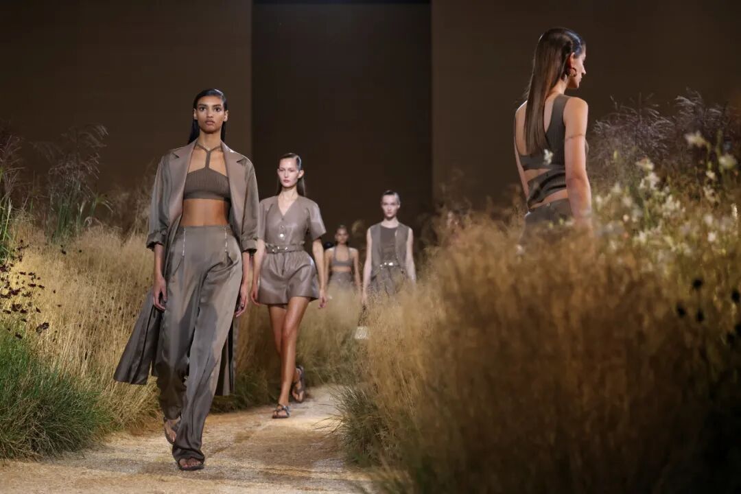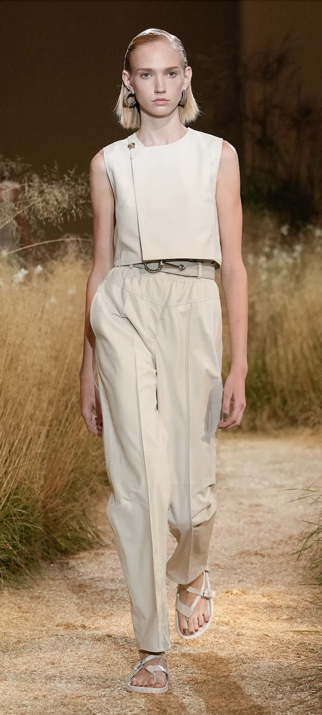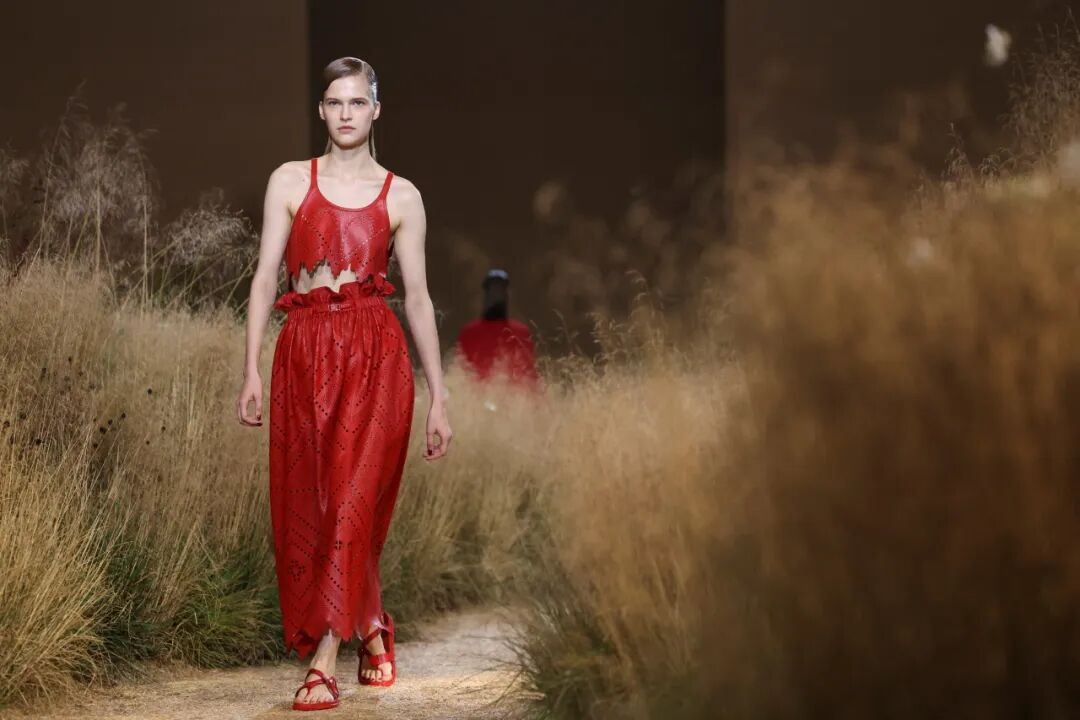 Hermès 2024 春夏系列秀场以春意盎然的自然田园为背景,萋萋芳草遍布全场。模特们穿梭于高草丛间的小径上。