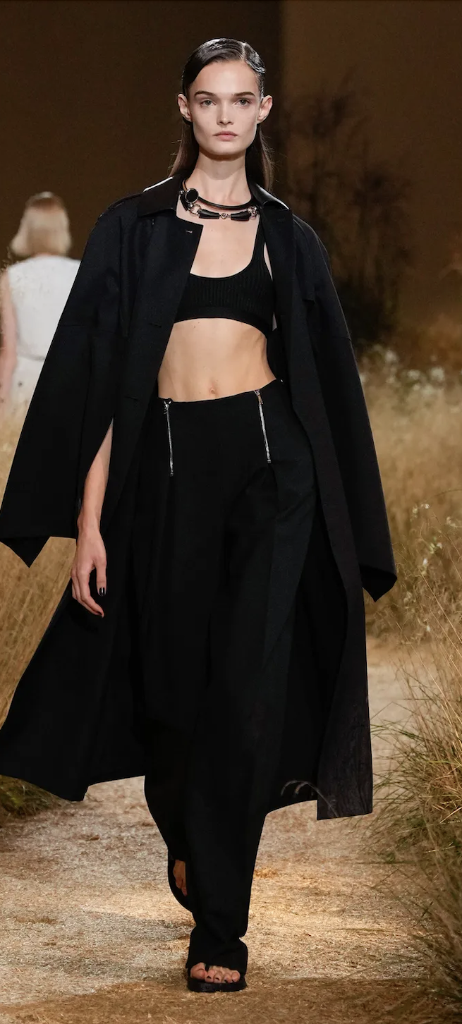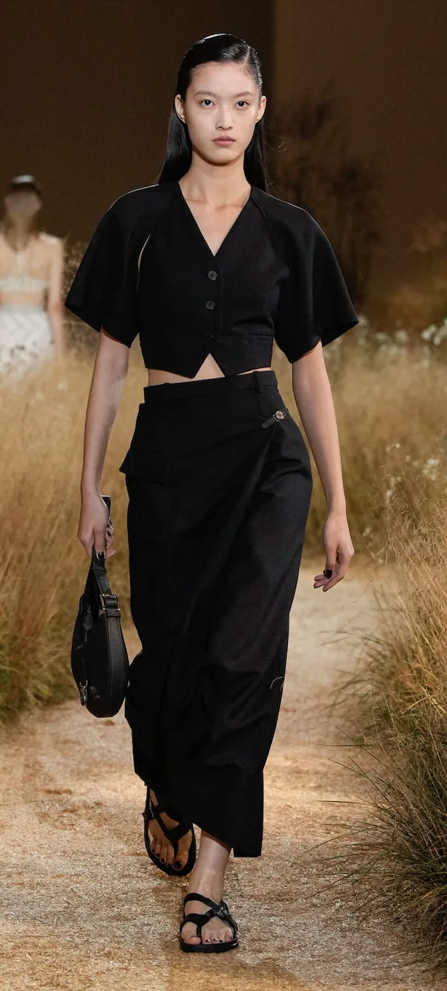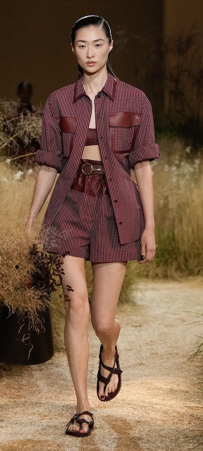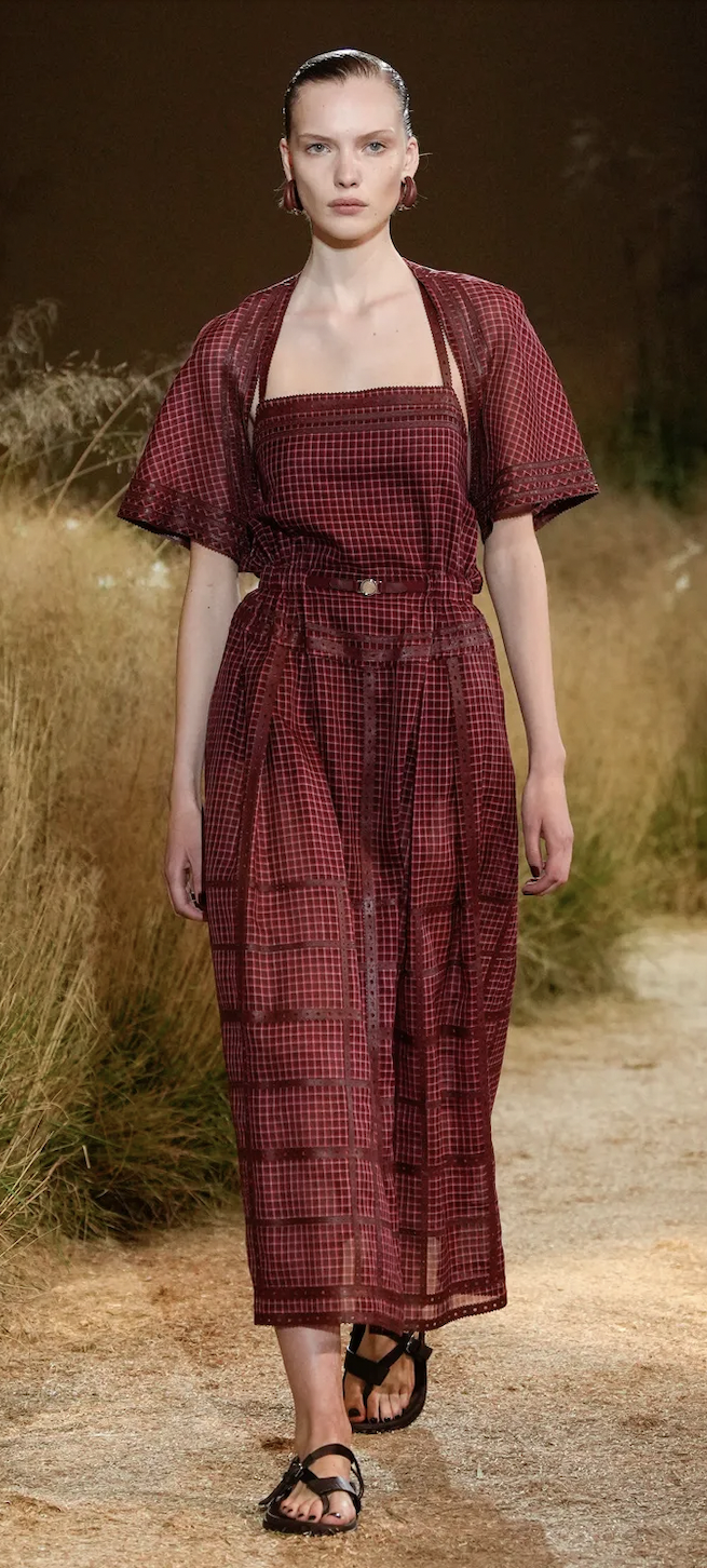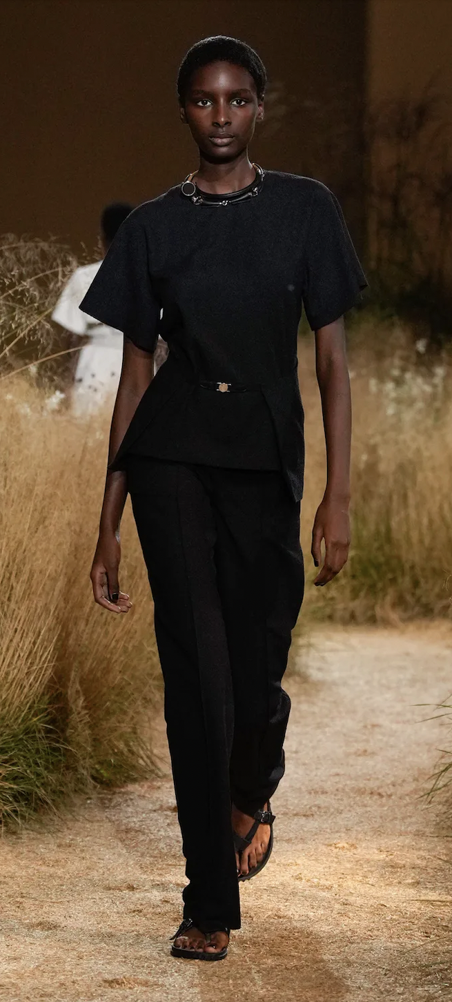 Hermès 2024 春夏系列秀场以春意盎然的自然田园为背景,萋萋芳草遍布全场。模特们穿梭于高草丛间的小径上。