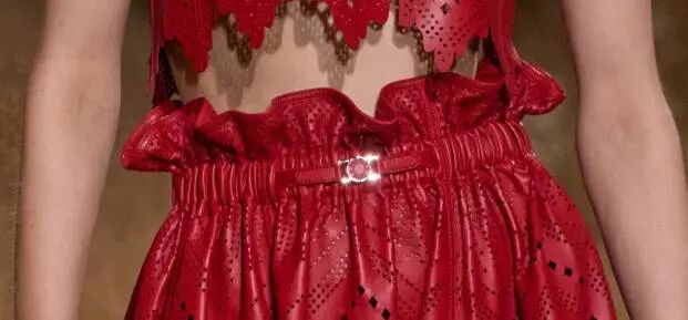 轻盈的皮革连衣裙像第二层皮肤一般舒适,英格兰的 broderie anglaise 刺绣技术融入皮革激光切割工艺,民族风情与严谨的都市职场风格相结合。
