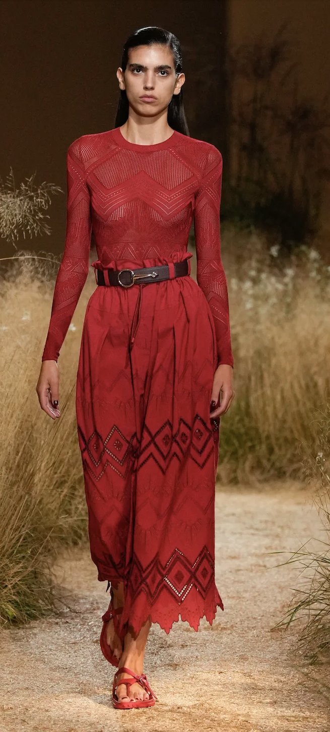 融入棉麻半裙之中的英格兰传统镂空印花是春夏穿搭中的精致细节,皮革腰带让整套番茄红沉静下来。