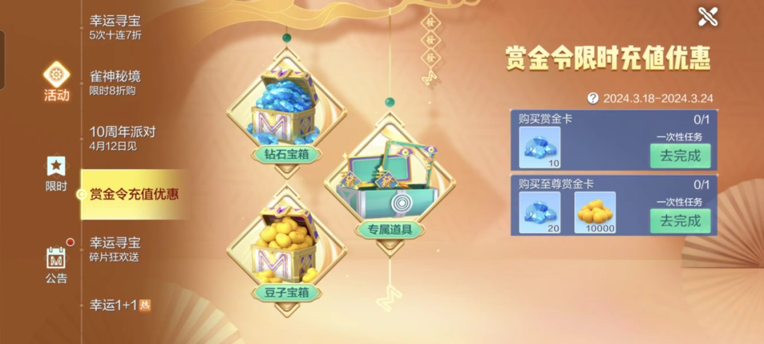 全新一期的赏金令活动已开启,麻友们现在购买赏金令还可以获得限时奖励。购买赏金卡可以在活动界面额外领取10钻石奖励,购买至尊赏金卡则可以在活动界面额外领取20钻石和1万游戏豆奖励。