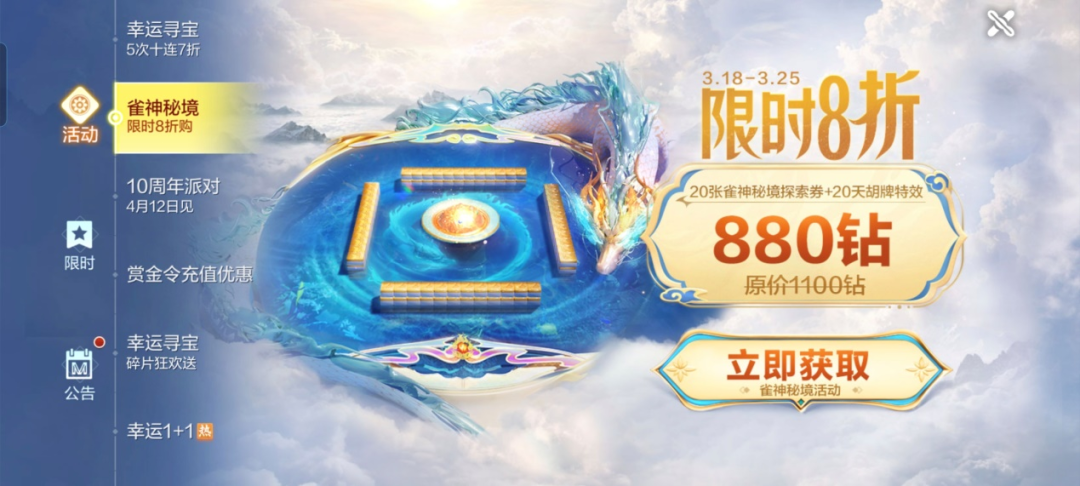 雀神秘境全新折扣福利来袭,超值8折礼包已正式上线,原价1100钻石的礼包,现在仅需880钻石即可获得,礼包内包含有20张雀境探索券和20天萌兔胡牌特效。另外麻友们首次十连探索雀神秘境,必定会获得天数雀境。