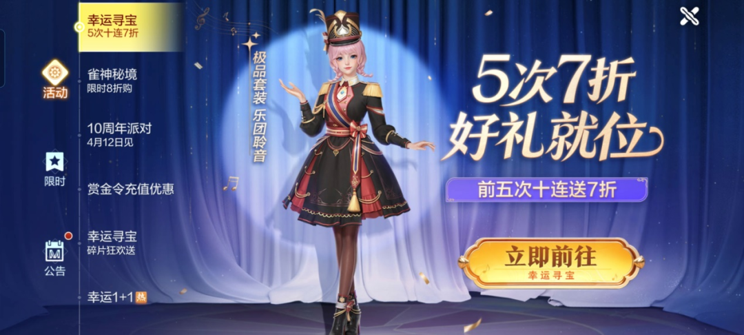 全新极品套装乐团聆音上线幸运寻宝活动后,前5次十连7折福利活动也已经再度同步上线,想要获得全新极品套装或其他永久奖励的麻友们,不要错过这一波超值折扣福利哦~而且现在参与幸运寻宝活动,首次十连必得极品道具!