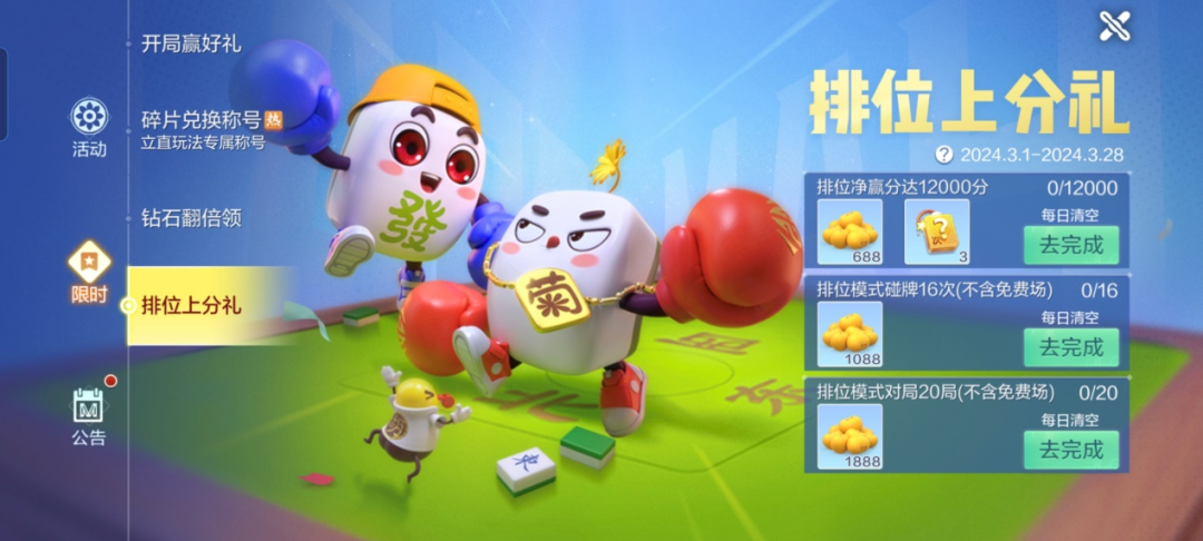 麻友们参与排位模式对局,完成相应任务,即可在活动界面领取丰厚的游戏豆、排位道具奖励。大家努力提升段位称号的时候,也别忘了去查看一下任务完成的情况哦~