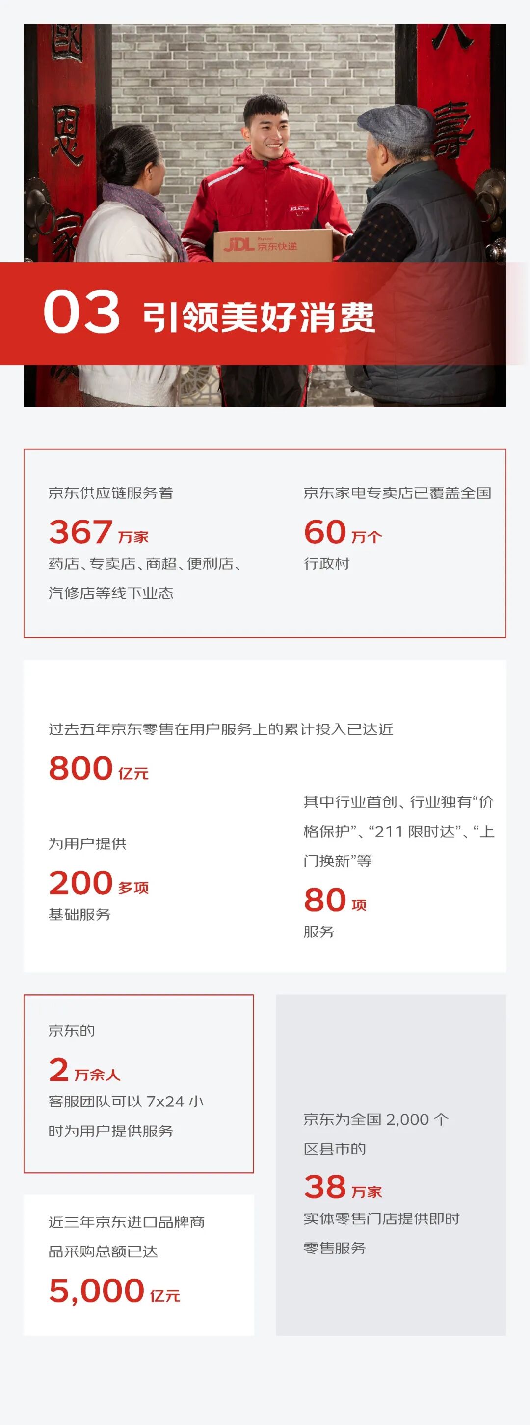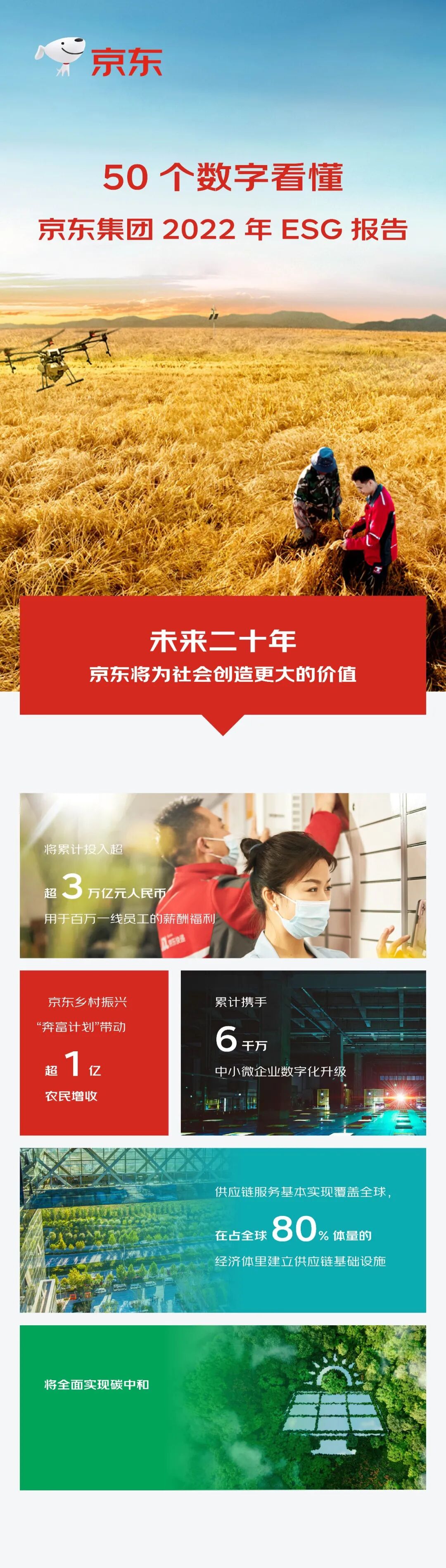 在实现这一梦想的同时,京东集团将在未来二十年创造更大的社会价值:将累计投入超3万亿元人民币用于百万一线员工的薪酬福利;京东乡村振兴“奔富计划”带动超1亿农民增收;累计携手6千万中小微企业数字化升级;京东的供应链服务基本实现覆盖全球,在占全球80%体量的经济体里建立供应链基础设施;并将全面实现碳中和。