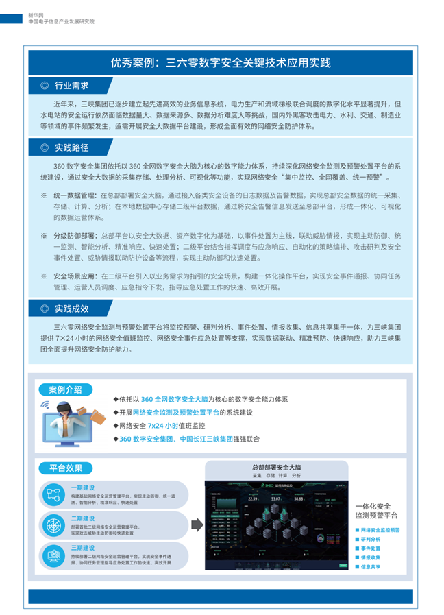 近日,新华网联合中国电子信息产业发展研究院发布《数字经济和实体经济融合发展报告(2022)》,评定数实融合典型实践案例,为政府、企业、行业组织提供可落地的经验借鉴,切实推动数实融合深入发展,360数字安全集团联合三峡集团打造的数字安全关键技术应用实践成功入选,为能源行业数实融合发展提供高效参考范式。
